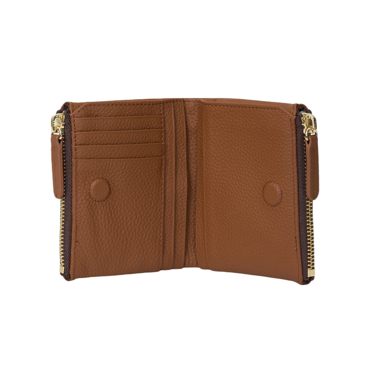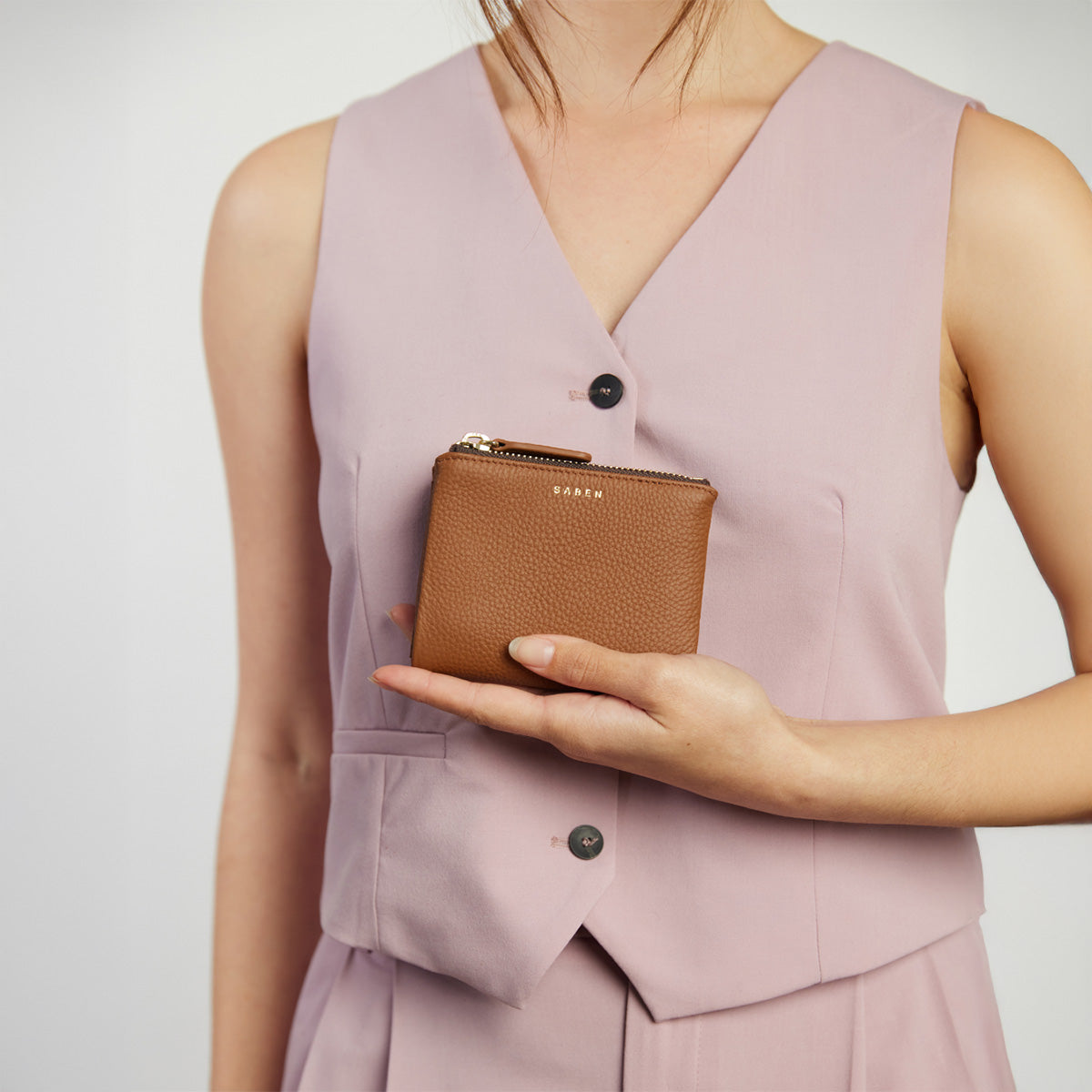 Details: Eight card slots; four drop pockets; note pocket; zipped coin pouch; gold-plated hardware