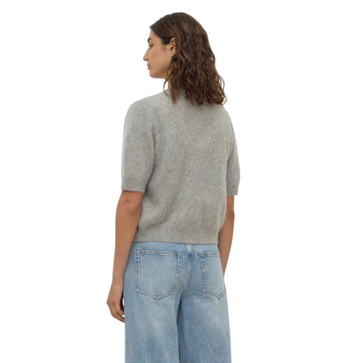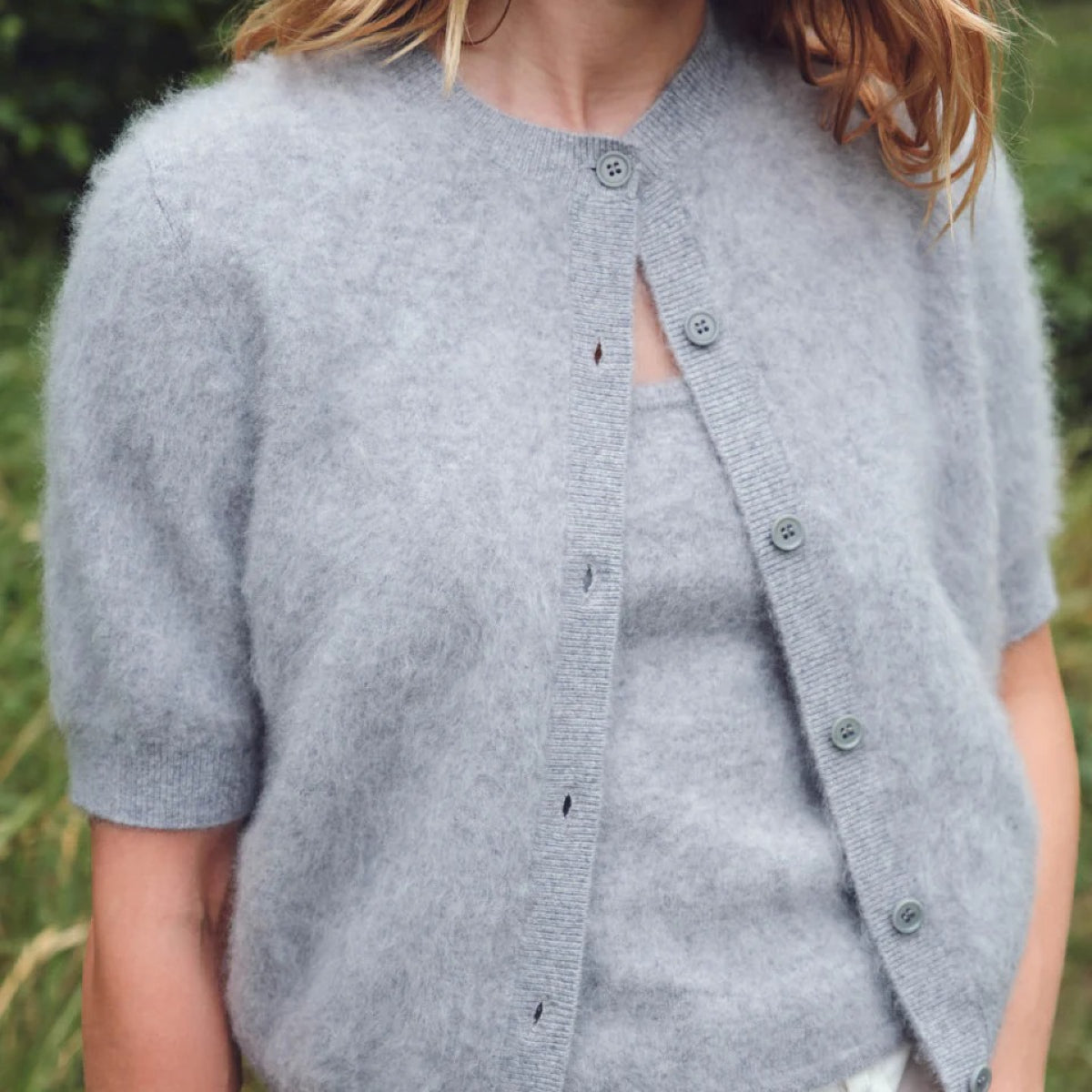 The Carina Wool Short Sleeve Cardigan in grey marle is a 100% wool cardigan with a crew neck and slightly cropped length.