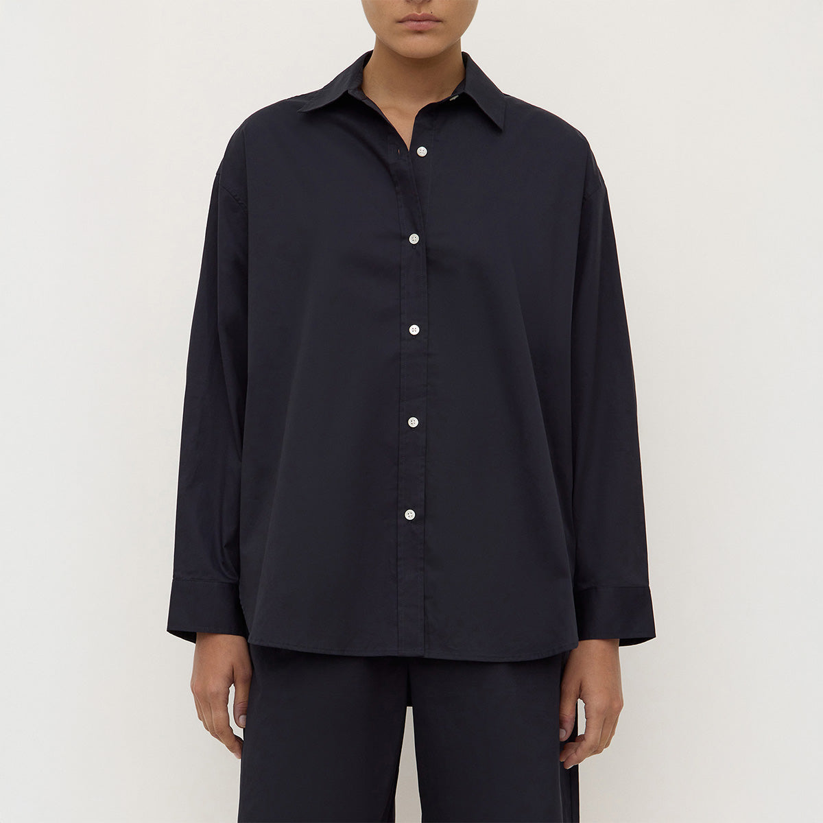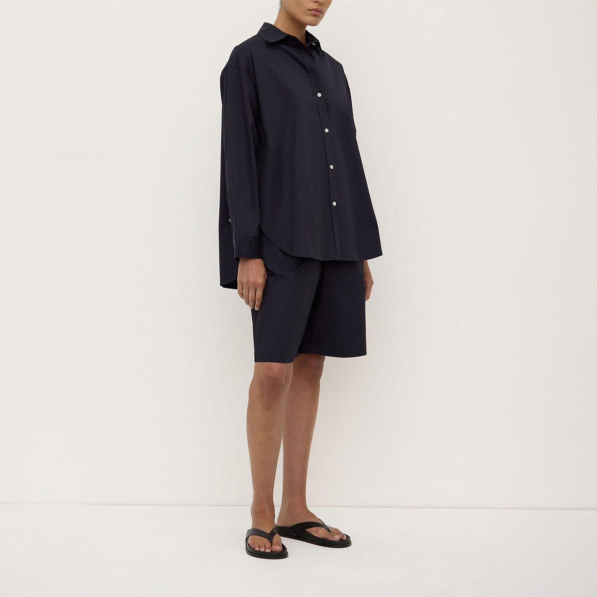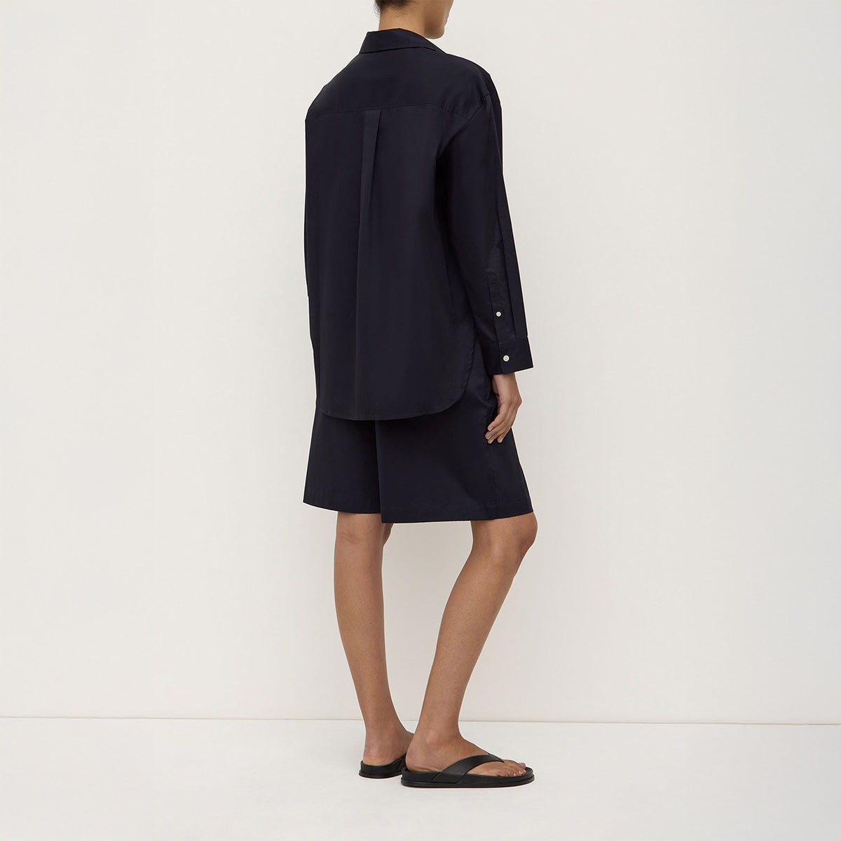 Longline cotton poplin shirt cut in a relaxed silhouette. Features a shaped hem, single button cuffs and double yoke pleat detail.