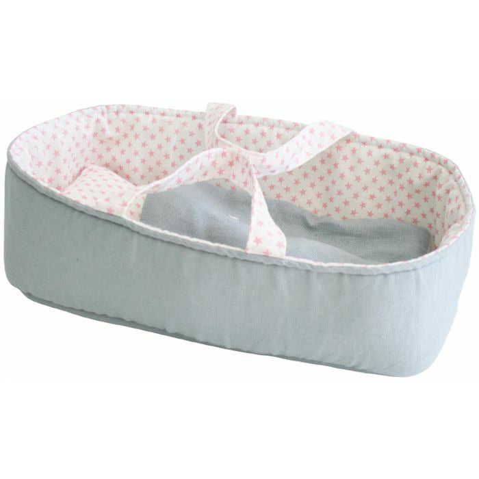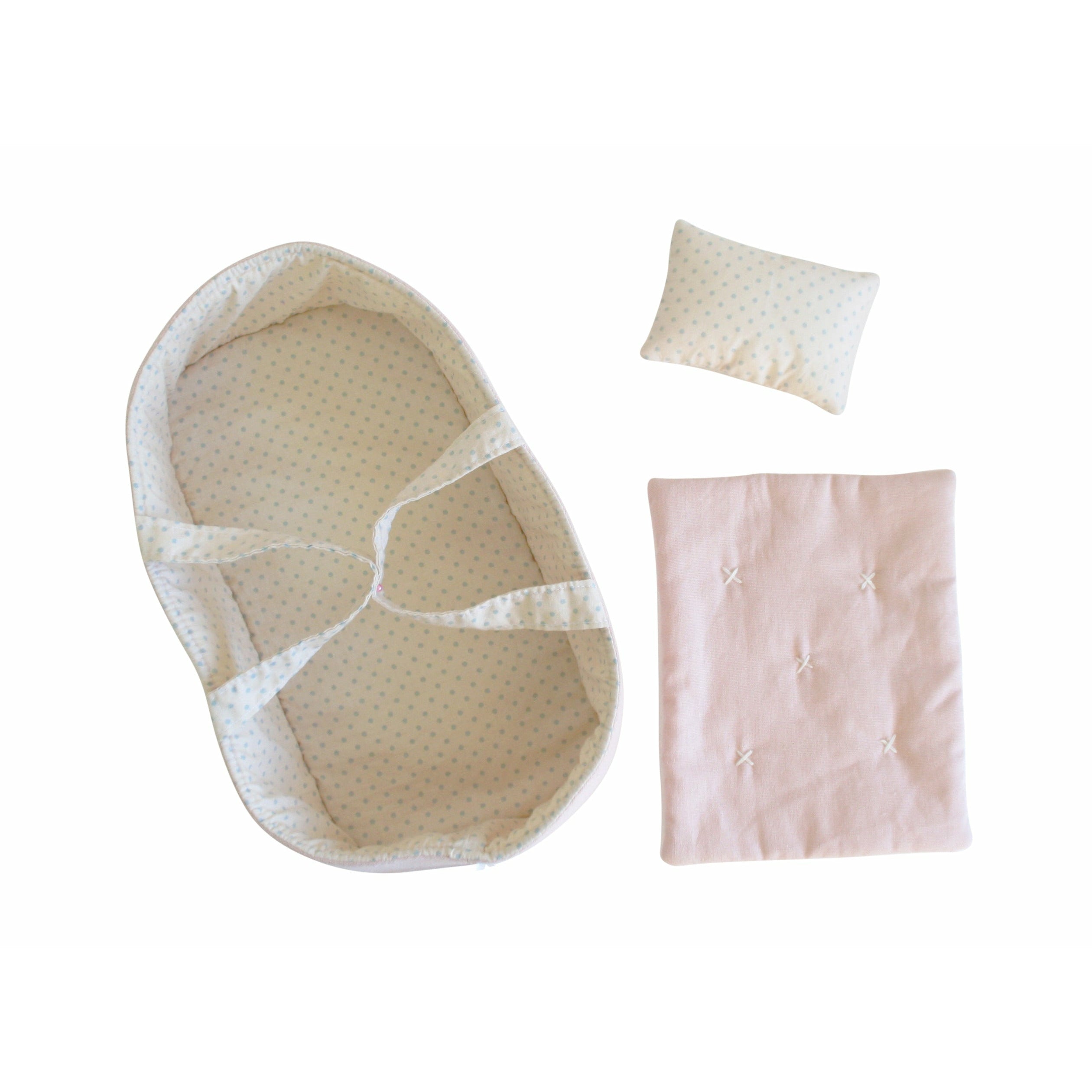 A sweet reversible fabric nesting basket with a mini quilt and pillow. Perfect for our asleep/awake baby doll. Approx 30cm long. Suitable 3yrs.