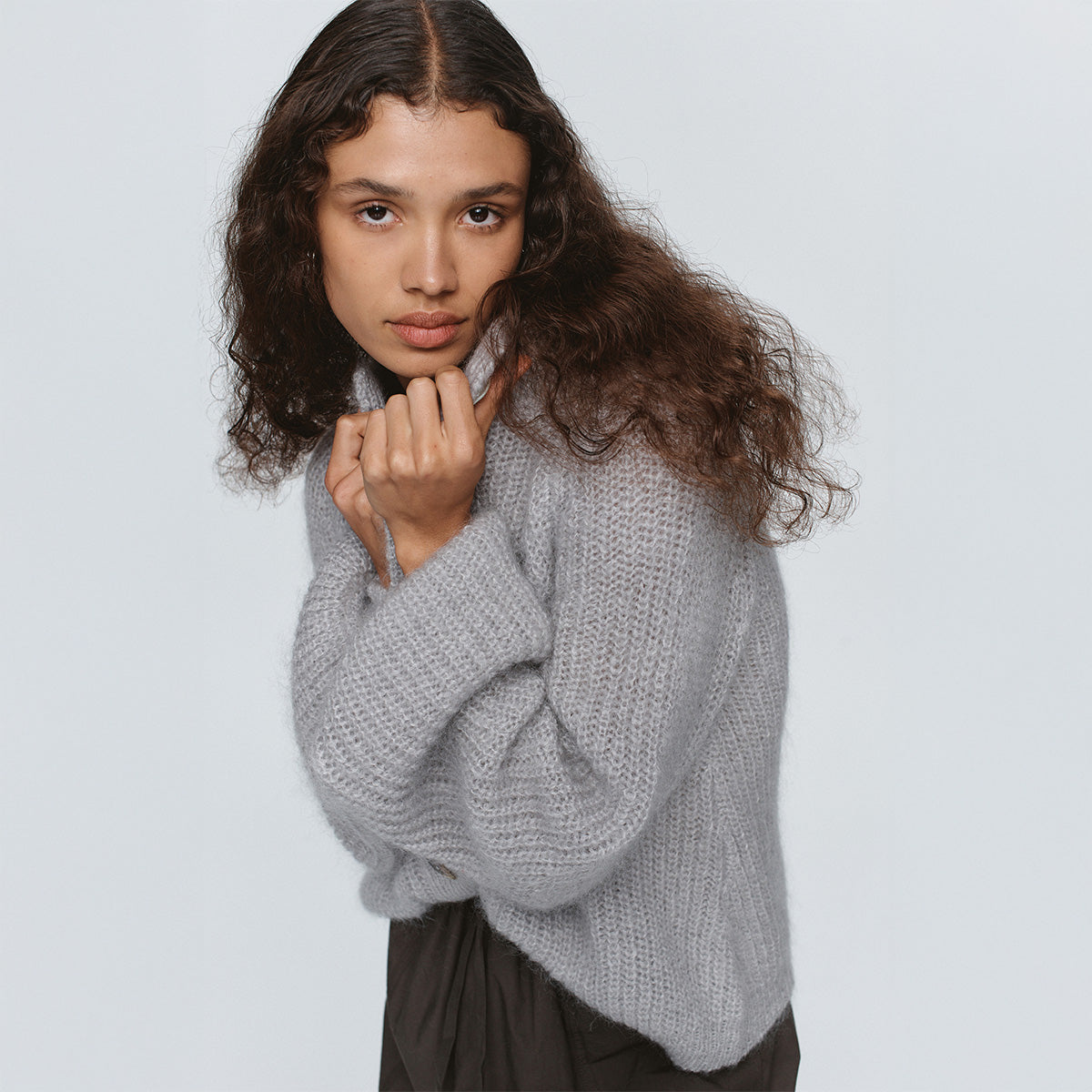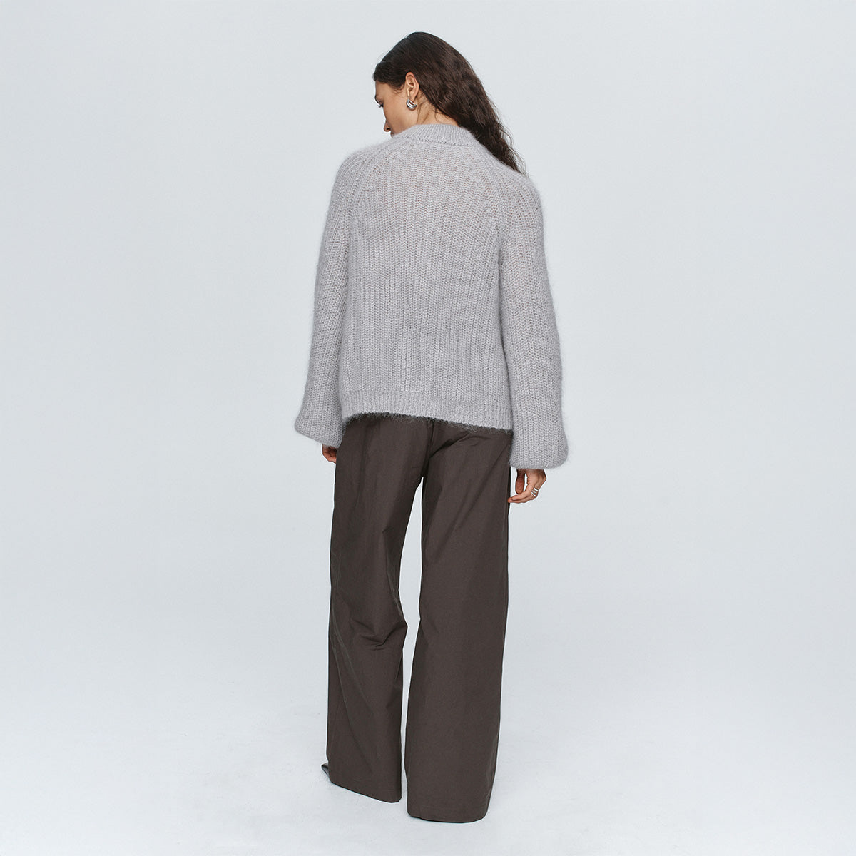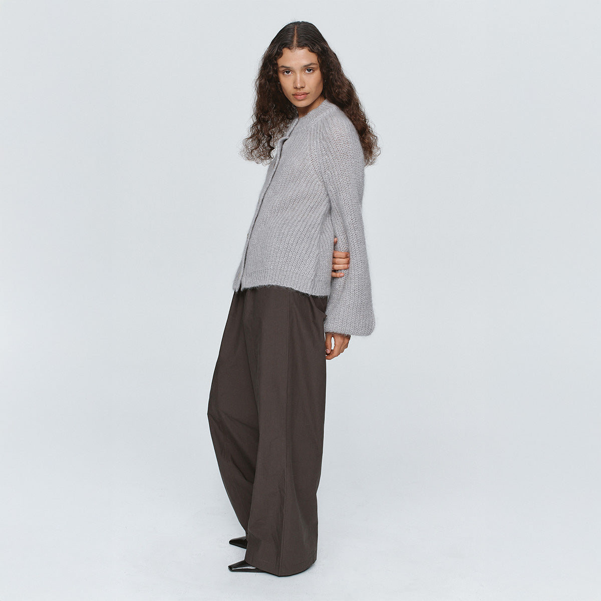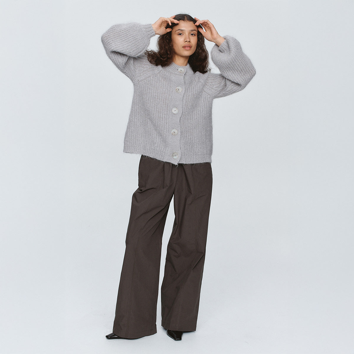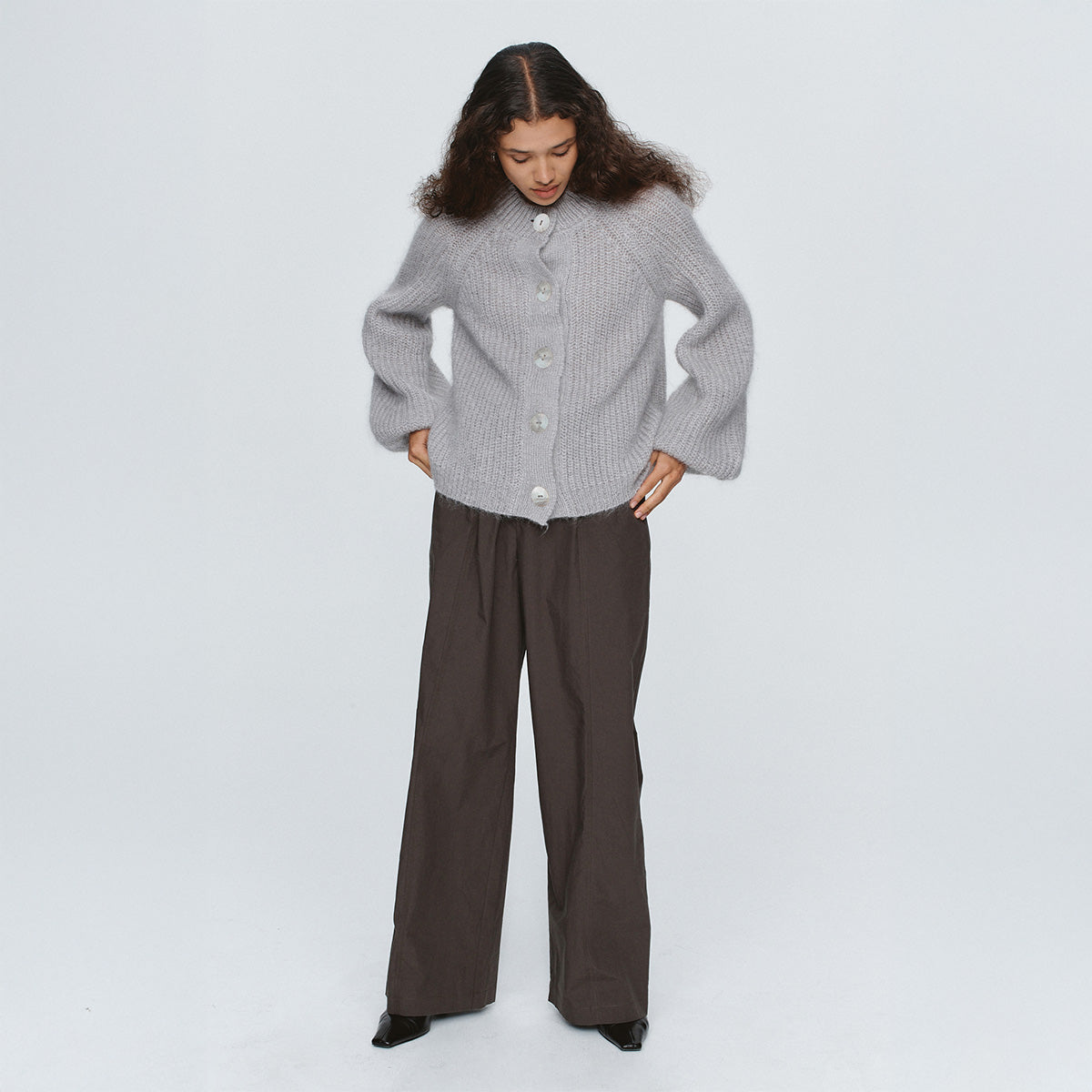 A signature silhouette built upon our adored Mimi Jumper and crafted in the same mohair / wool yarn, using a fisherman rib stitch. This cardigan features oversized balloon sleeves, with a slight A-line fit through the body. It has a high rib neck and rib cuff sleeves and is finished off with five oversized shell buttons down the centre front