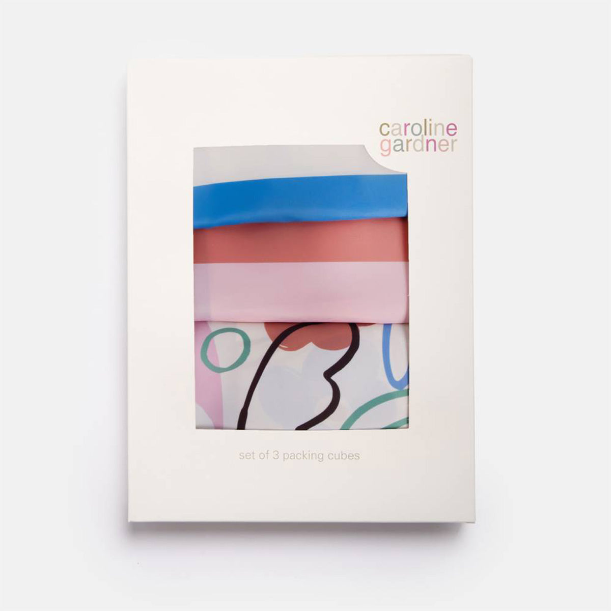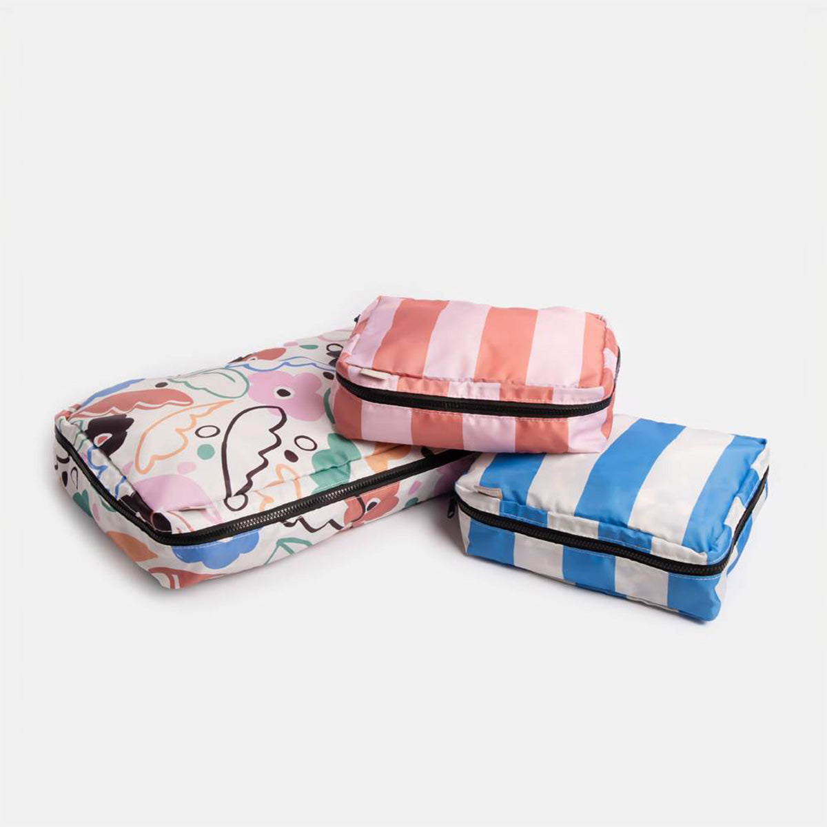 The ultimate travel hack, packing cubes are the perfect way to keep your clothes compressed and to organise your holiday suitcase. This gorgeous pack of 3 cubes come in a large colourful abstract botanical print cube, and two smaller cubes in blue and pink stripes.