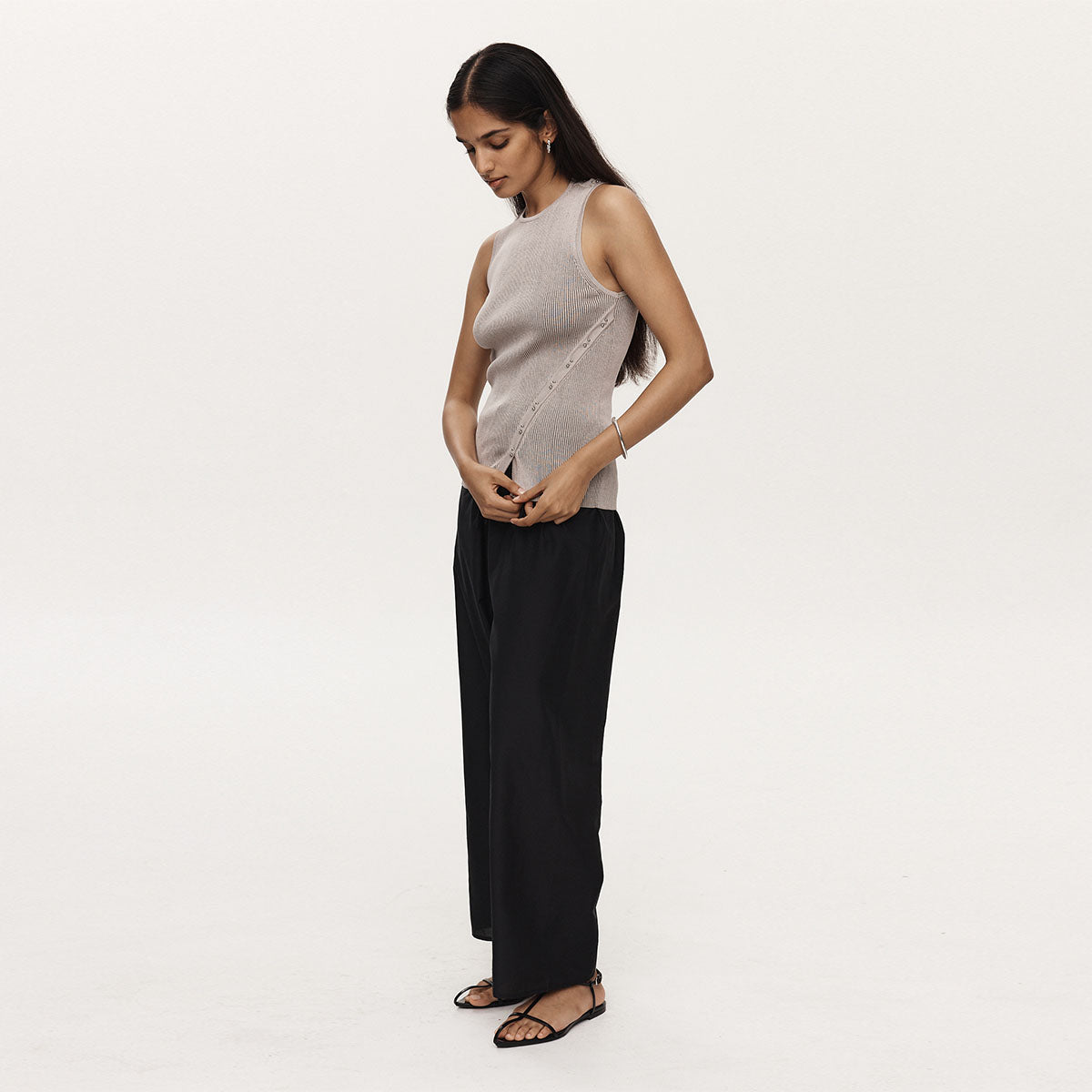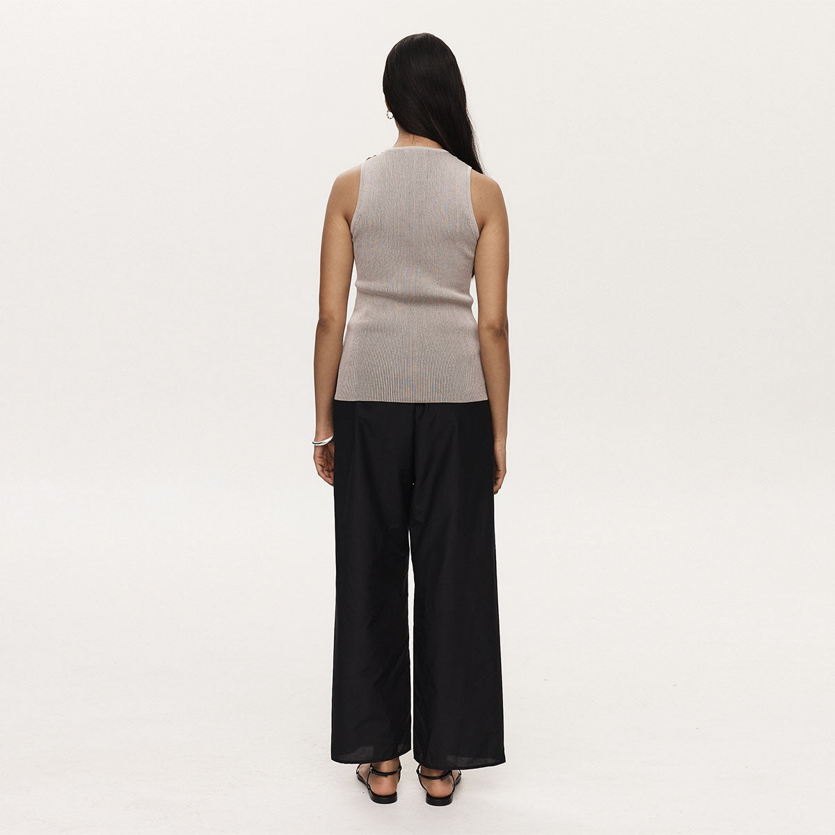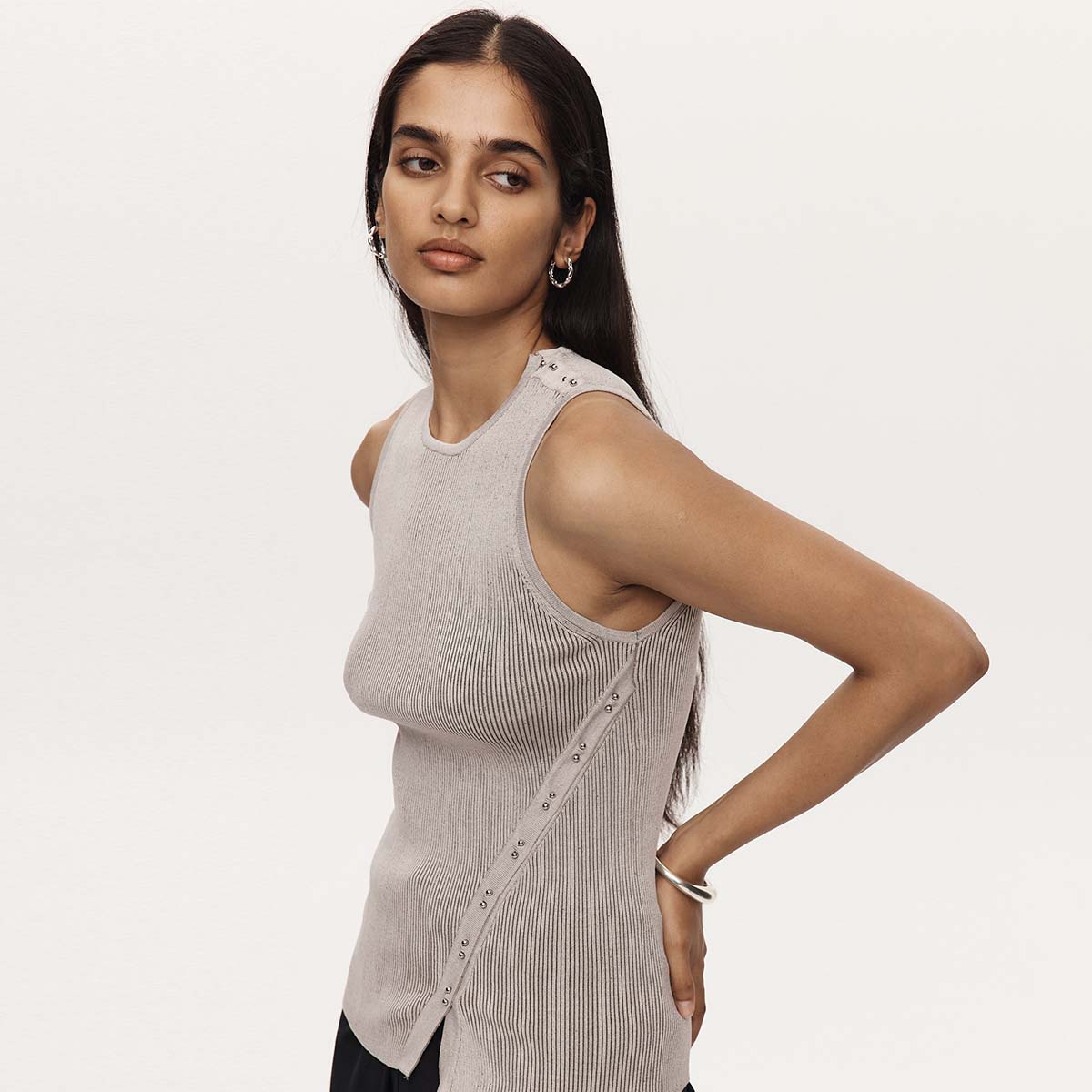 Crafted in a unique 100% cotton yarn with a soft contrast, this top features a high round neckline and wide singlet straps. Designed to sit close to the body with a subtle stretch due to the ribbed knit. Finished with a diagonal bar-bell detail at the side and top of shoulder.
