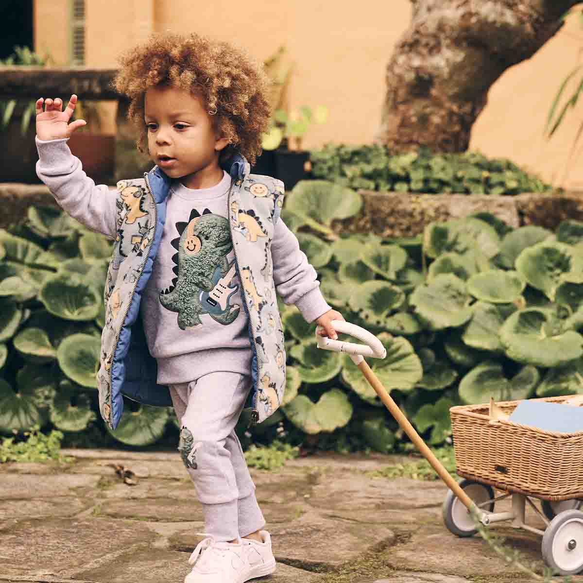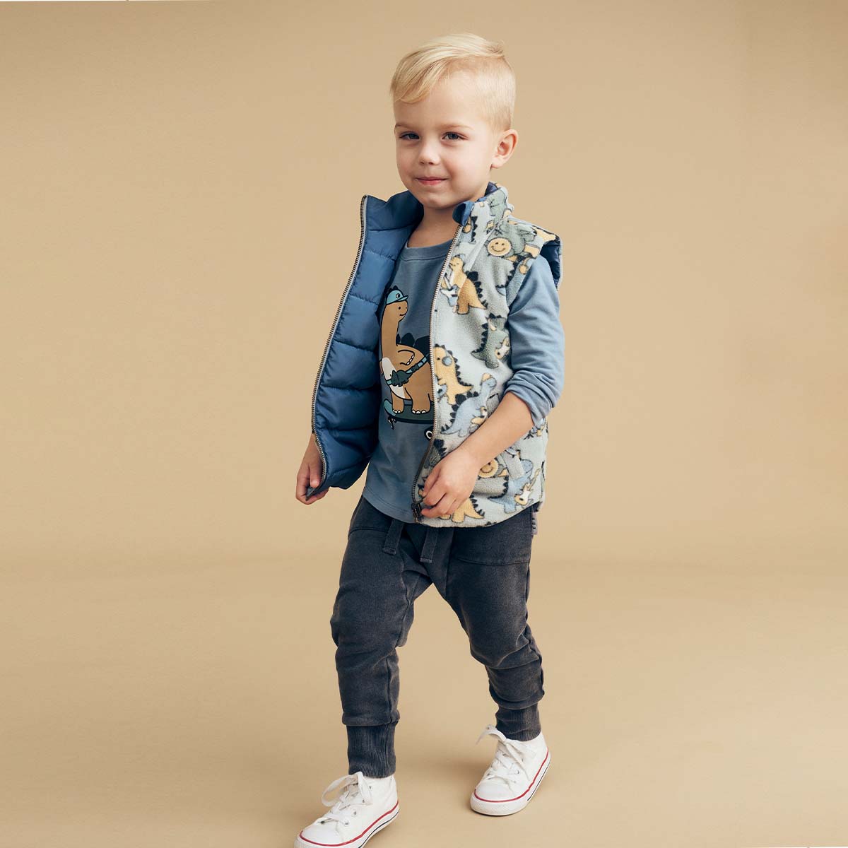 Layer up in the super cosy Dino Band Reversible Fleece Vest. This 2 in 1 style lets you wear musical dinos one day and night blue the next!