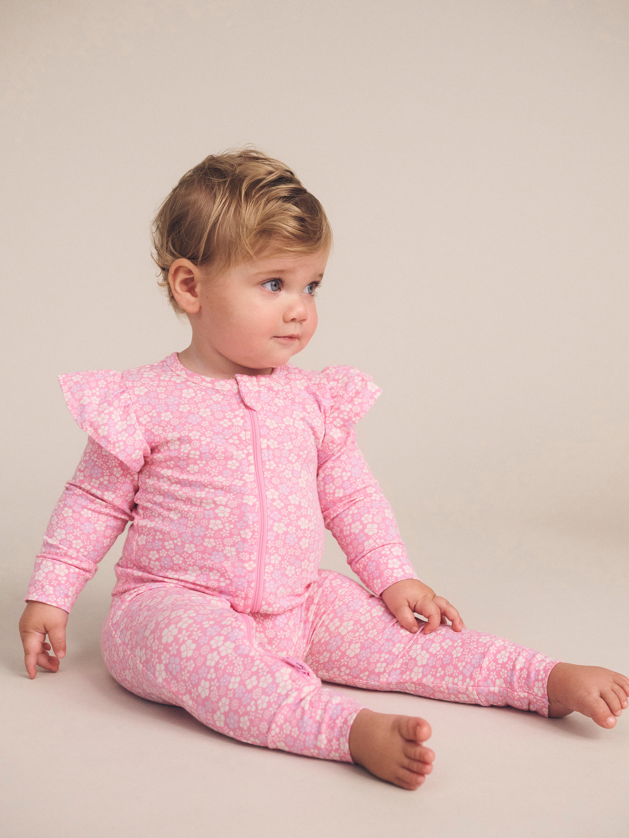This buttery soft romper is made from the most delicious organic cotton baby will love. It has sweet shoulder frills and a pretty floral print in peony pink. It features a full length, two-way zipper for easy nappy changes and a safety fold zip for peace of mind. Just add squishy legs.
