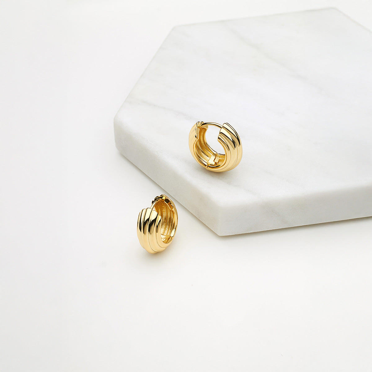 A delicate yet distinctive piece featuring a unique ridge design. This small hoop is perfect for effortless styling, whether worn alone or stacked for a curated ear look. Designed to complement our Paris Hoops