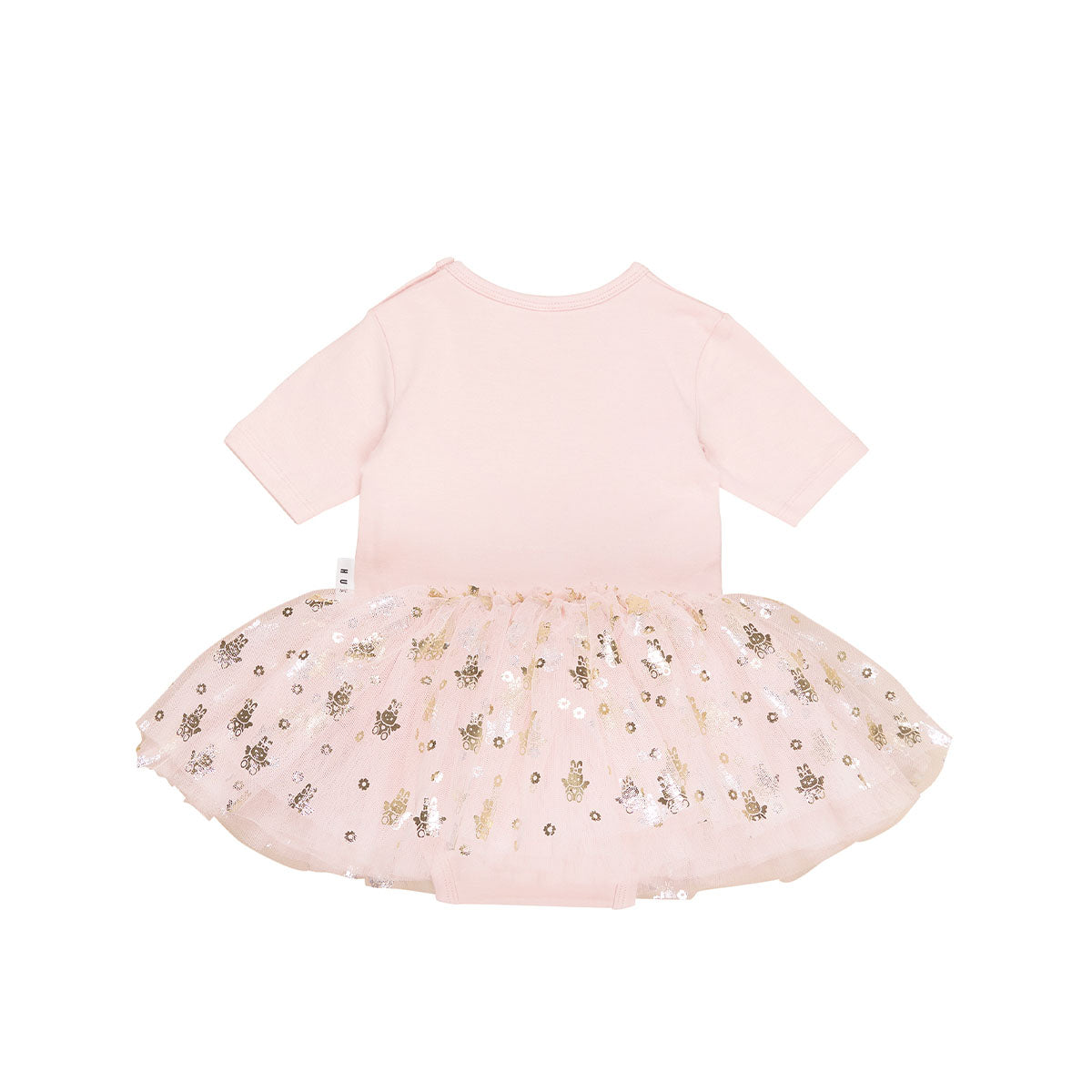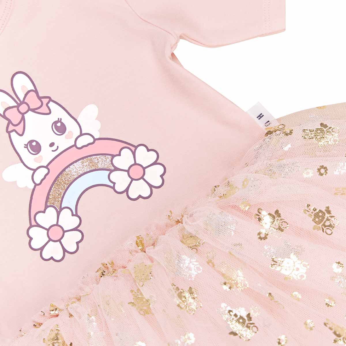 • Fairy bunny ballet dress with layered tulle skirt featuring all over gold foil fairy bunny print