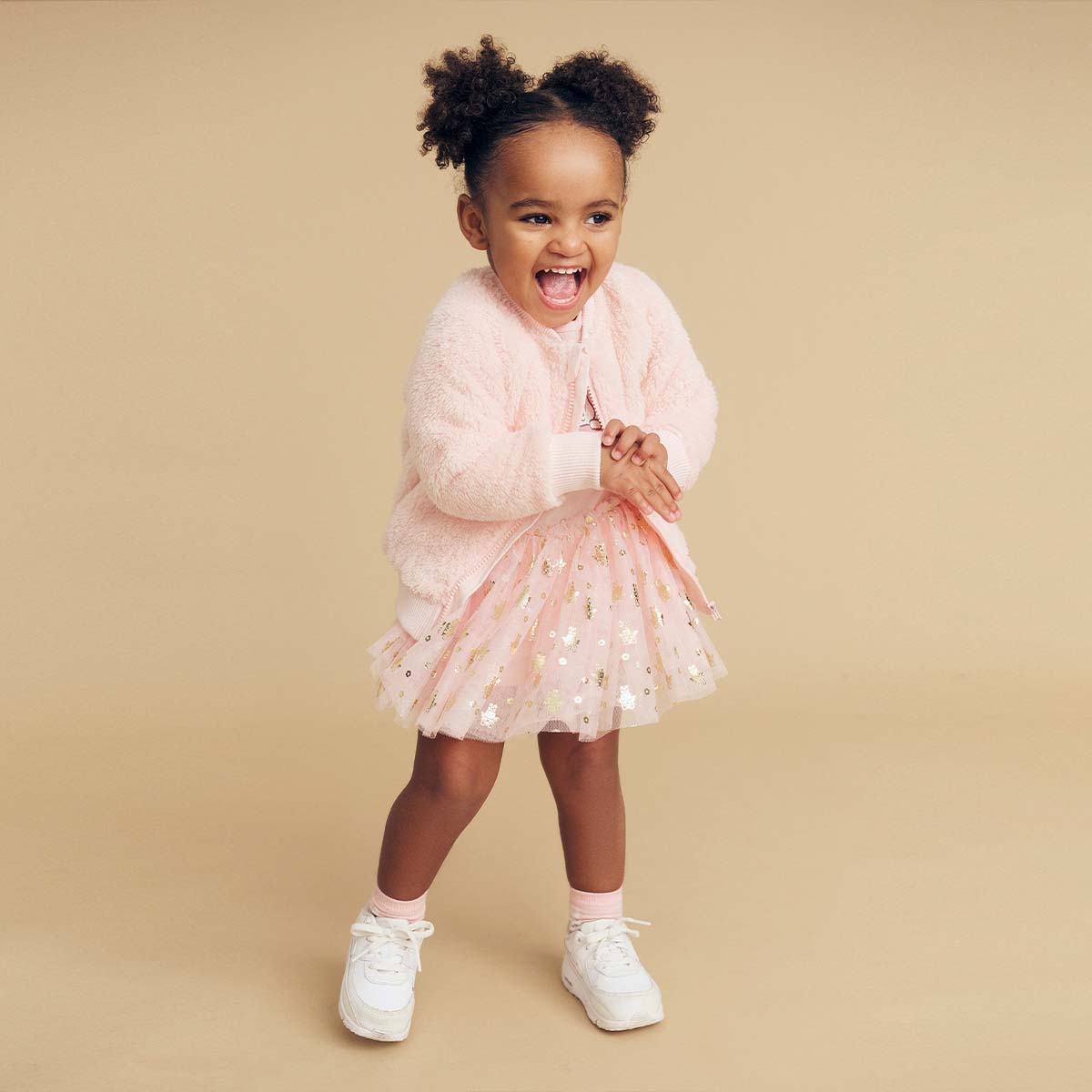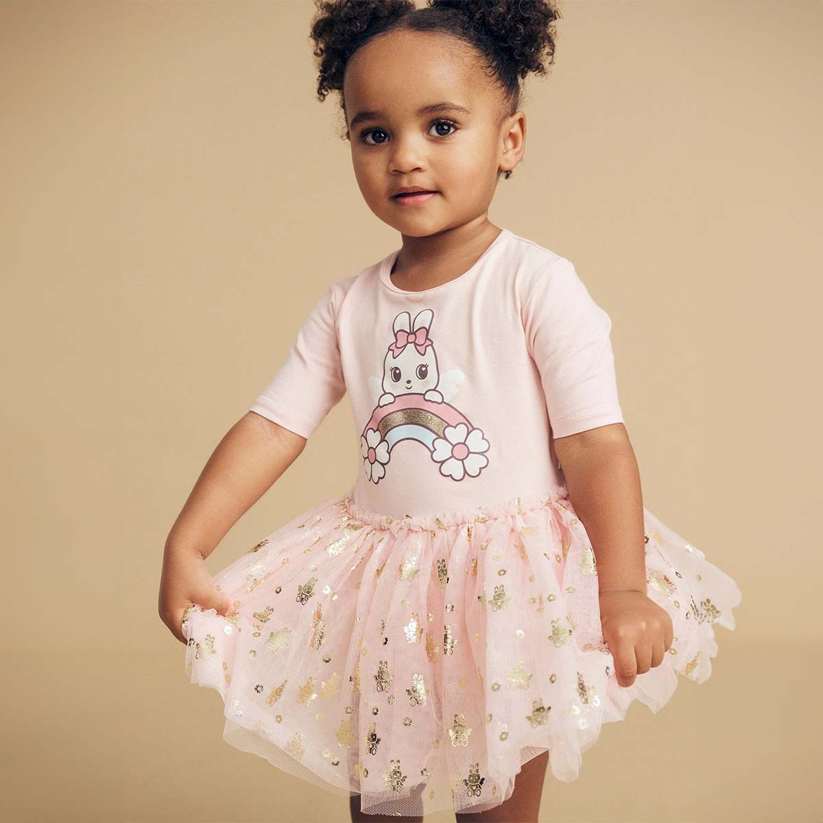 The Fairy Bunny Ballet Dress is perfect for twirling away the day! Made from super soft cotton jersey, this dress features a fairy bunny print and sparky, gold foil detailing on the tulle for added magic!