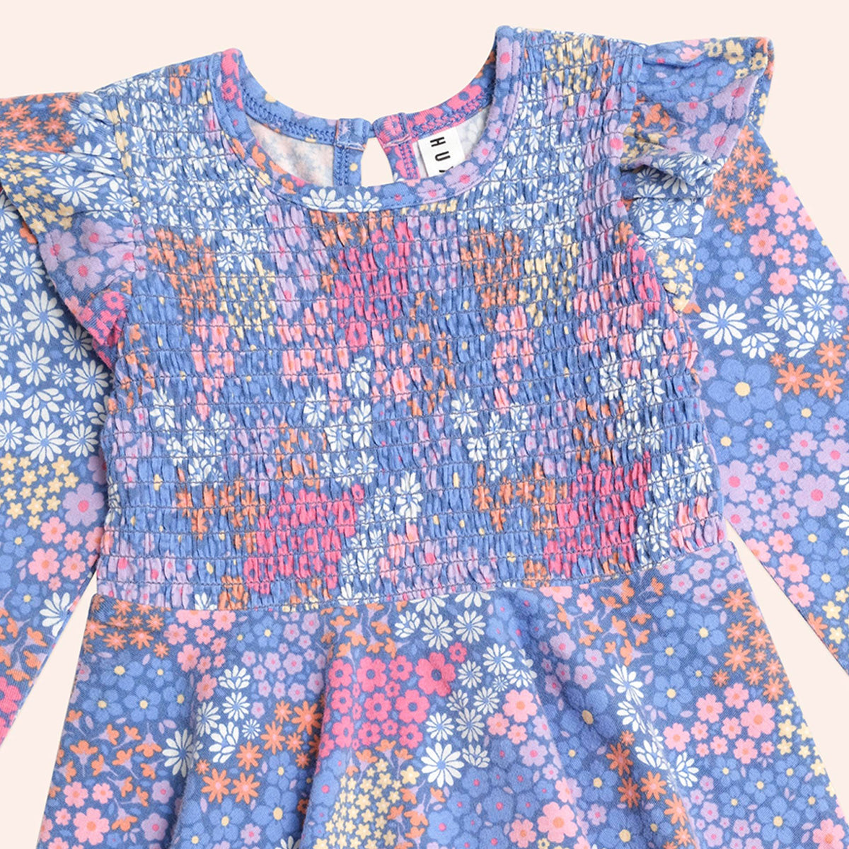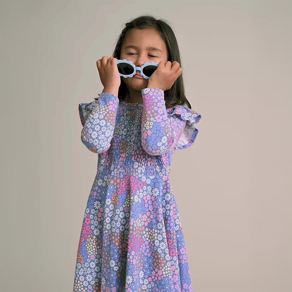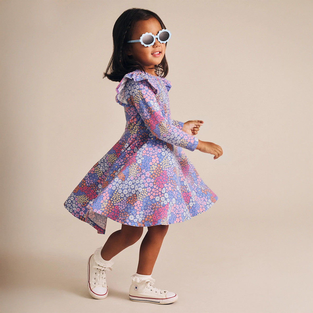 Be best dressed at the next spring fling in this pretty floral long sleeved dress. Made from soft organic cotton jersey in our custom floral bloom print, it has a stretchy shirred bodice, sweet shoulder frill details and a full skirt made for twirling. Bring on the dancefloor!