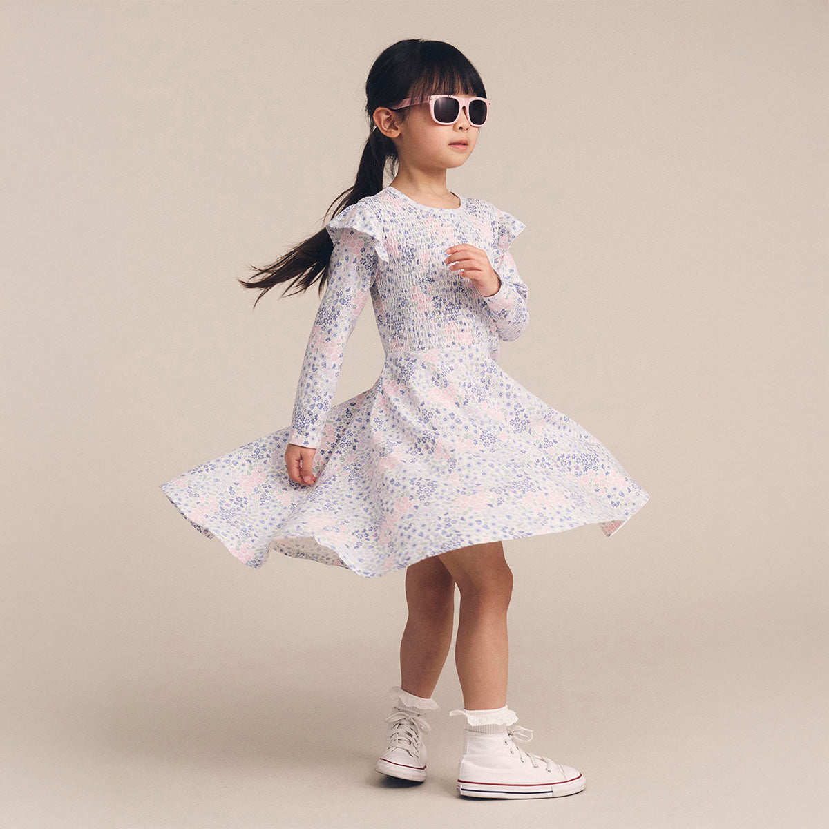 Flower Garden Shirred Long Sleeve Dress