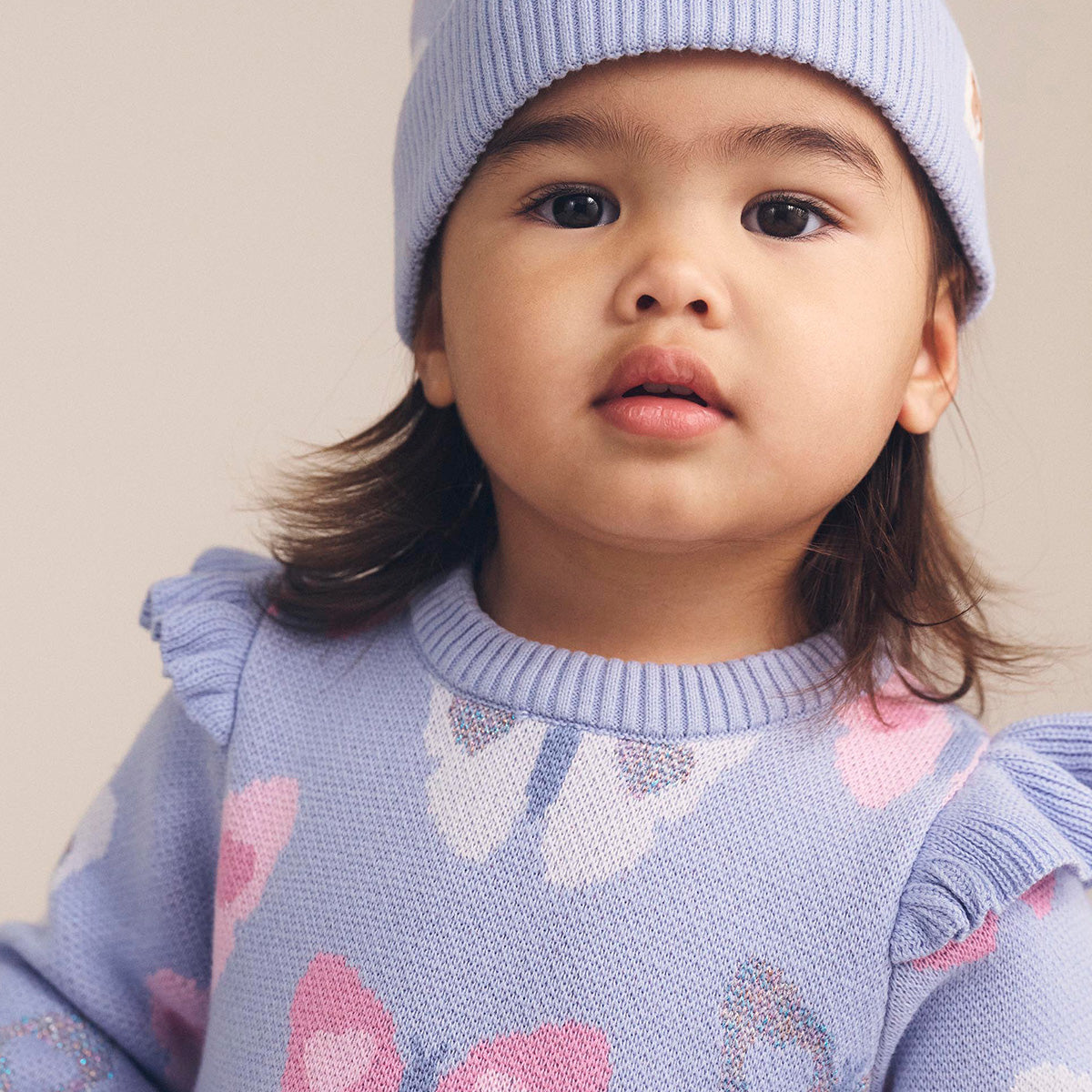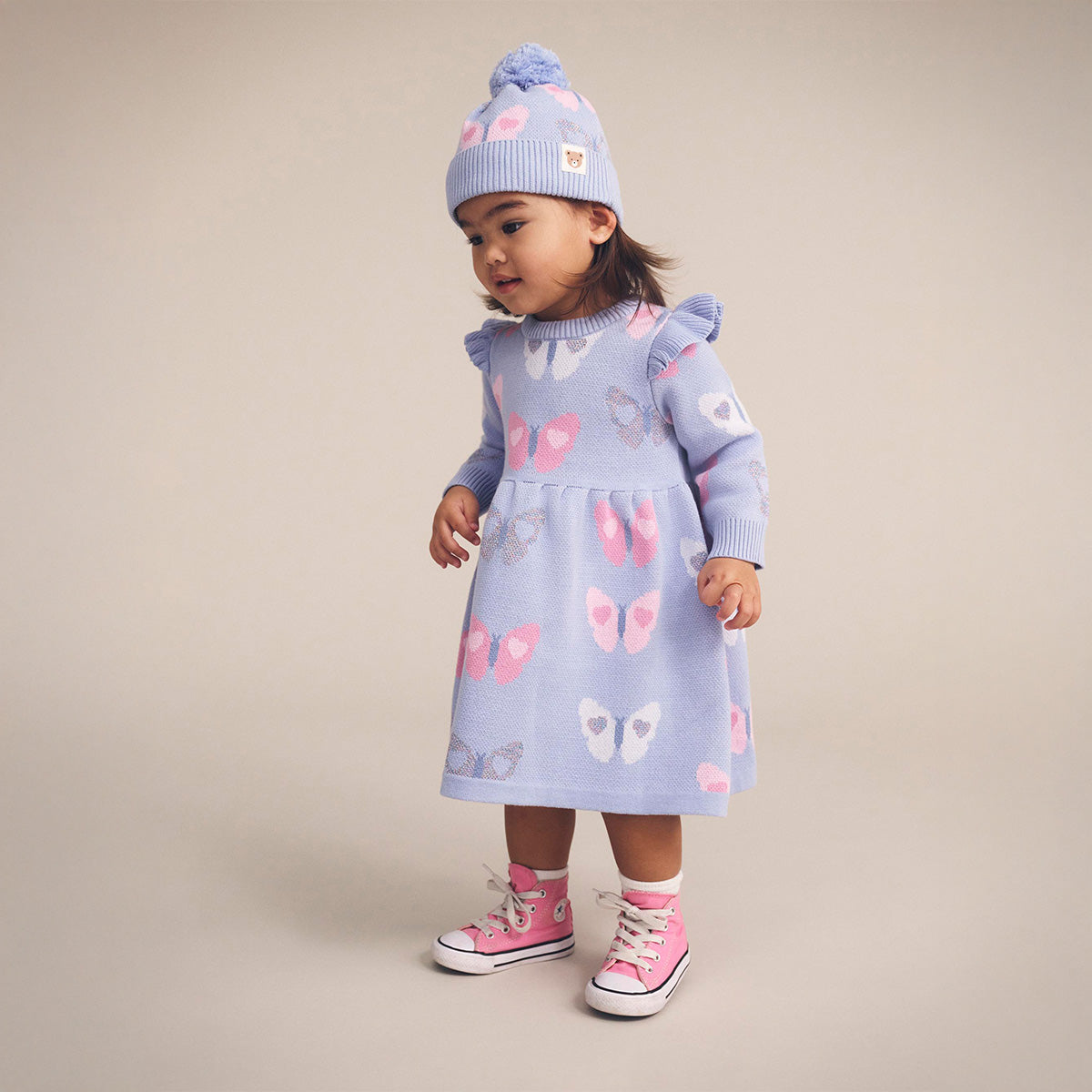 Keep the warm in and the cold out with this toasty beanie. Made from luxuriously thick organic cotton, it’s warm enough to get you through the coldest months. It features an all over butterfly pattern and fluffy pom pom.