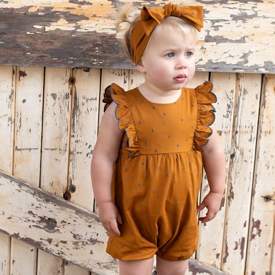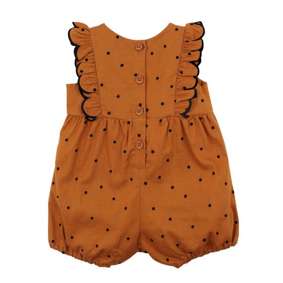 This gorgeous embroidered spot romper features over the shoulder embroidered scallop frills, with back buttons and a concealed press stud opening for ease of dressing.