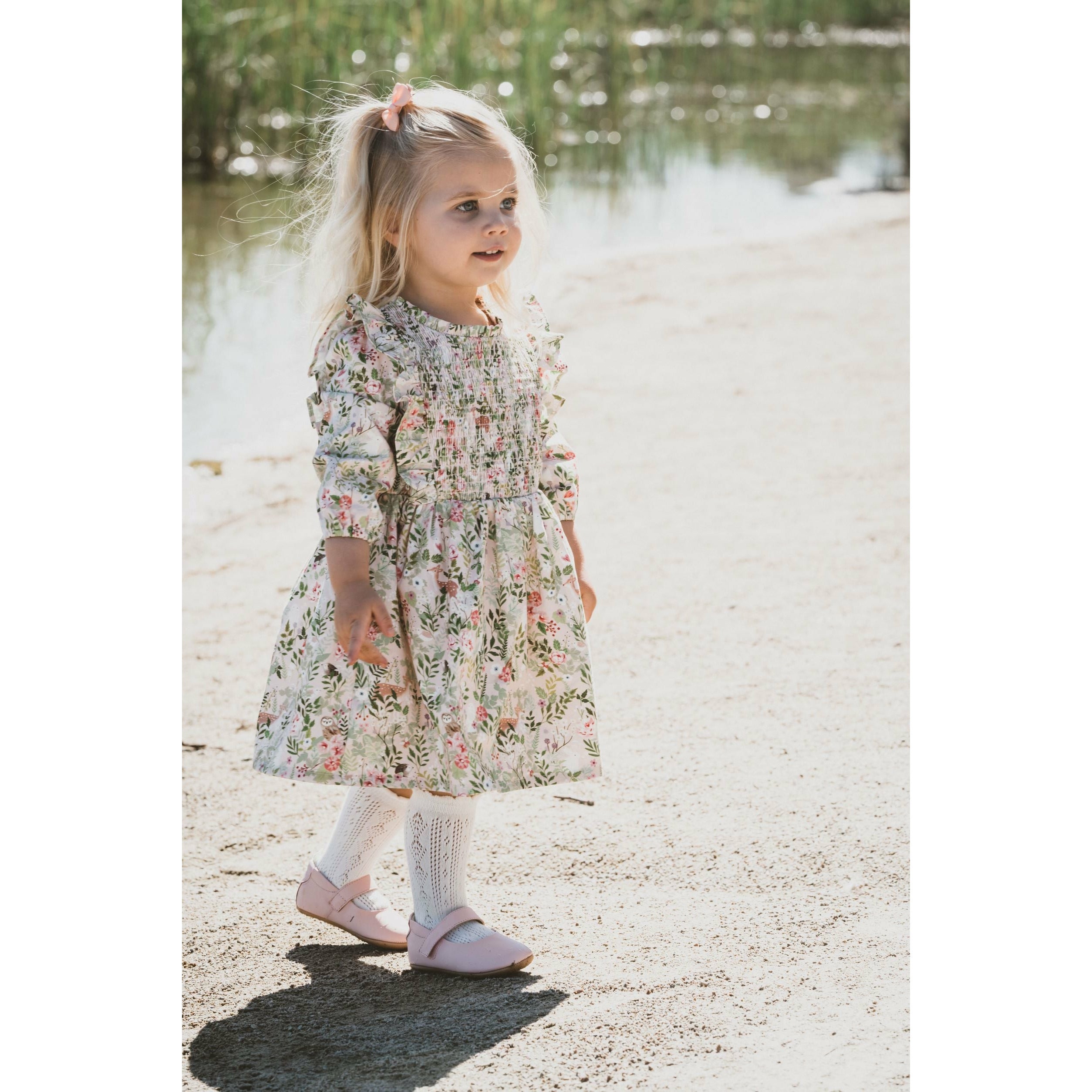 This sweet forest floral and fauna print dress features a shirred front bodice with frilled neck, over-the-shoulder frills with side contrast pink bows a gathered skirt, making your little one party-ready.