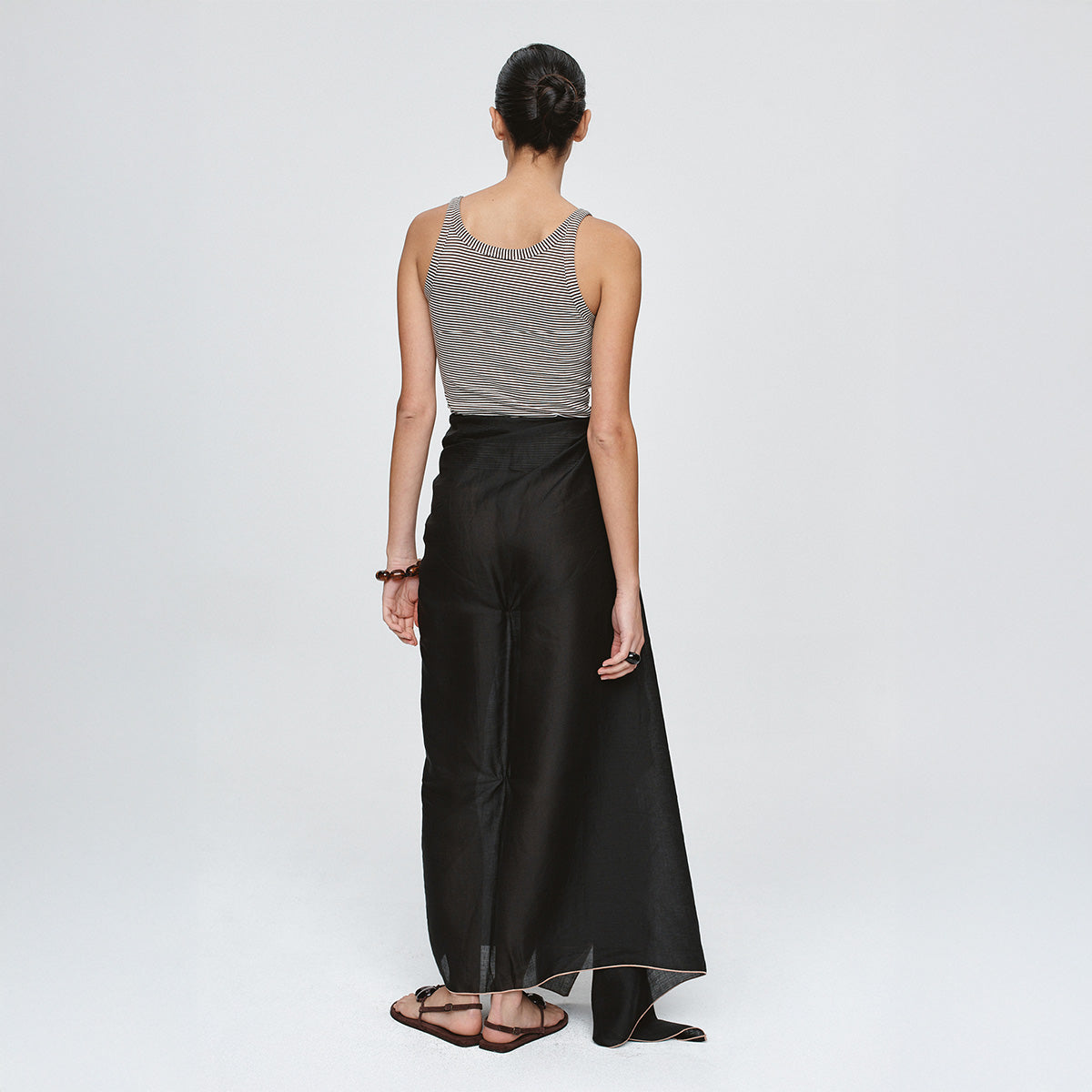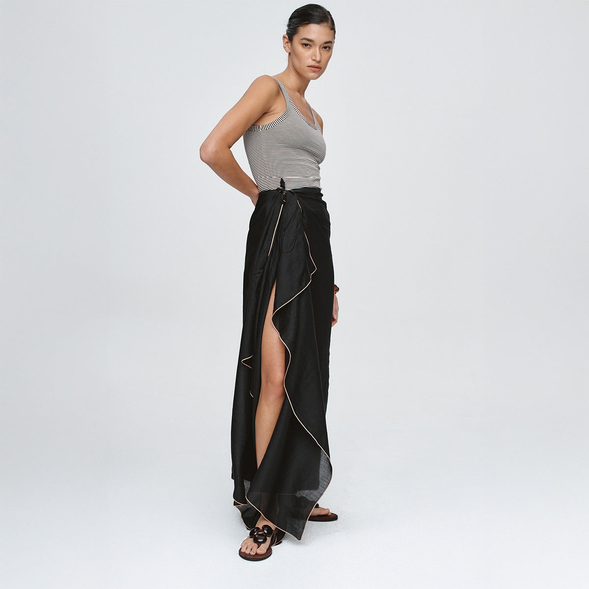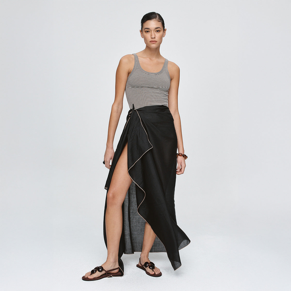 The Hattie Sarong is designed for effortless versatility. Crafted from a soft, lightweight 100% Linen, it drapes naturally over the body. The wrap construction allows for adjustable tying at the waist. The hemline is delicately rolled and accented with fine contrast binding for a refined edge finish.