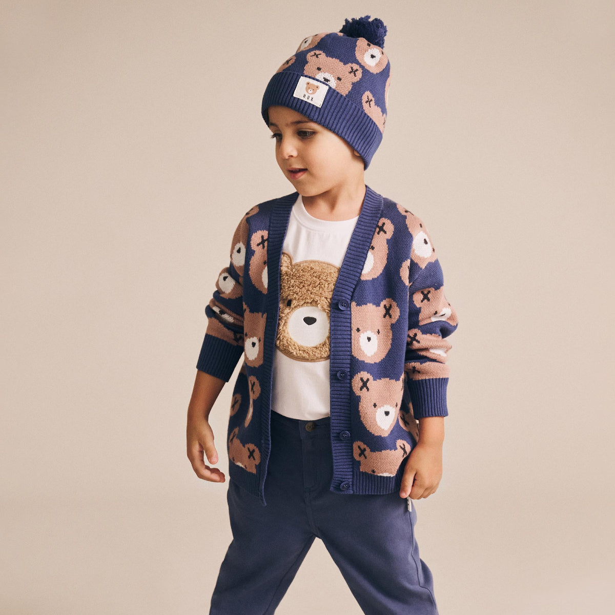 If Huxbear could hug, it would feel like wearing this cardigan. This luxuriously thick jacquard organic cotton knit cardi is the ultimate cosy layer. Warm enough to get you through the coldest months, it features an all over Huxbear pattern and easy buttons.