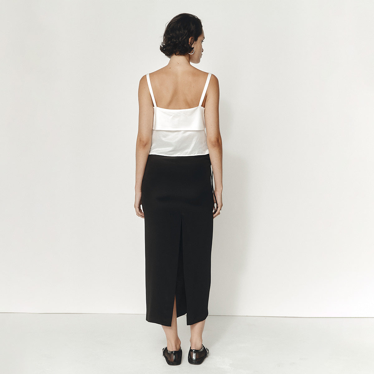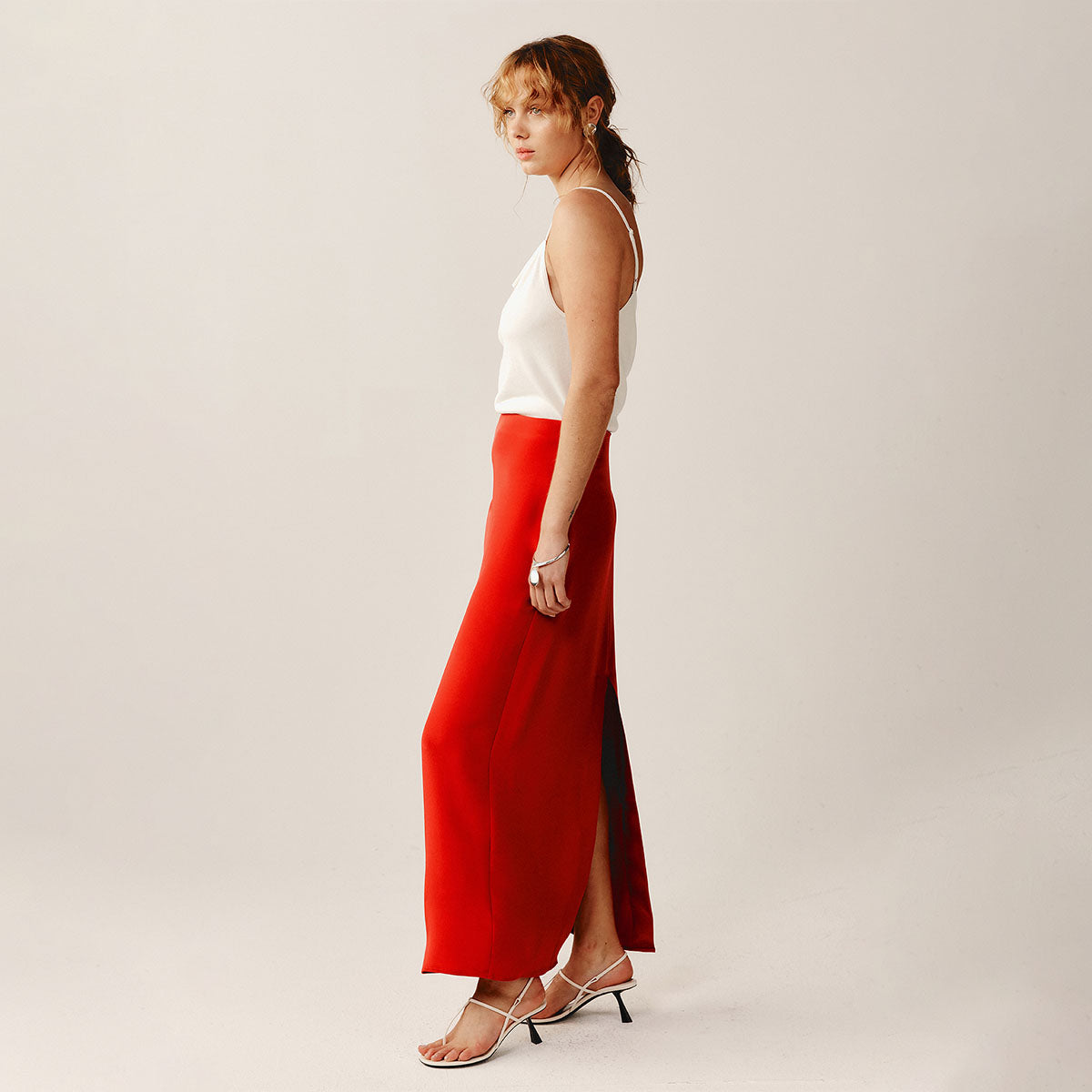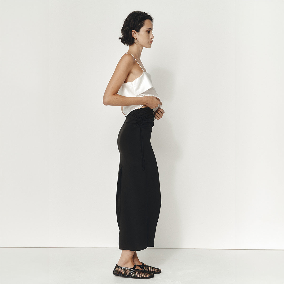 The Iris Skirt is crafted in 100% silk. It has a slim silhouette that is fitted through the waist and hips before falling straight through the body to the ankle. This skirt sits on a fixed waistband with an invisible zip closure at the side. On one side of the skirt, there is a gathered channel detail which can be adjusted and tied to the desired fit. This skirt also features a vent at the centre back.