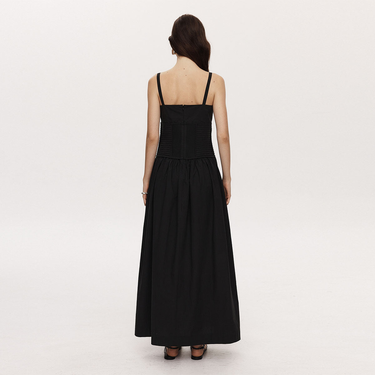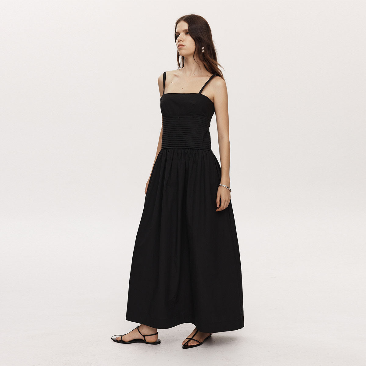 A full-length dress that falls to the ankle, the Jordan Dress features a square neckline and thin singlet straps. This dress has a fitted silhouette through the chest and waist, accentuated with a panel of vertical tucks before falling into a full A-line skirt created by a gathered hem. This dress is secured by an invisible zip closure at the side.