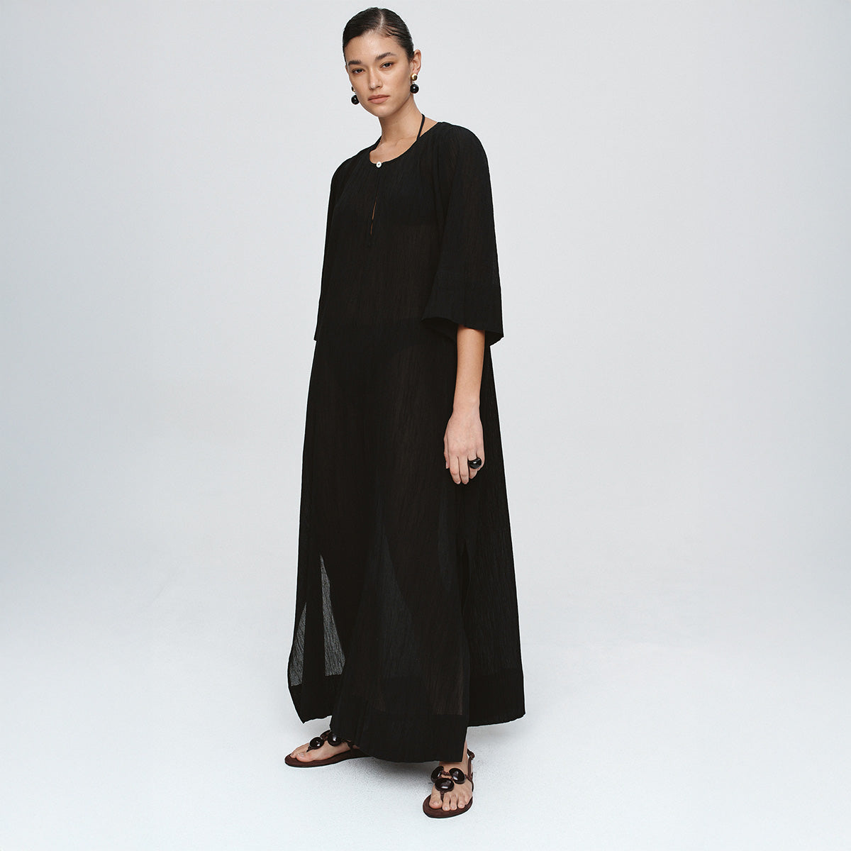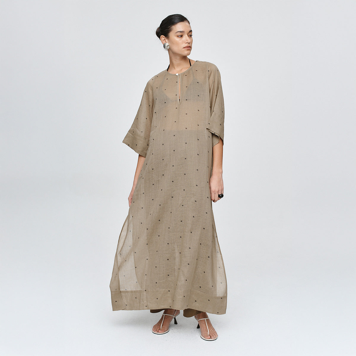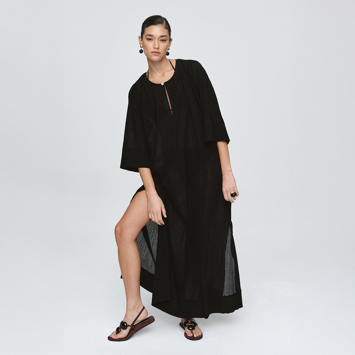 A fluid kaftan cut from a 100% Cotton.  A sheer fabric that moves effortlessly with the body. Designed with a clean, round neckline and a discreet front neck slit secured by a single button. A panelled hemline adds subtle weight and shape with side seam slits to create movement and soft volume. Unlined for a light, breathable feel, it is intended to layer over swimwear or fine base garments.