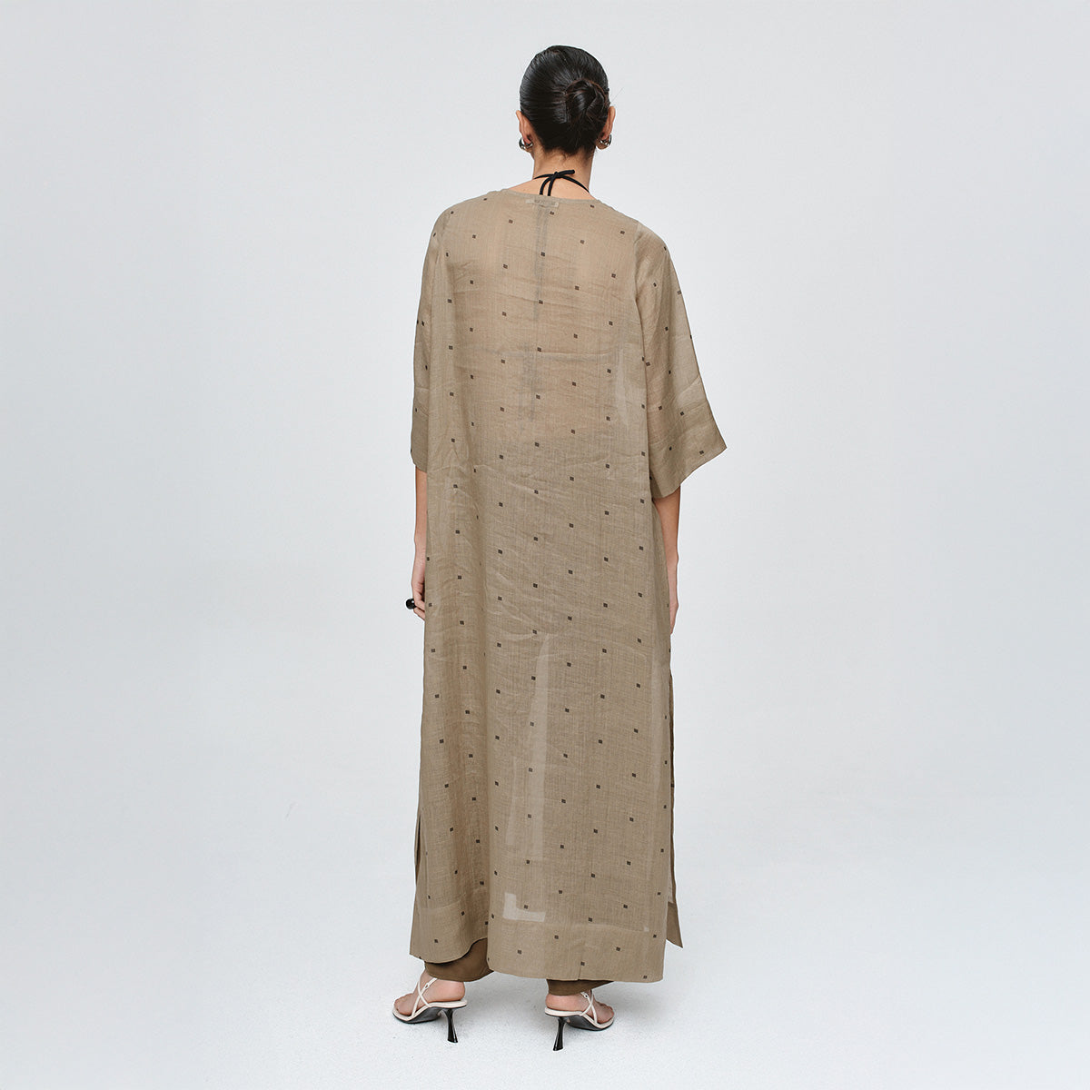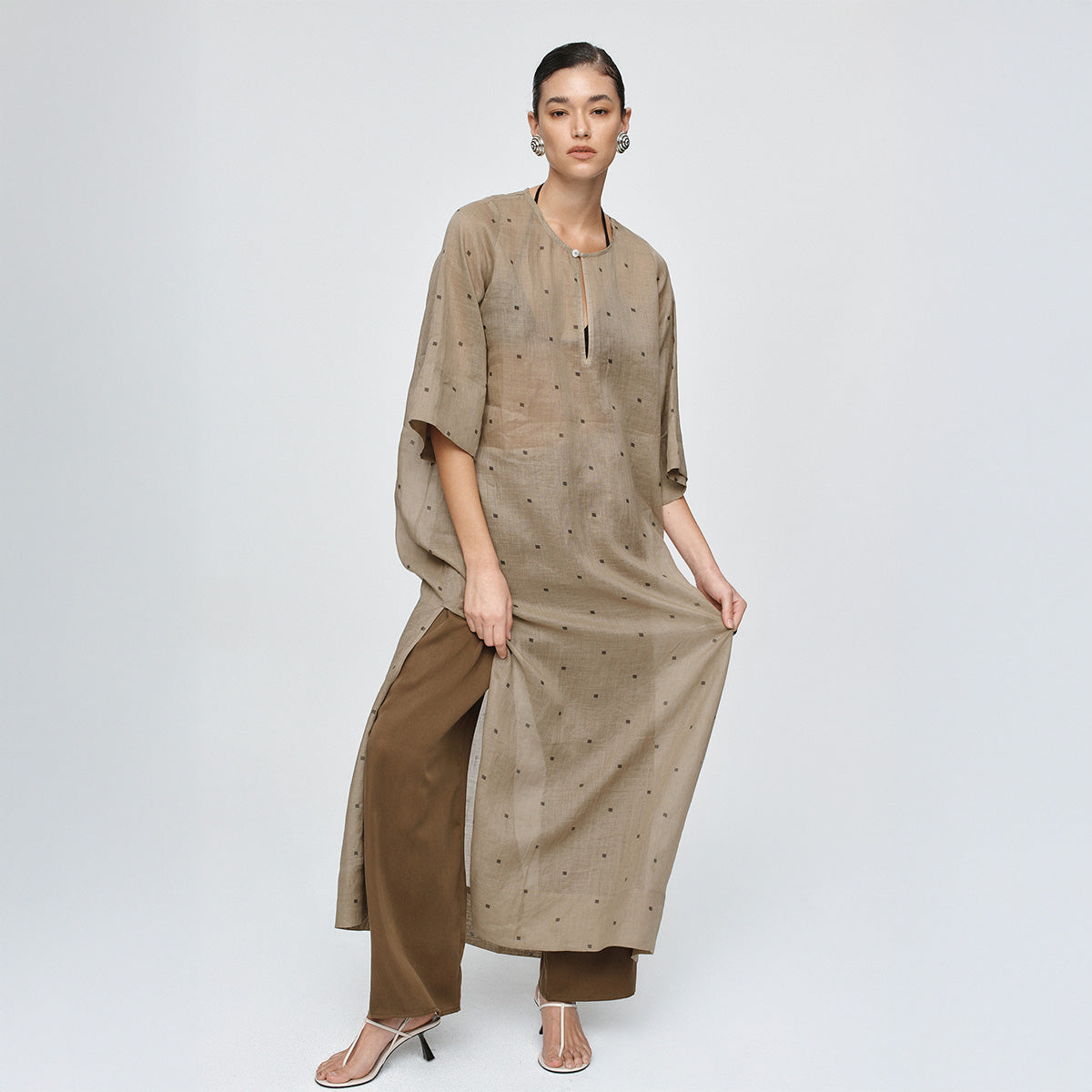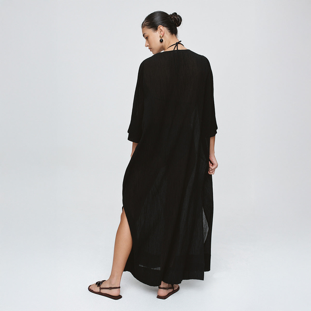 A fluid kaftan cut from a 100% Cotton.  A sheer fabric that moves effortlessly with the body. Designed with a clean, round neckline and a discreet front neck slit secured by a single button. A panelled hemline adds subtle weight and shape with side seam slits to create movement and soft volume. Unlined for a light, breathable feel, it is intended to layer over swimwear or fine base garments.