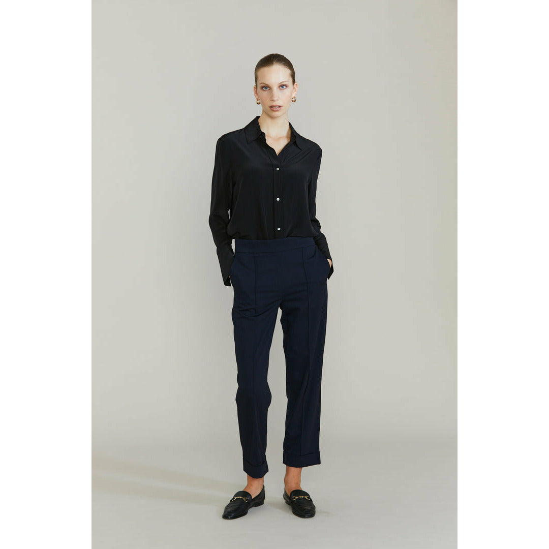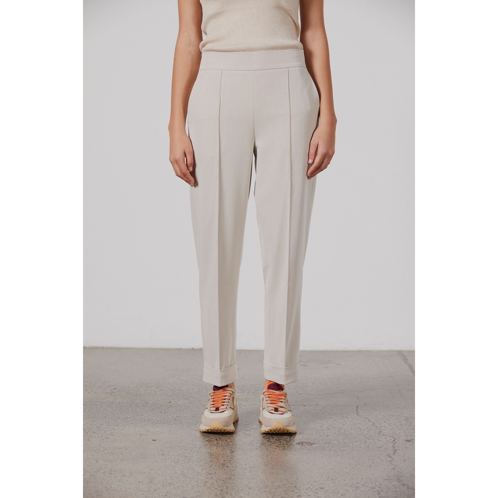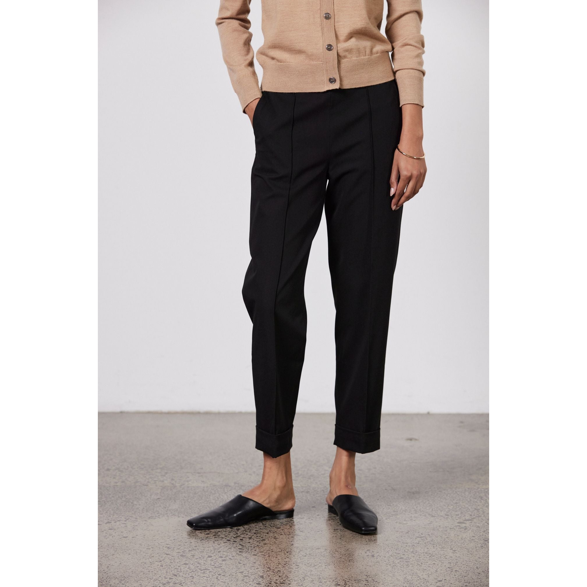 Featuring a cropped and cuffed leg with pin stitch detail down the front to elongate and add crispness. They have a flattering flat front with a refined elastic waist.