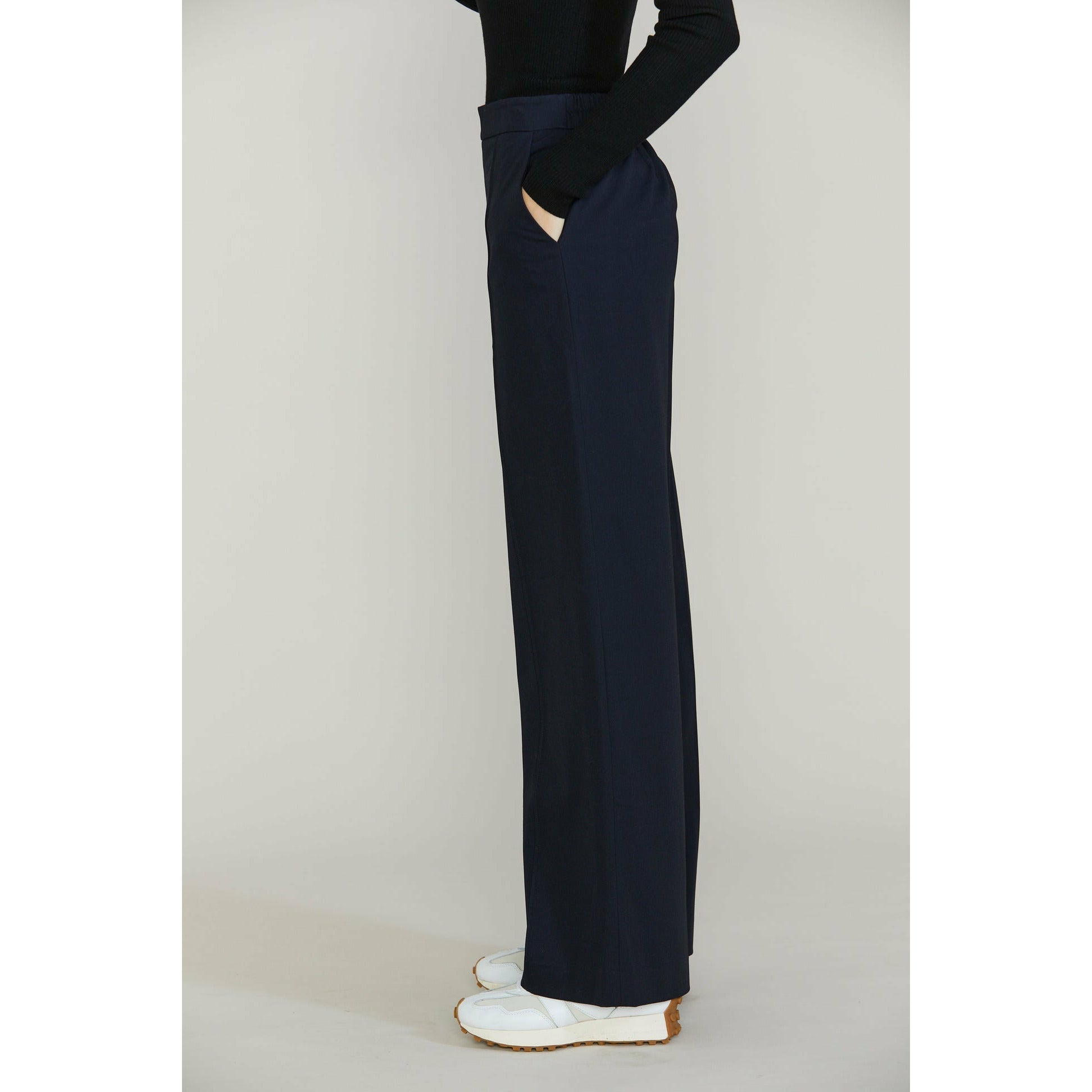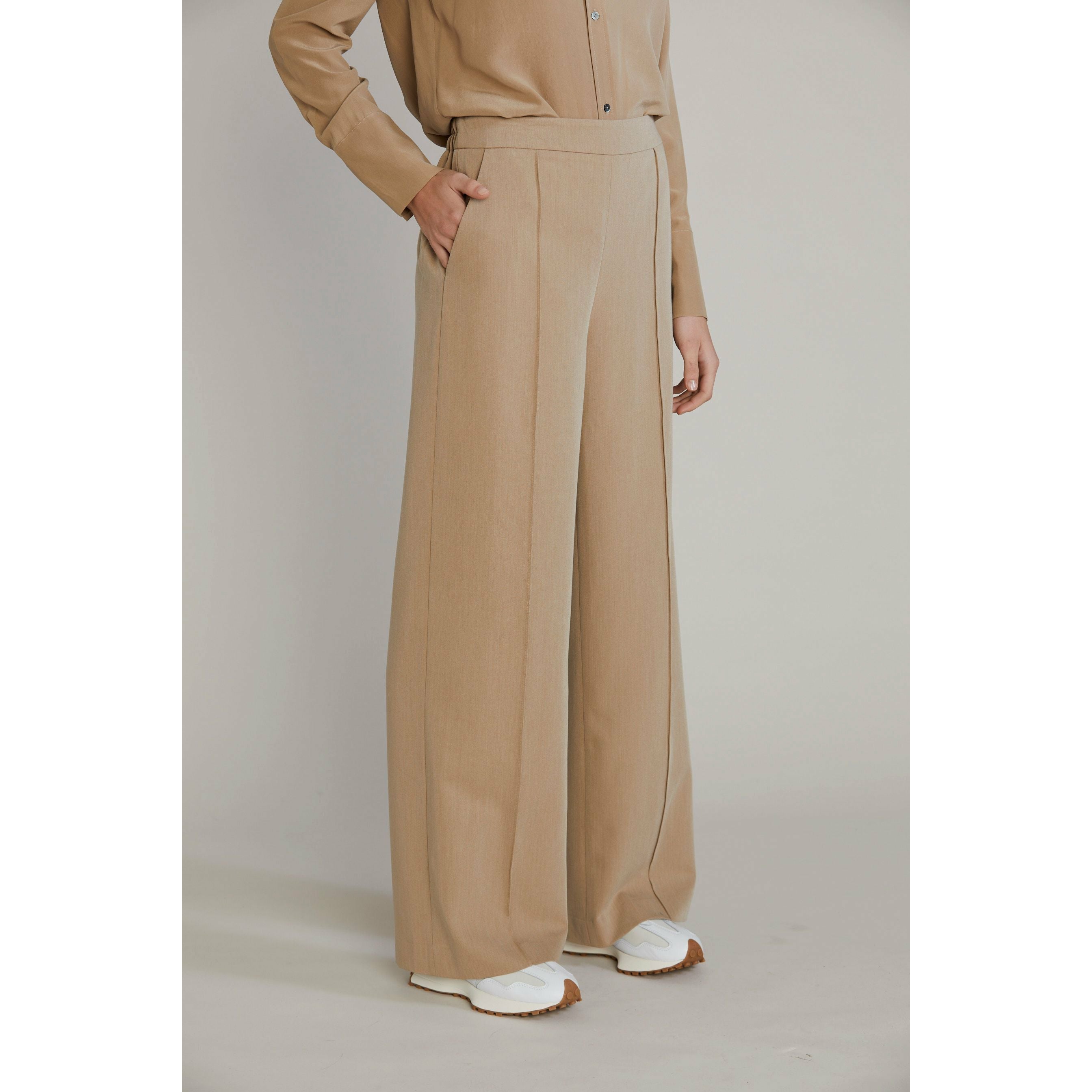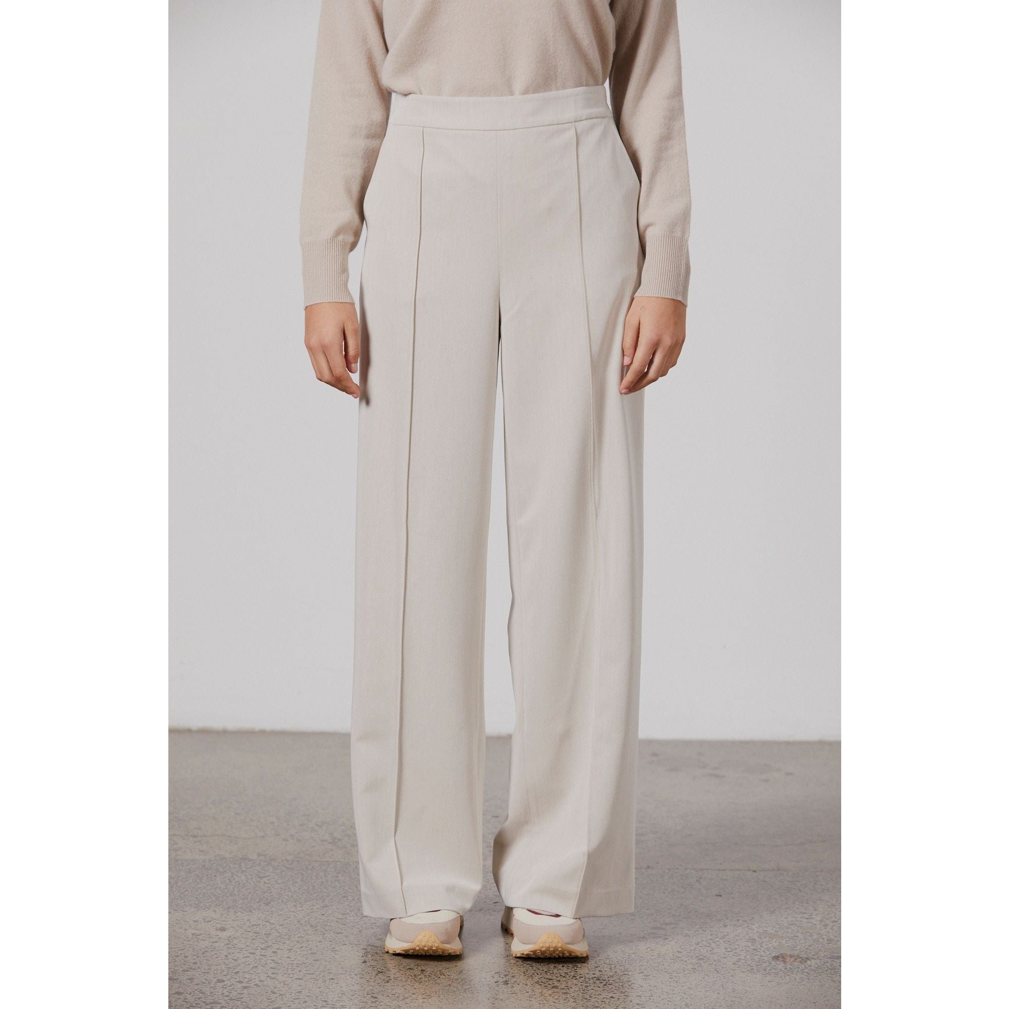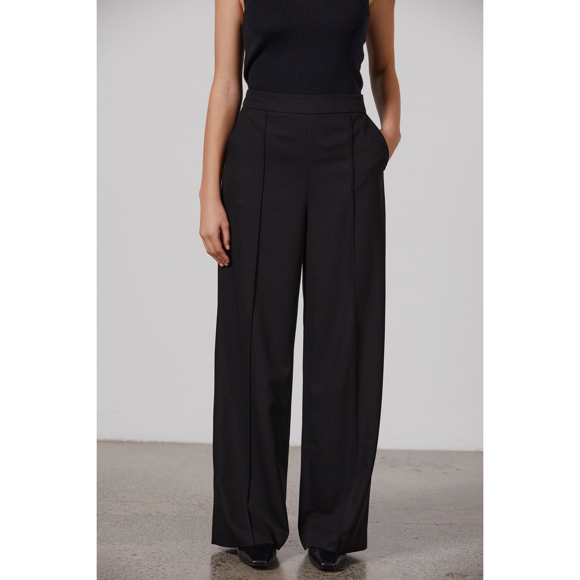 These high rise, pull-on pants feature a wide leg that falls from the hip with pin stitch detail down the front to elongate the leg. Cut from a drapey rayon blend fabric, they have a flattering flat front with a refined elastic waist.