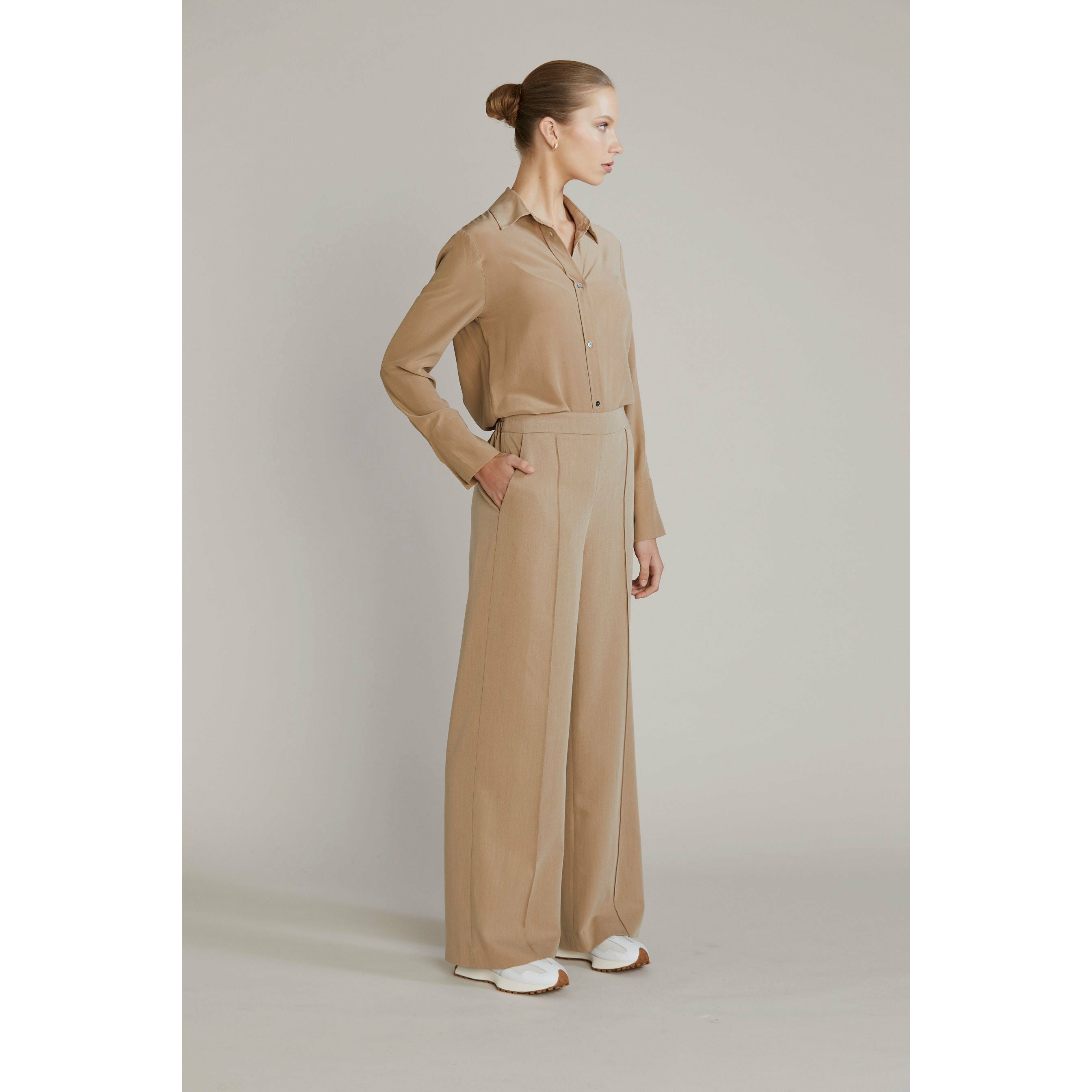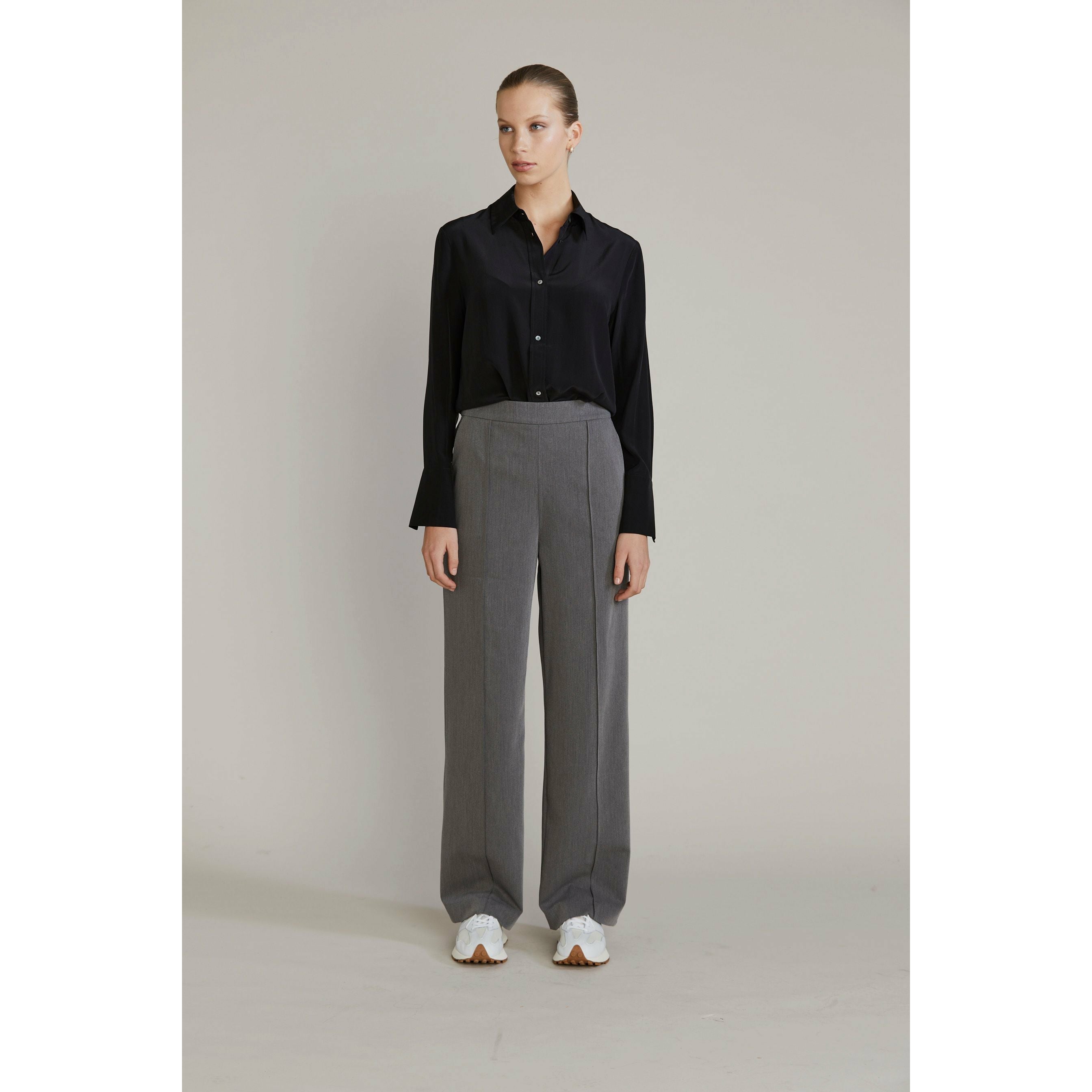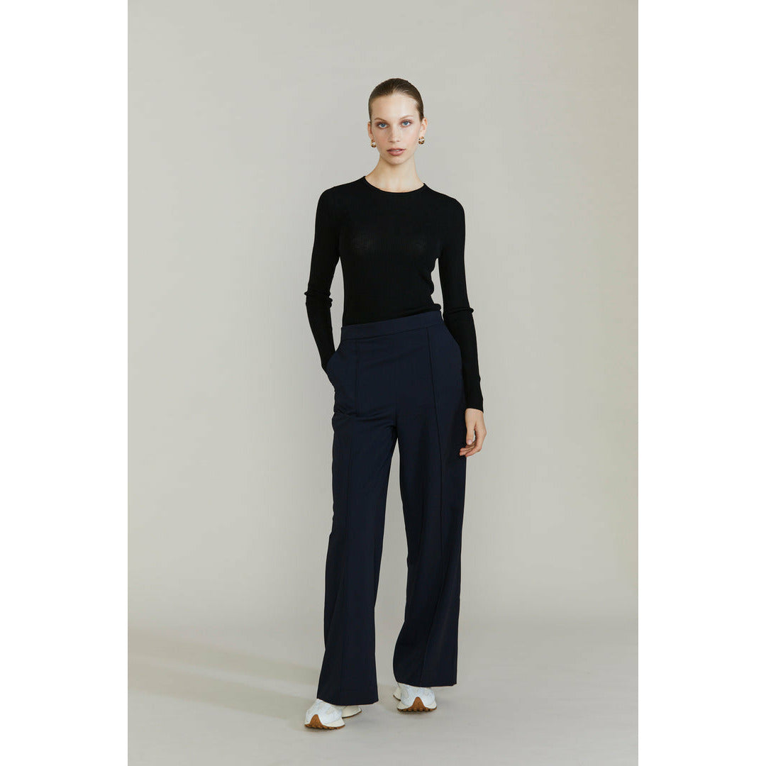 These high rise, pull-on pants feature a wide leg that falls from the hip with pin stitch detail down the front to elongate the leg. Cut from a drapey rayon blend fabric, they have a flattering flat front with a refined elastic waist.