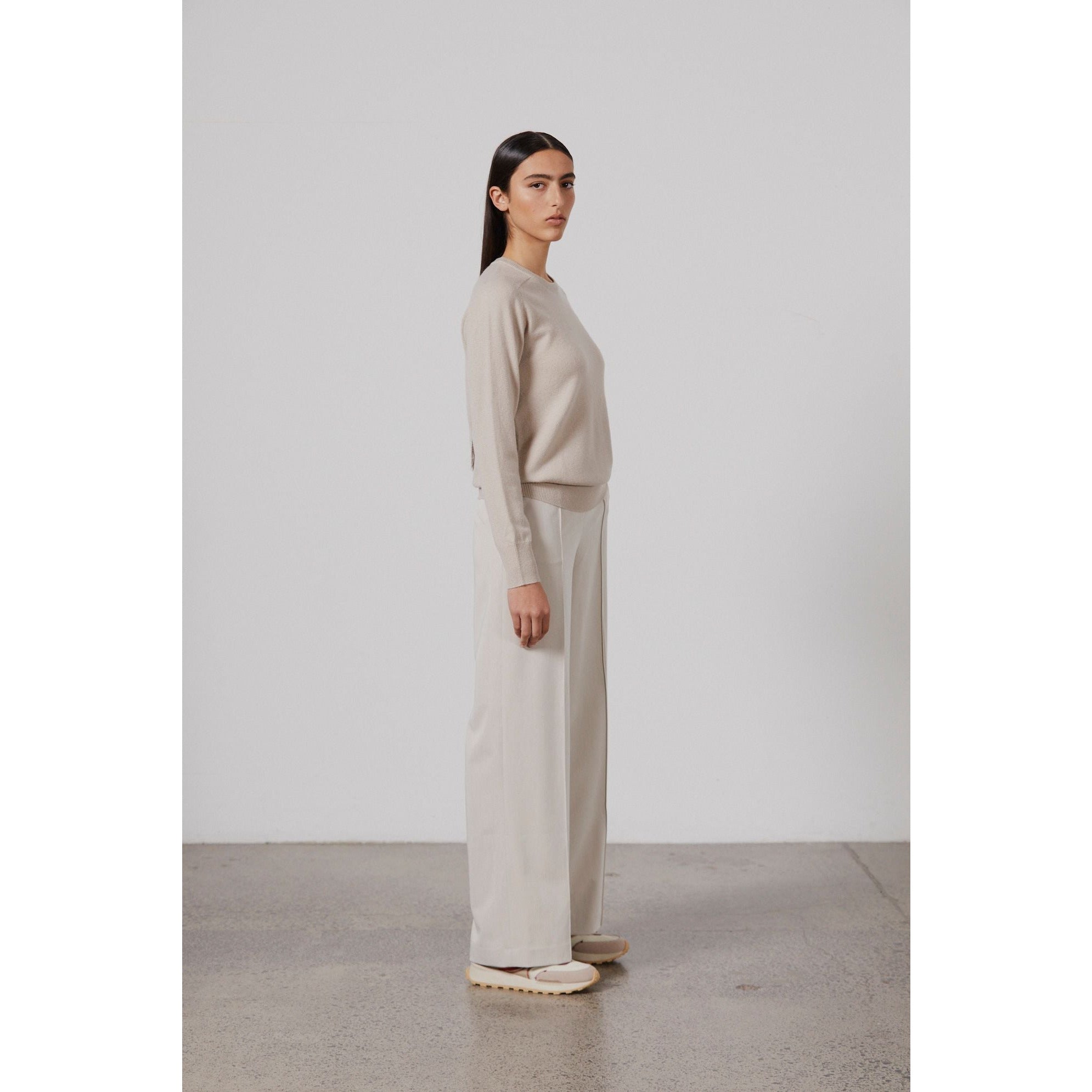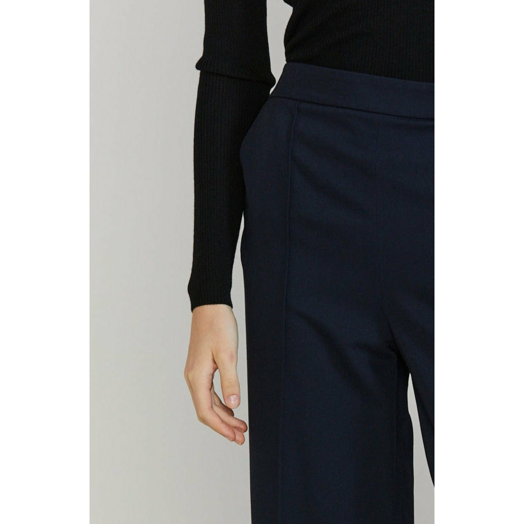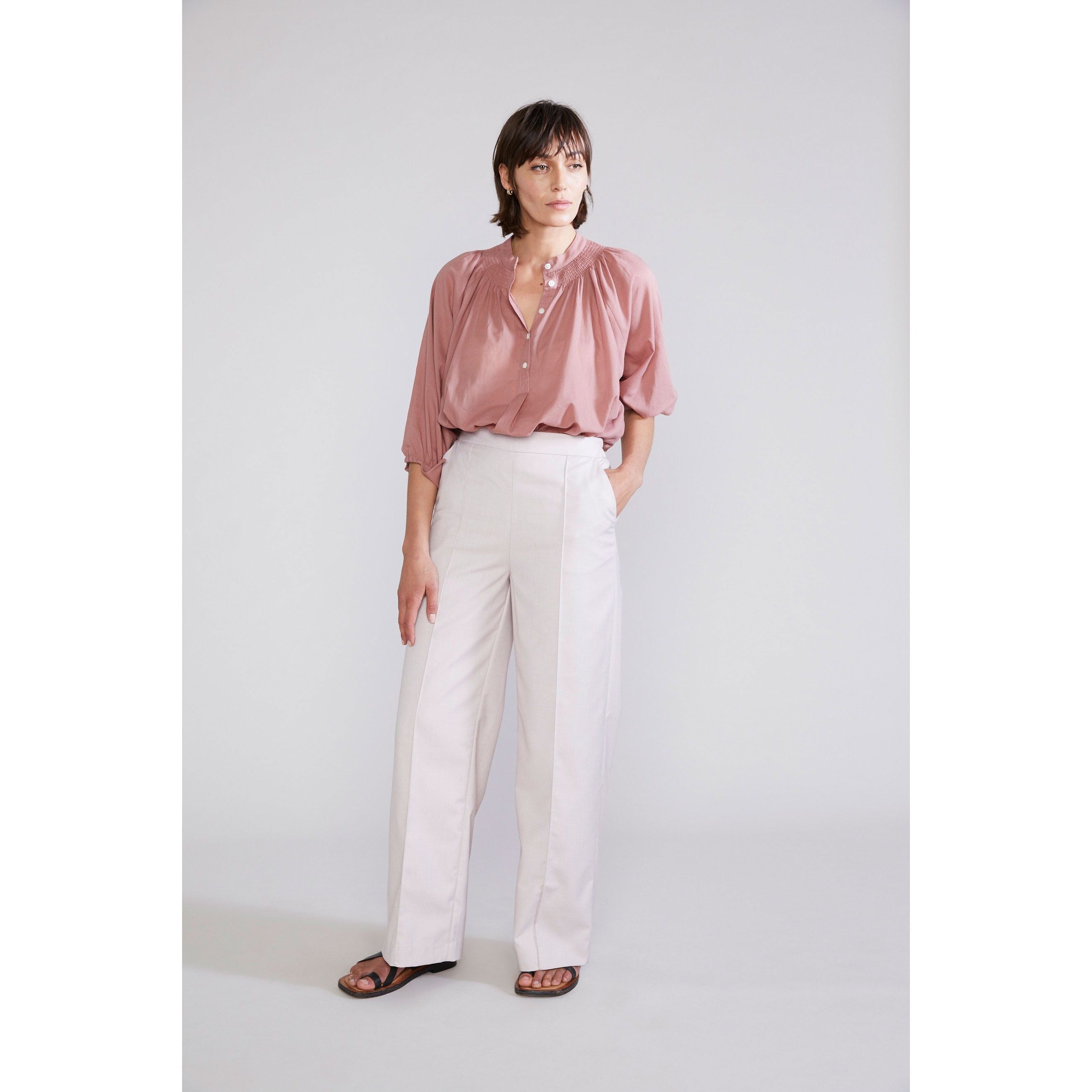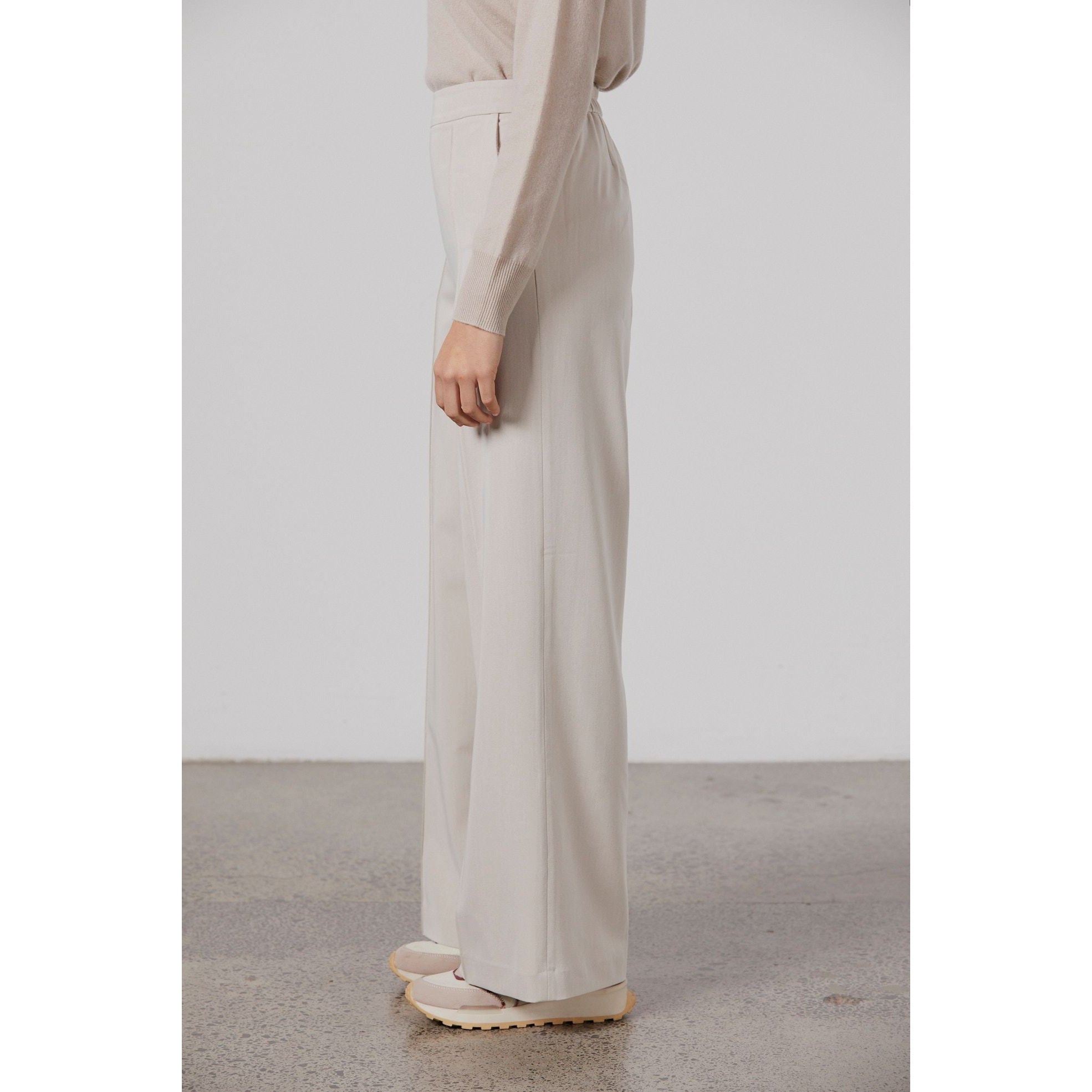 These high rise, pull-on pants feature a wide leg that falls from the hip with pin stitch detail down the front to elongate the leg. Cut from a drapey rayon blend fabric, they have a flattering flat front with a refined elastic waist.