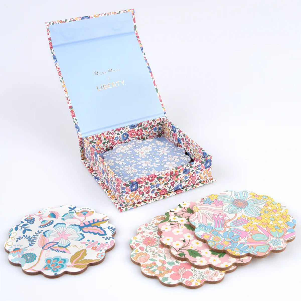 ntroducing our exclusive collaboration with Liberty, statement coasters that enhance any dining occasion or social event. Each set includes six different floral Liberty print designs, teamed with a scalloped edge for a sophisticated look. These coasters are made from composite wood, and backed with cork, for durability without compromising on style. Ideal for coffee parties, afternoon tea, dinner parties or family meals, to add refinement to your table setting or coffee table. They're packaged in a floral print reusable gift box, ideal for storage and make a wonderful host gift too.