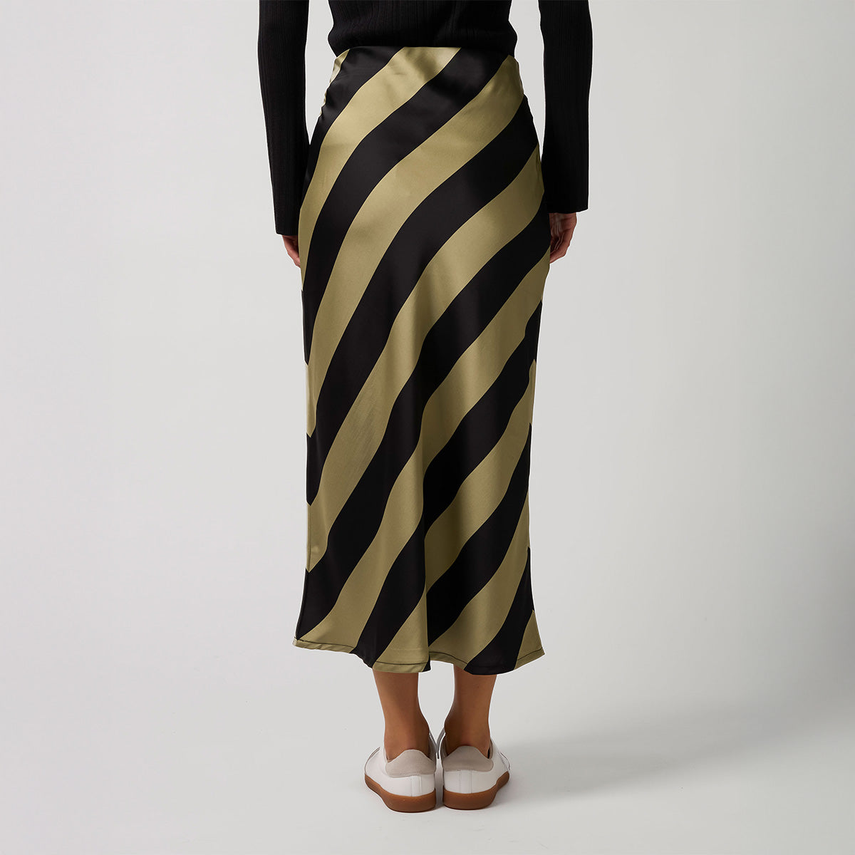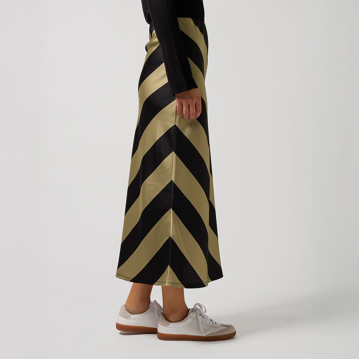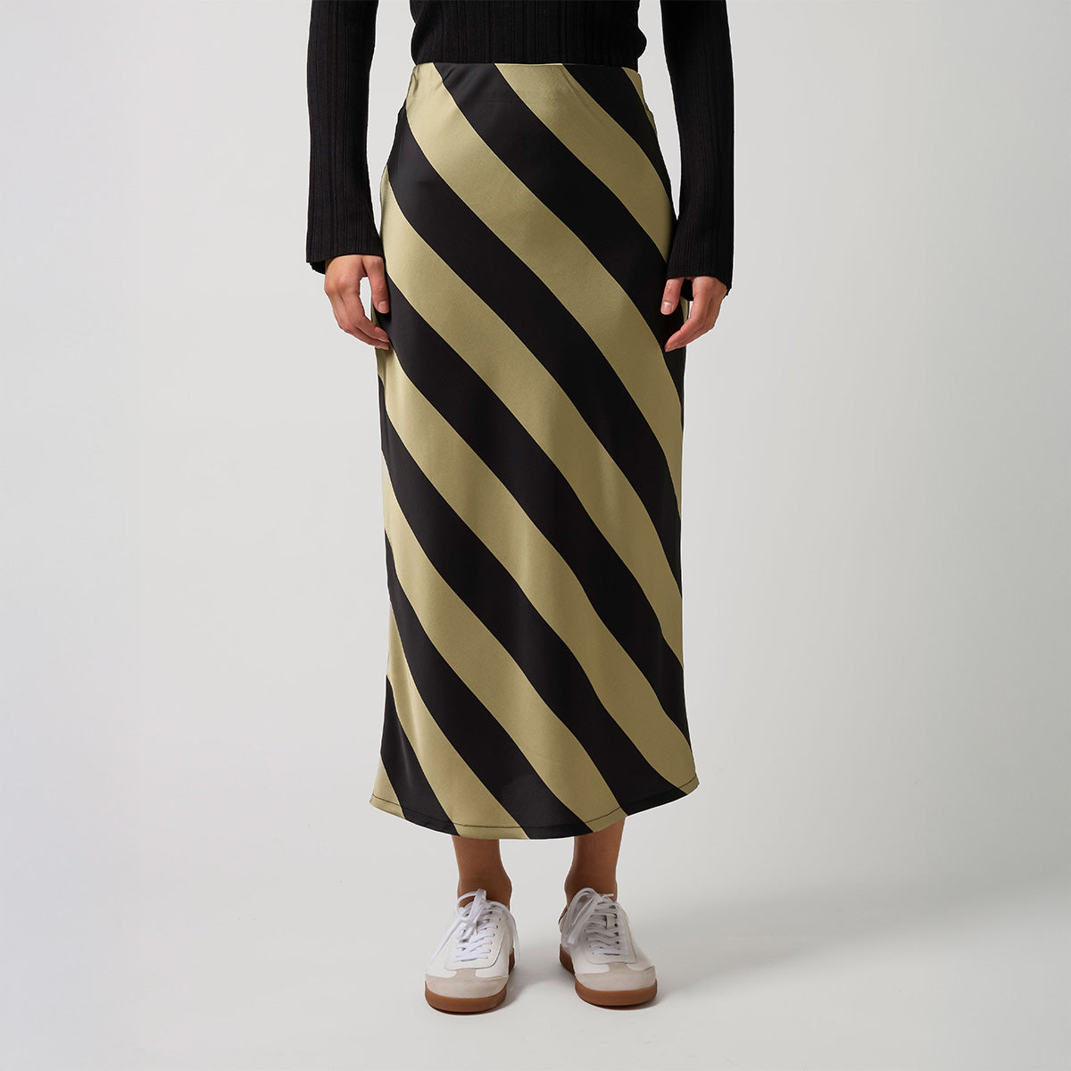 Bias cut ankle length skirt in bold diagonal stripe. Concealed elasticated pull on waist.