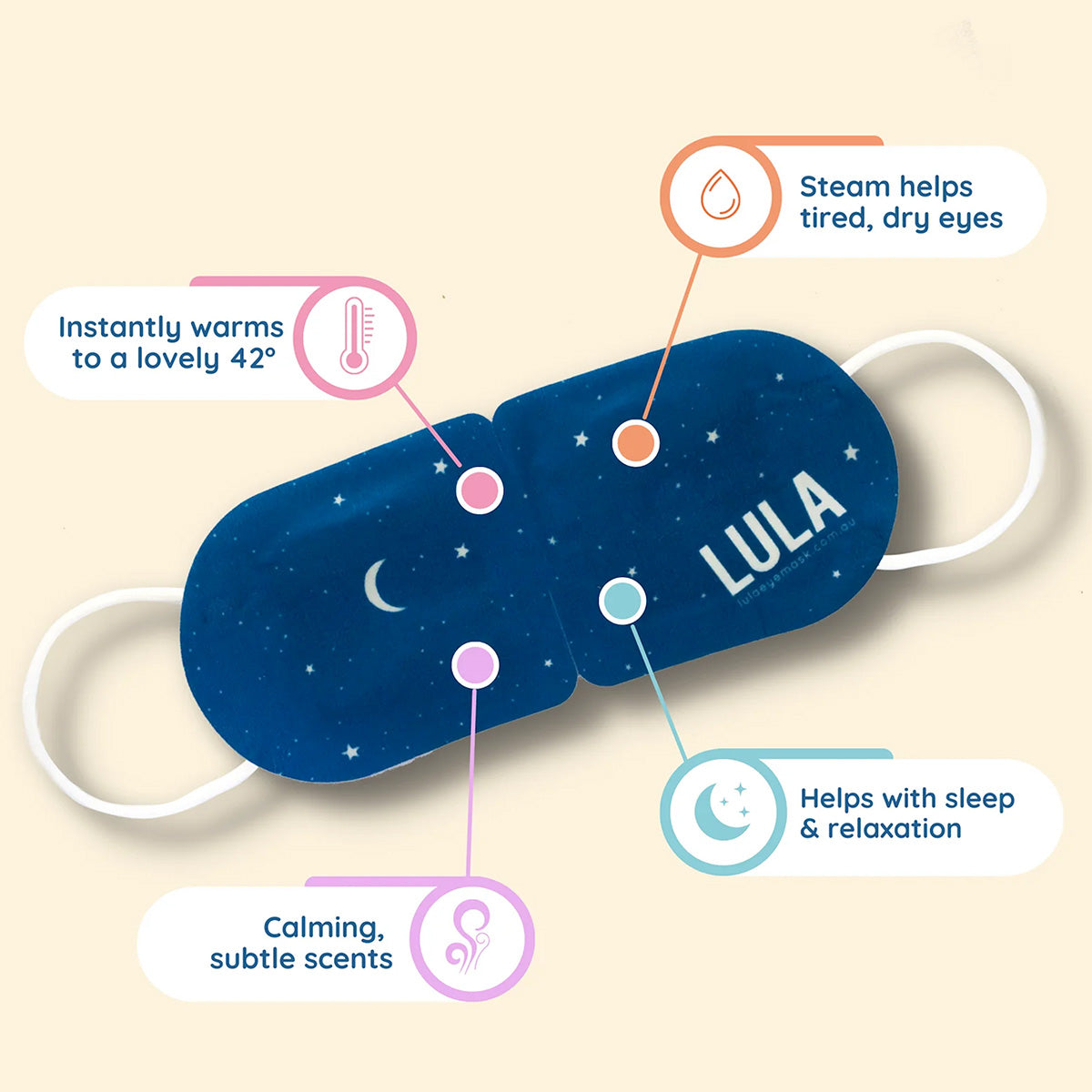 A good night's sleep Putting the warming eye mask on before you sleep is a great way to force yourself to not have screen time just before you sleep. The darkness and warmth provides a great foundation for a good night’s sleep by helping you drift off calmly.
