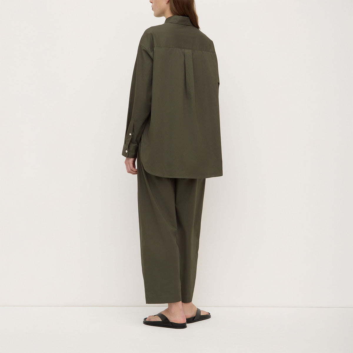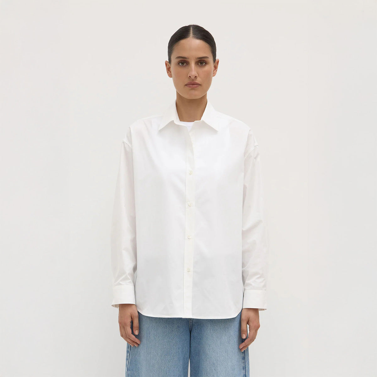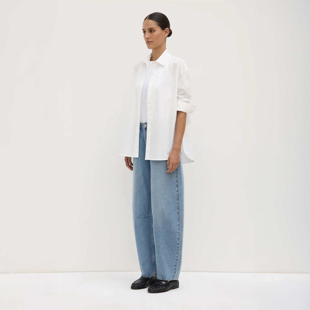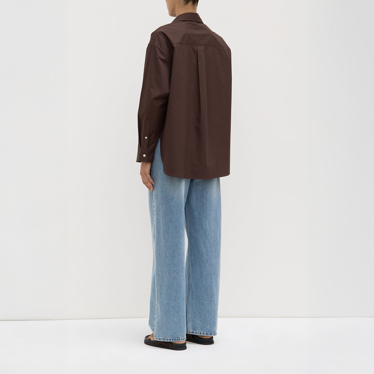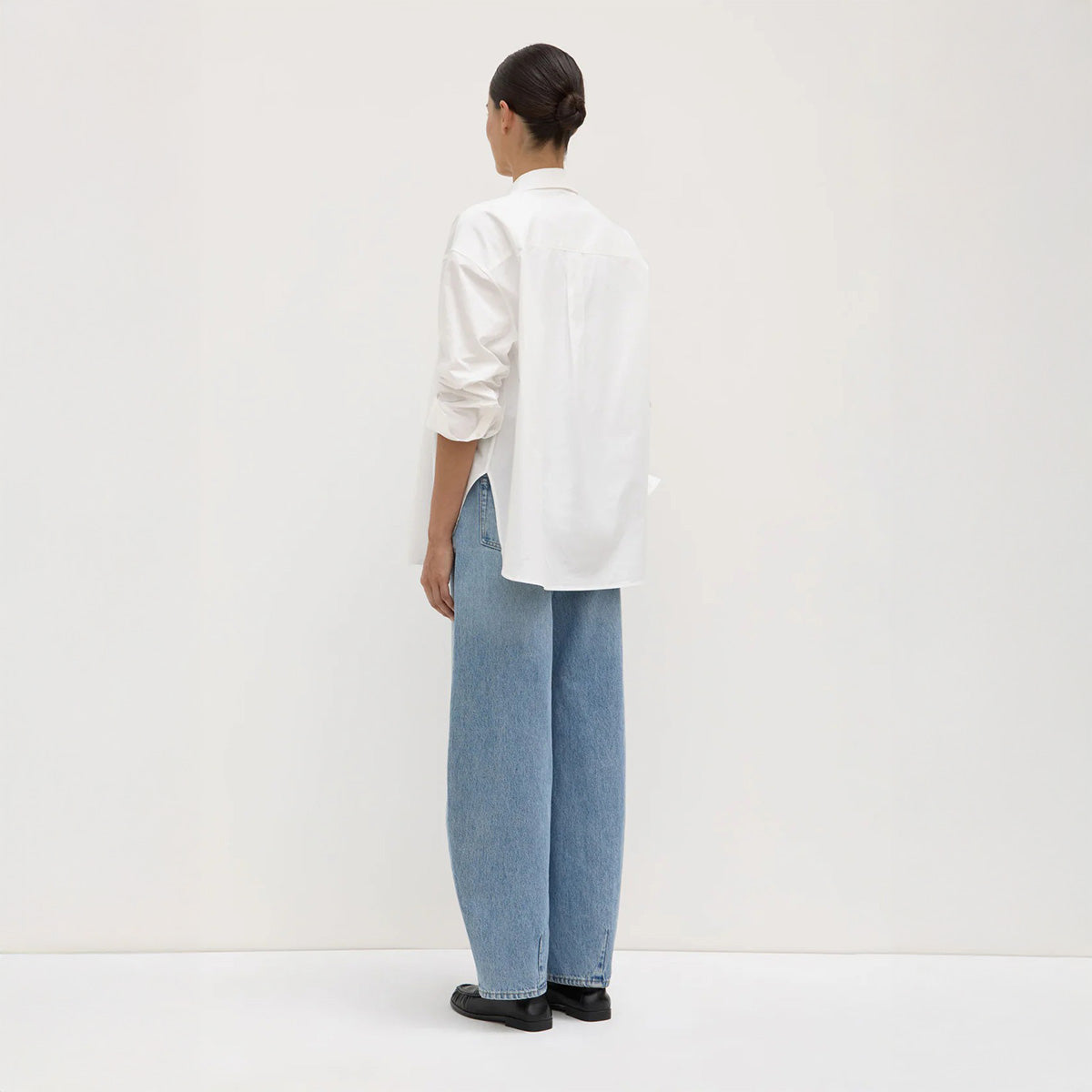 Longline cotton poplin shirt cut in a relaxed silhouette. Features a shaped hem, single button cuffs and double yoke pleat detail.