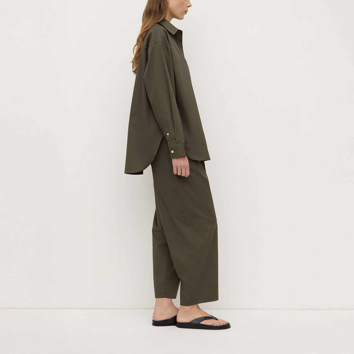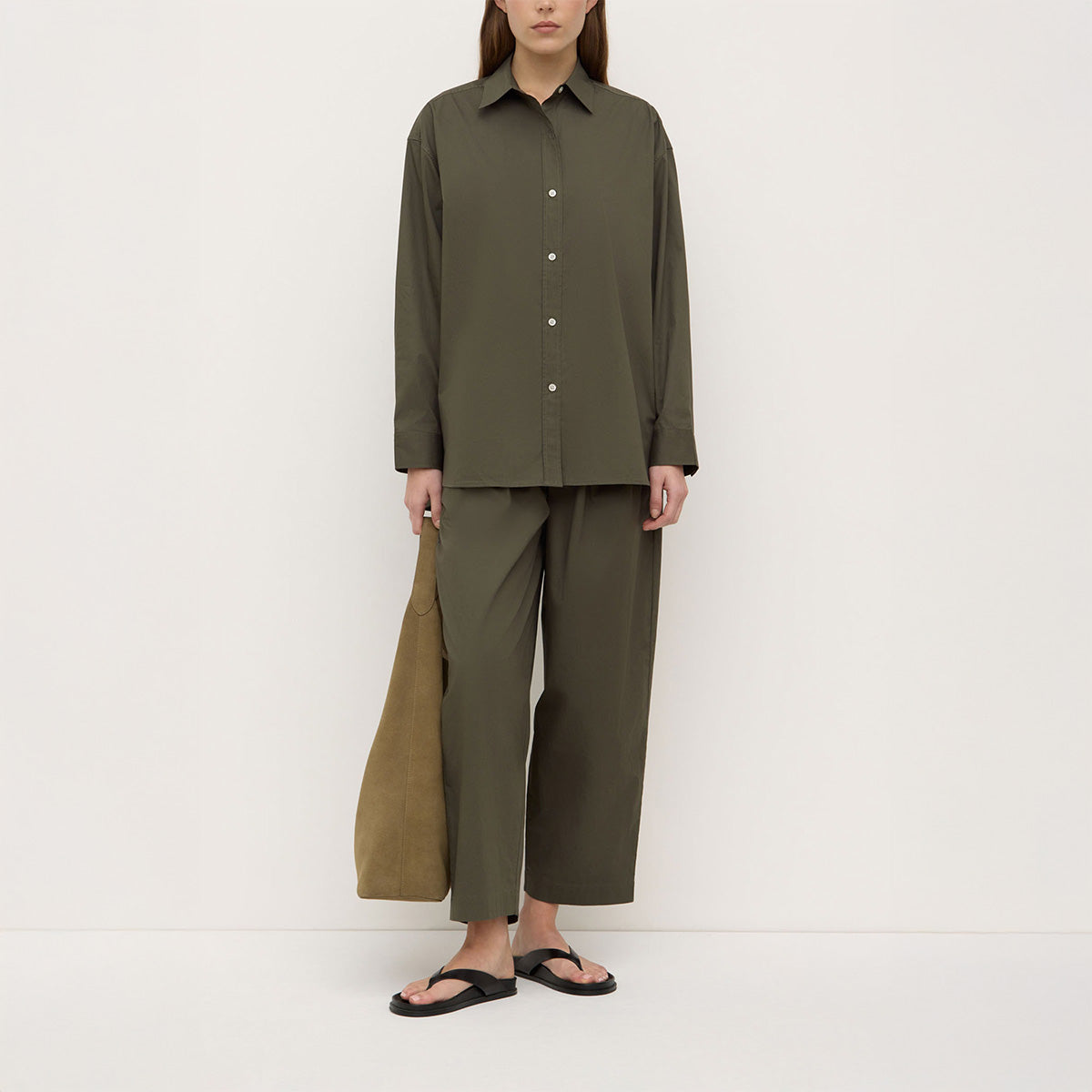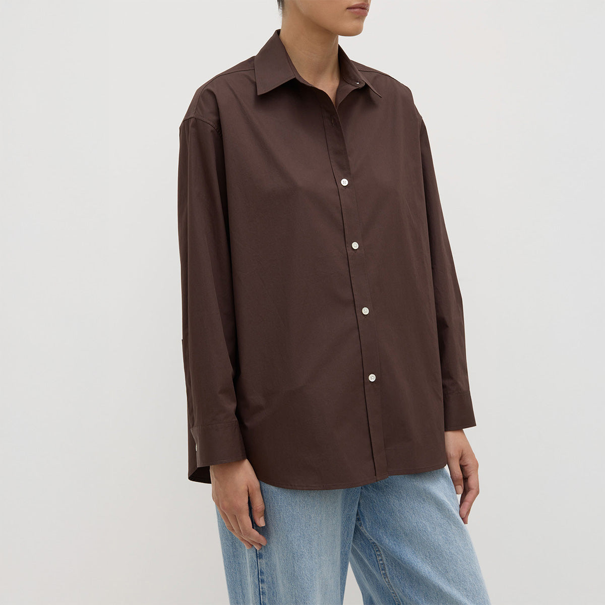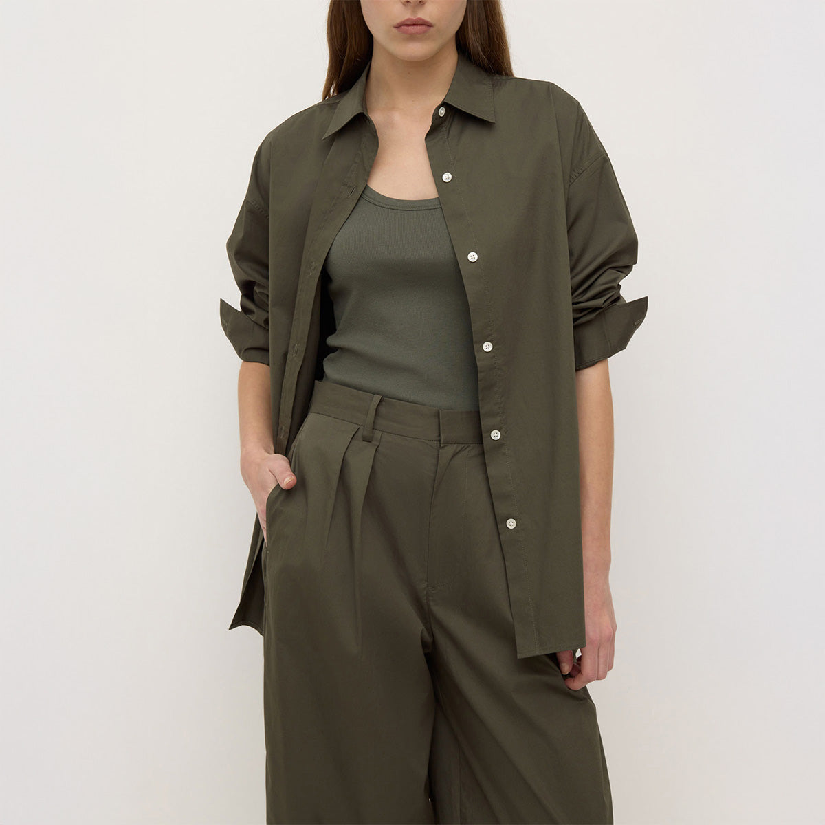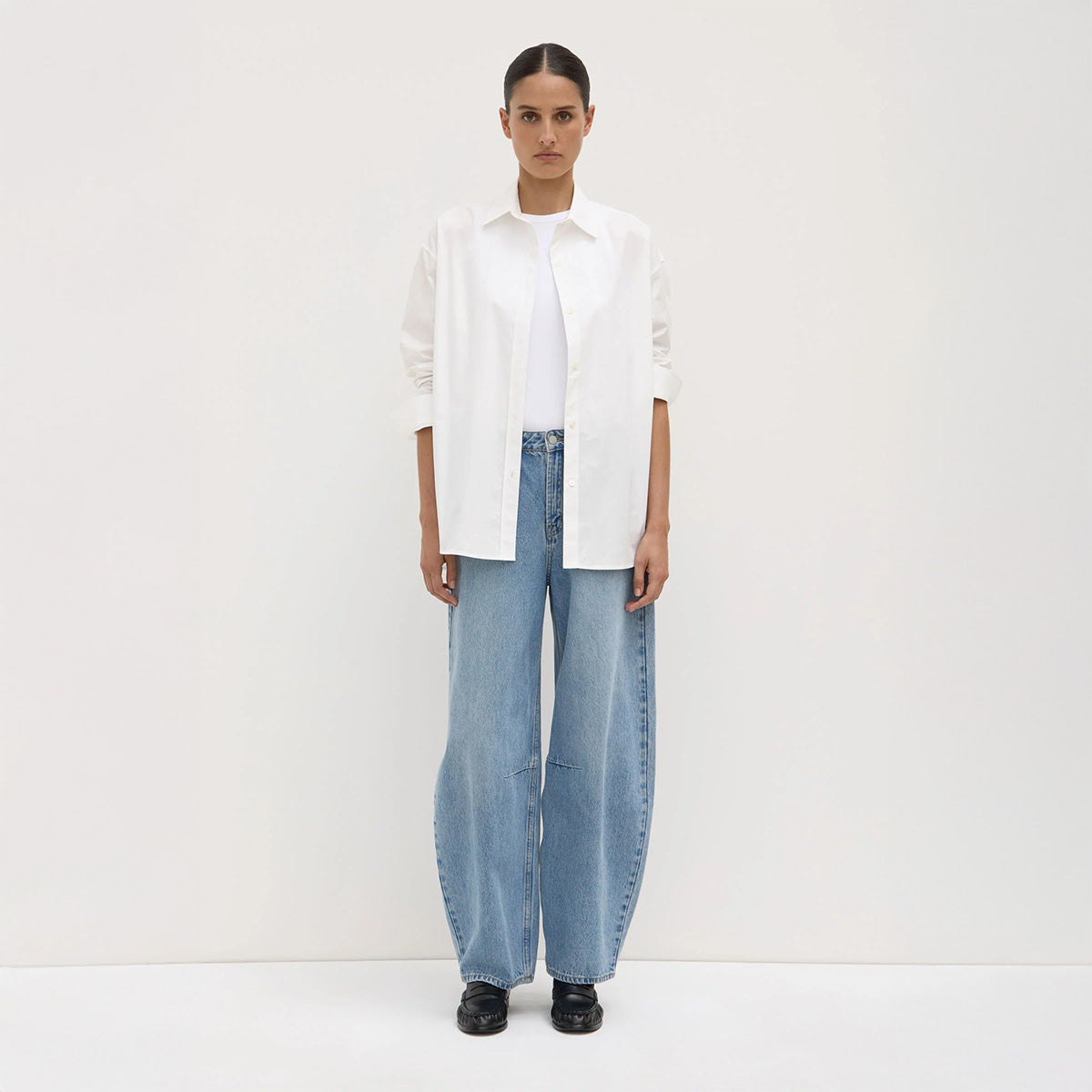 Longline cotton poplin shirt cut in a relaxed silhouette. Features a shaped hem, single button cuffs and double yoke pleat detail.