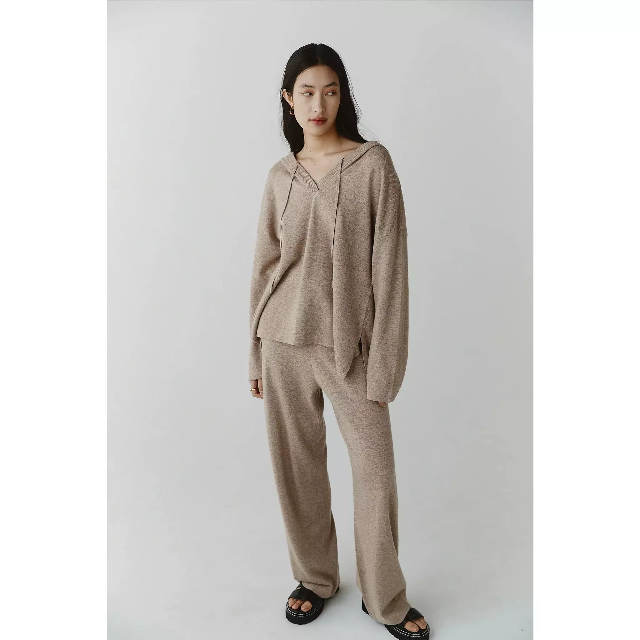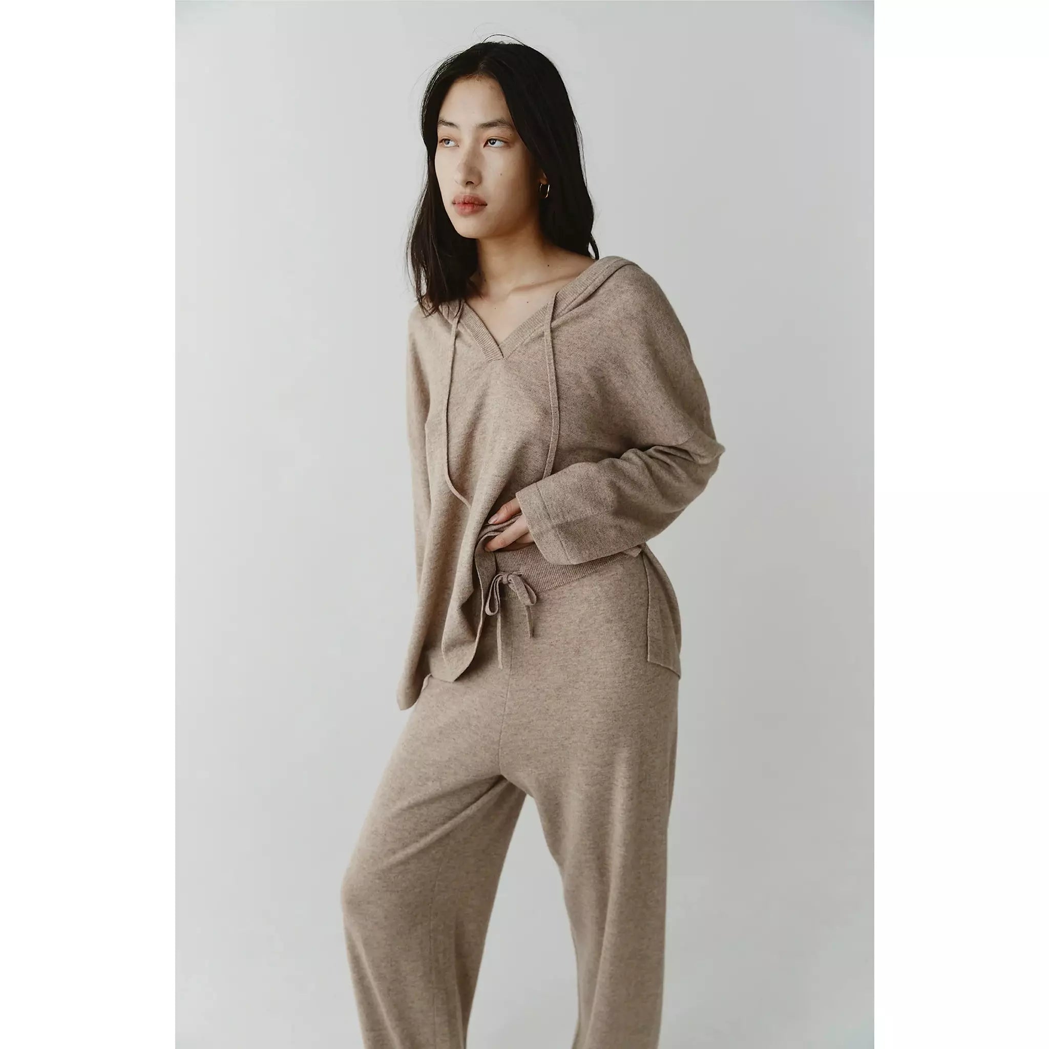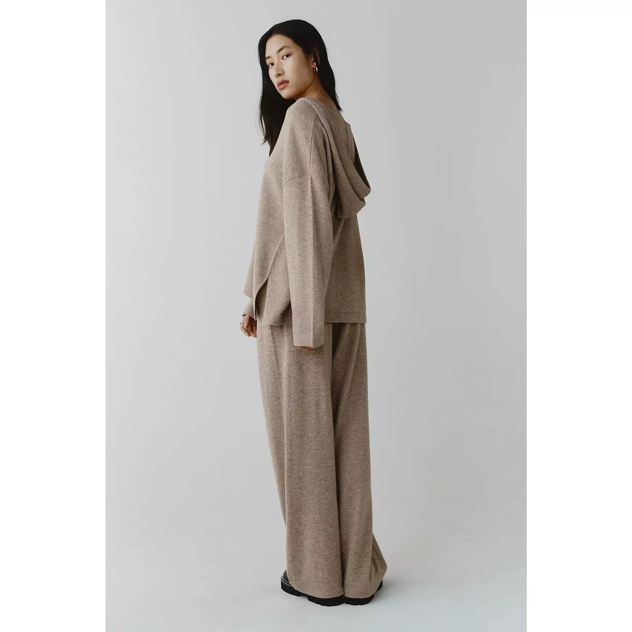 The Bria Pant are knitted in a wool / cashmere yarn. They are a full-length pant with a wide leg and sit on an elasticated waistband with a drawstring closure.