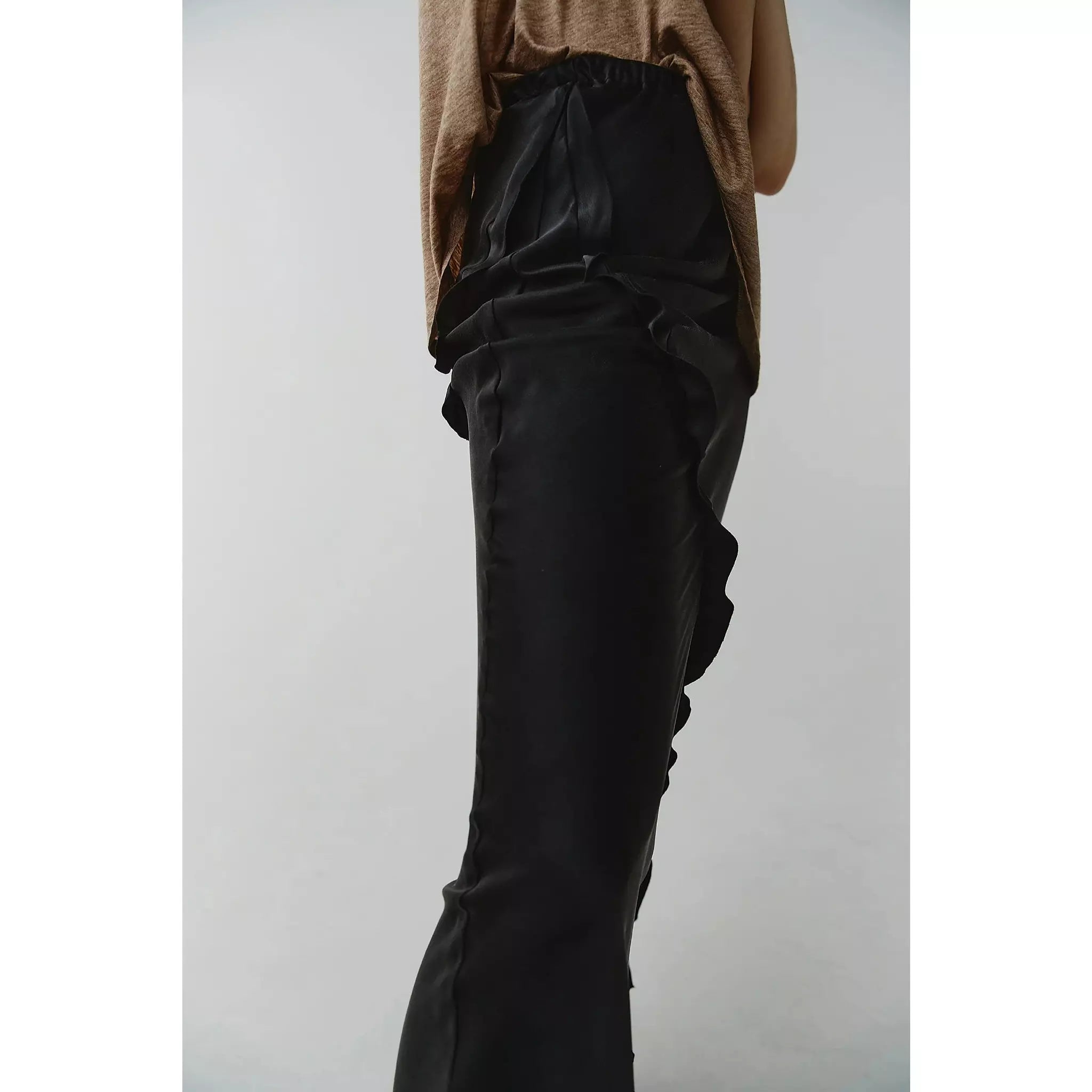 The Florencia Skirt is a beautifully feminine piece crafted in our signature sand-washed silk. A simple bias cut silhouette that sits on a thin elasticated waistband and elevated with the subtle addition of a raw ruffle hem detail across the front and back. This is a full-length skirt.