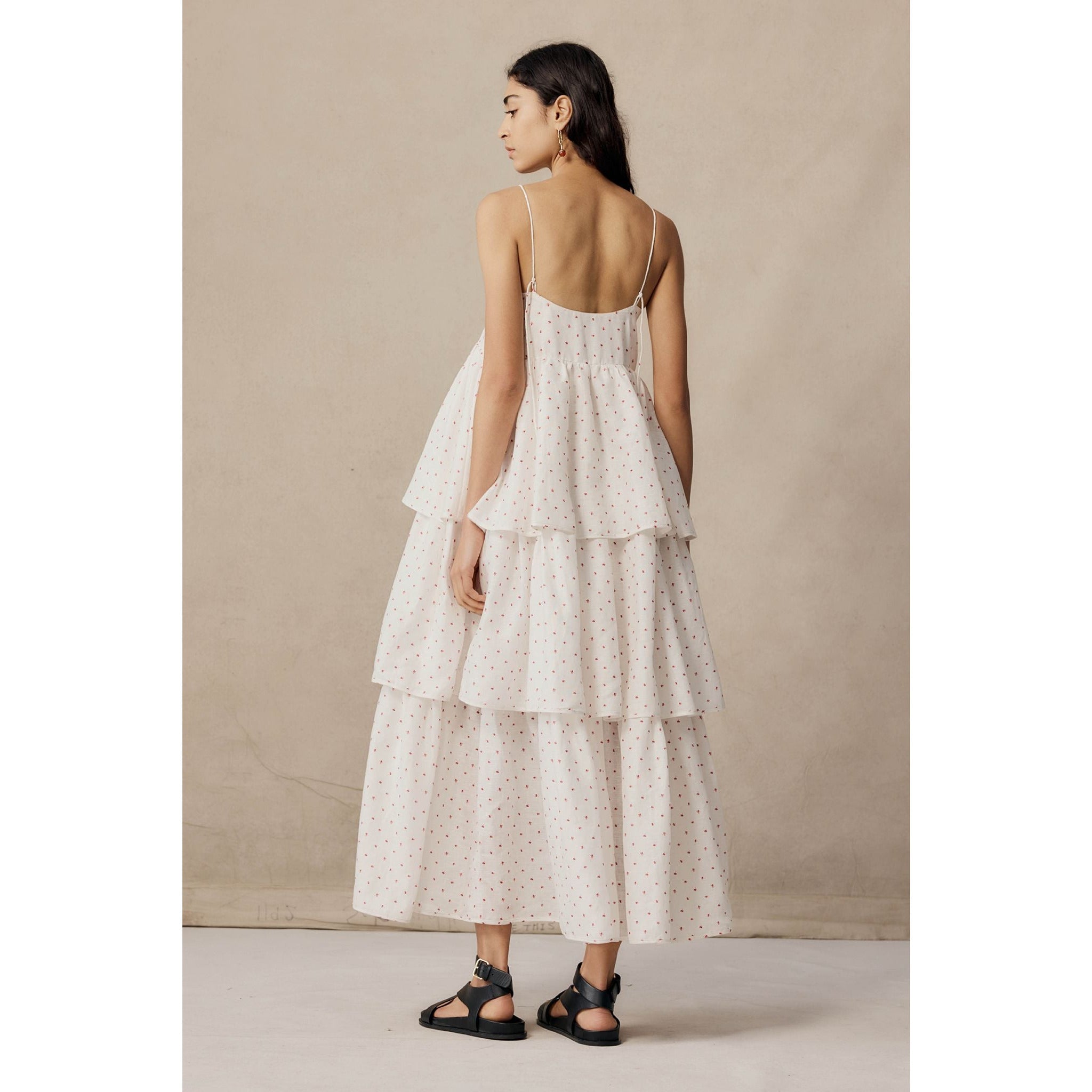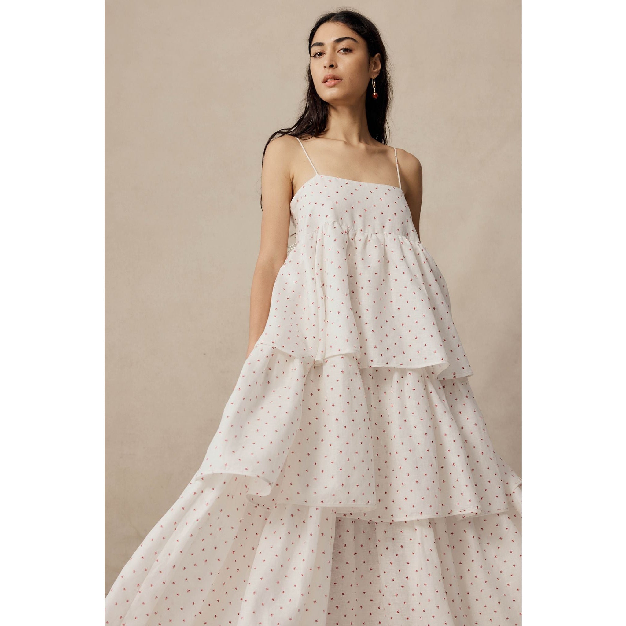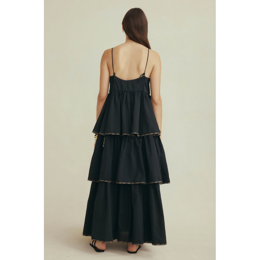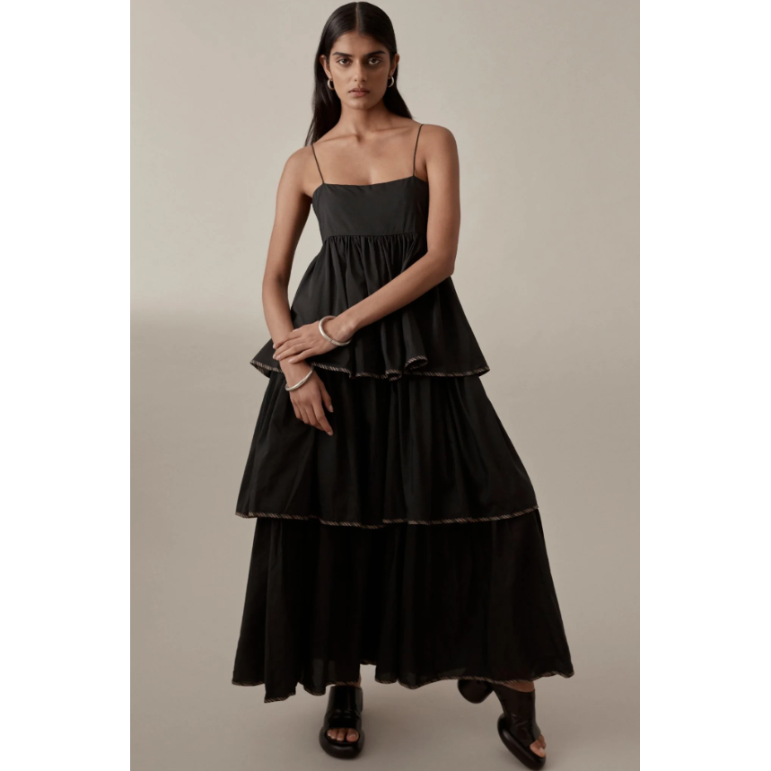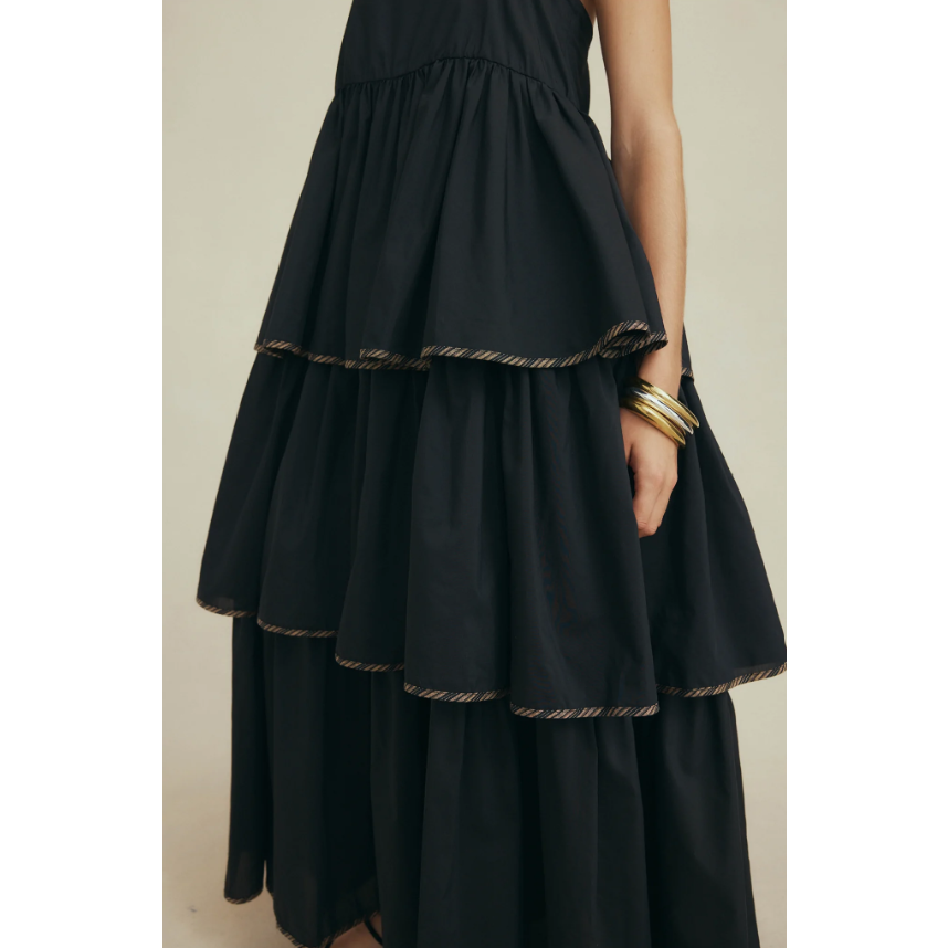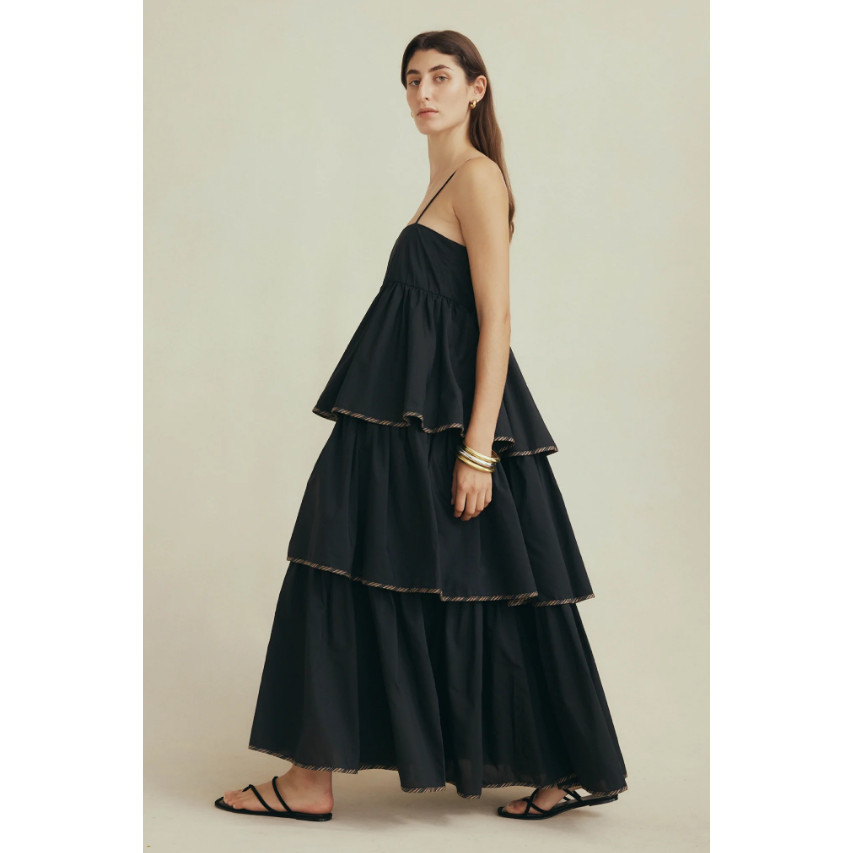 The Franca Dress is a beautifully feminine piece crafted in our signature Cotton / Silk cloth. It features a square neckline and thin rouleau straps that can be adjusted for the perfect fit. This dress features three exaggerated, gathered tiers, each finished with a contrasting binding on the hem. This is a full-length dress.