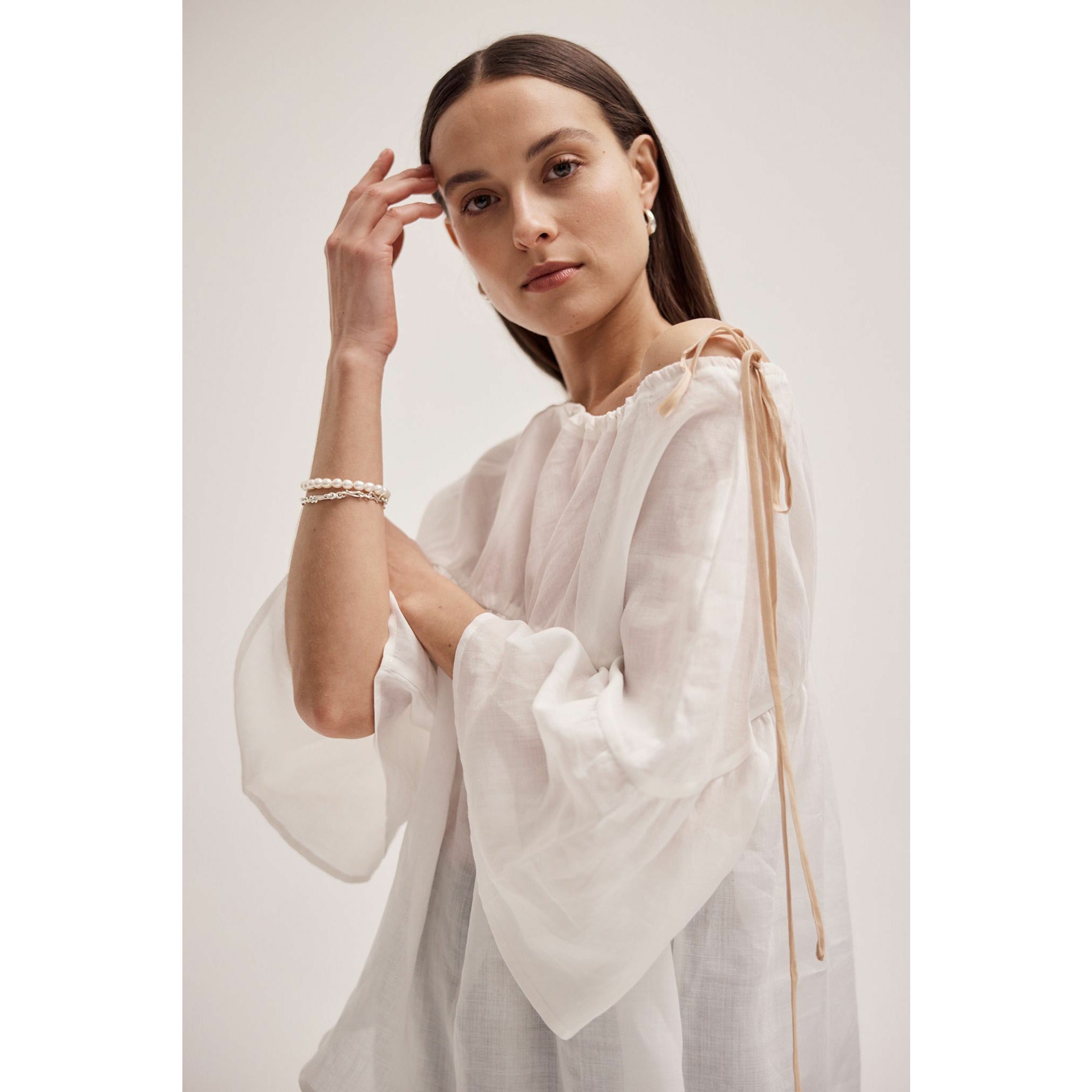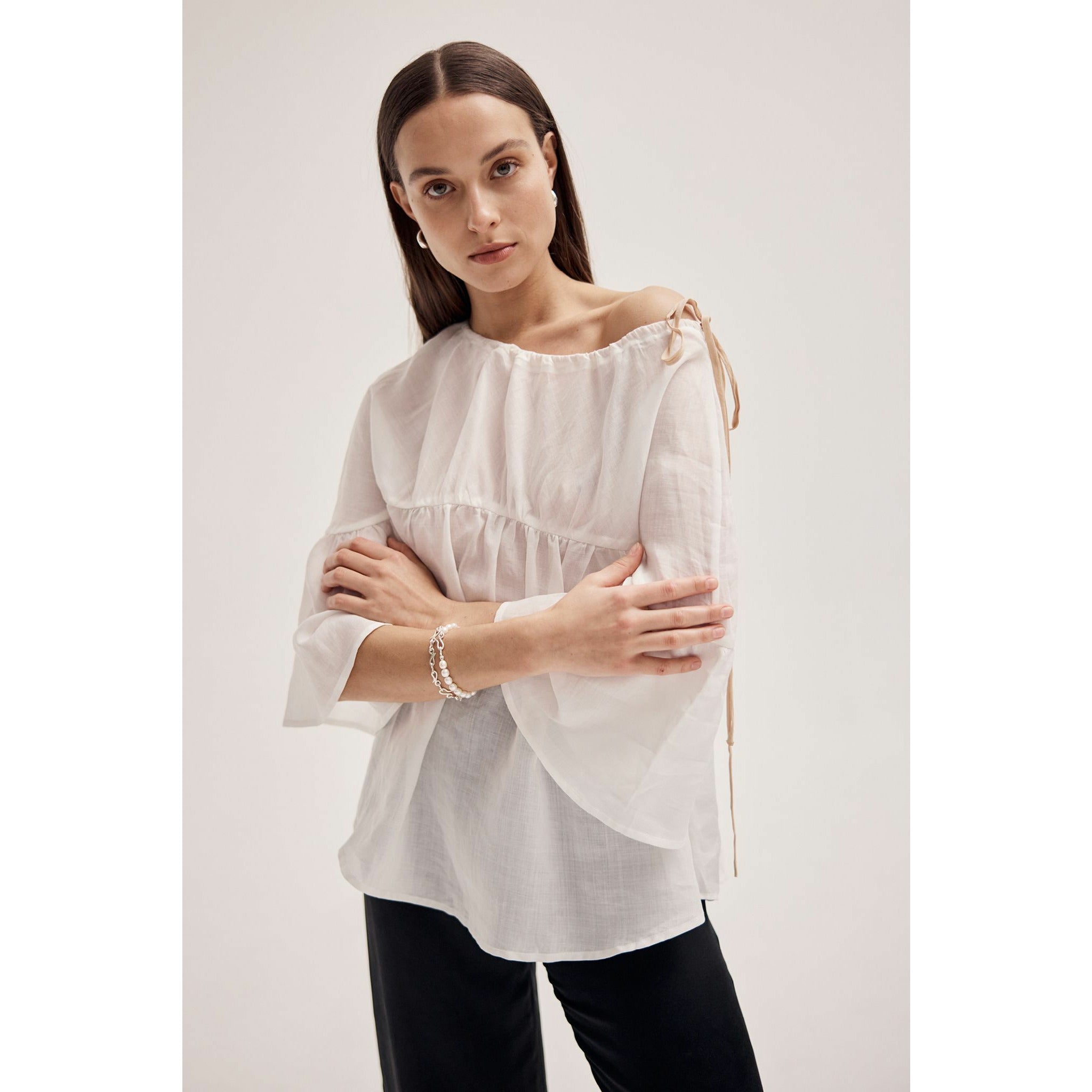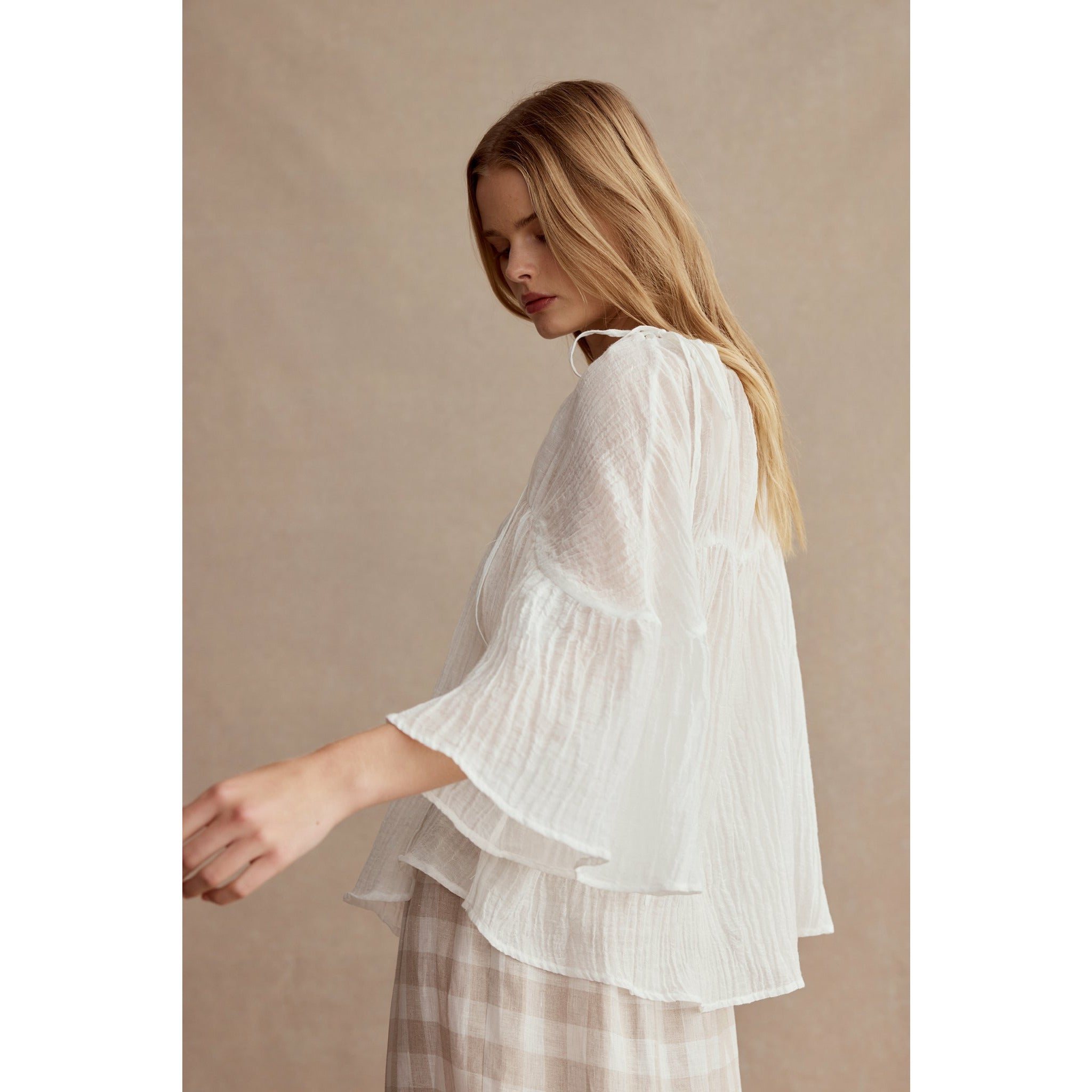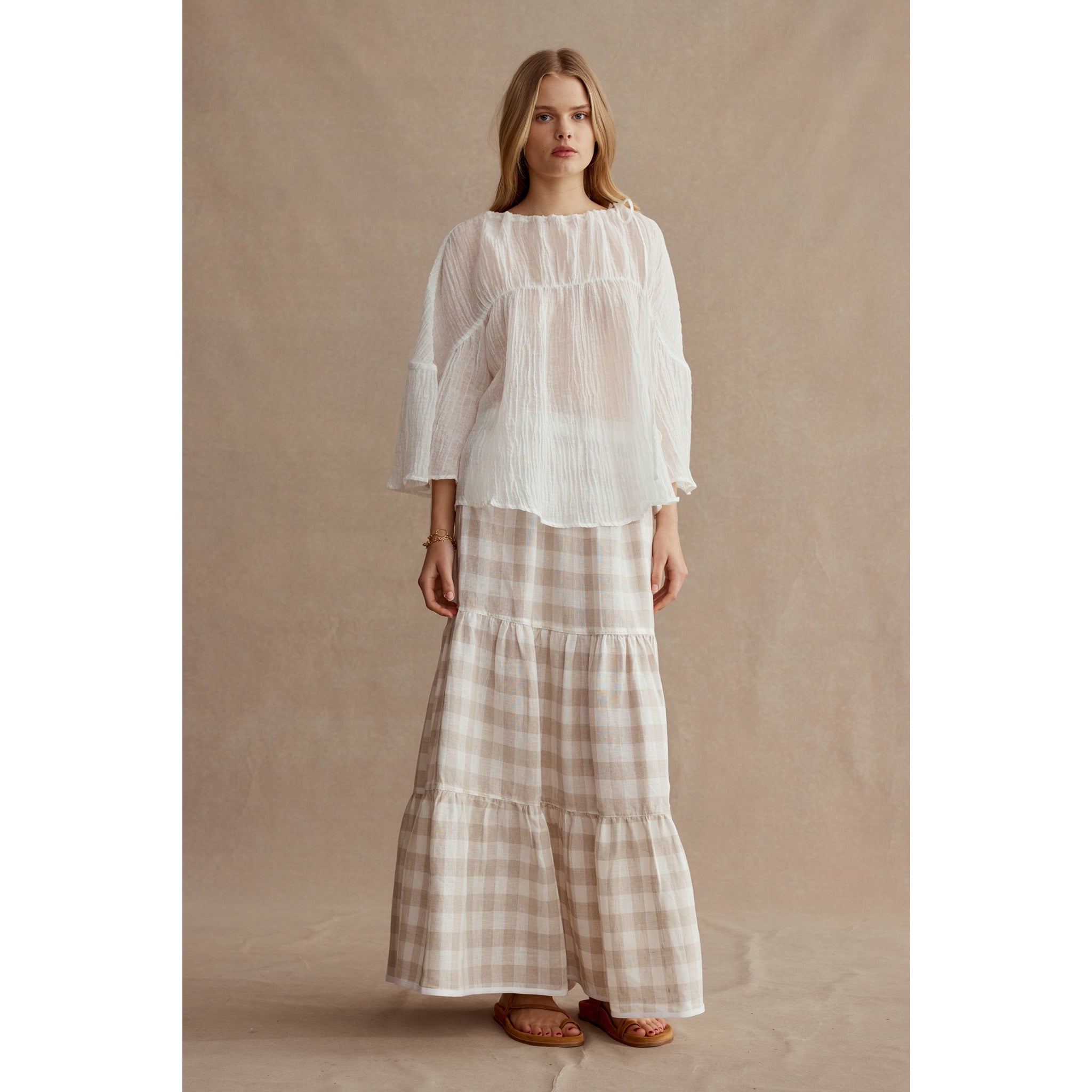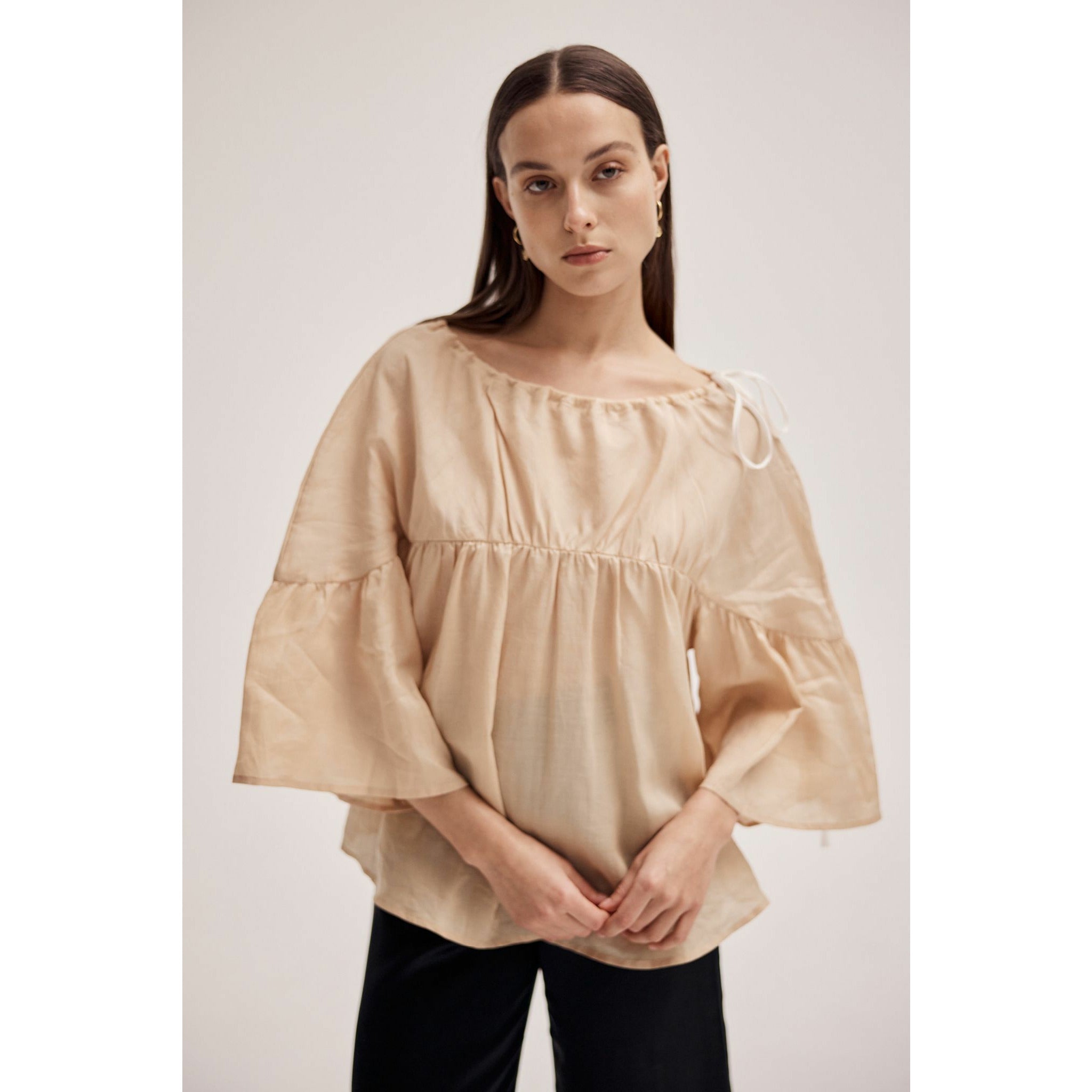 This version of the Maria Top is crafted in a lightweight, semi sheer Linen. It has the same wide gathered neckline which can be adjusted for the perfect fit and is secured by a contrasting herringbone tape tie at the side. It also has a fixed gather detail through the chest. This top has a curved hem and falls at the perfect length to tuck into your high waisted pieces or leave loose.