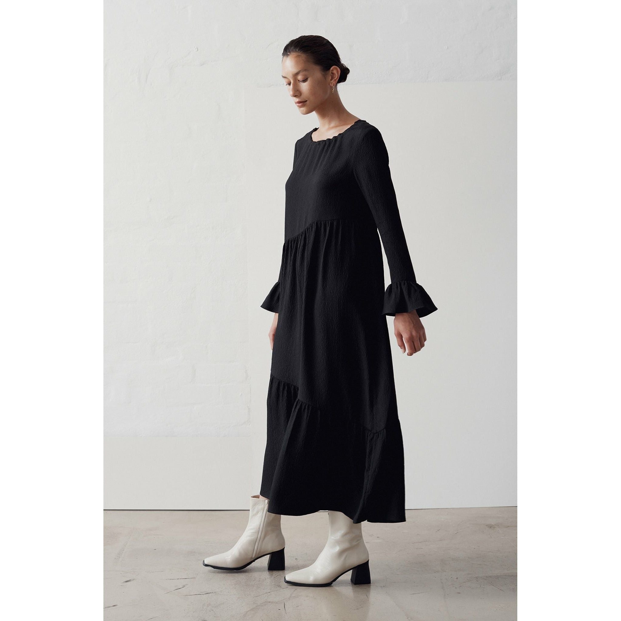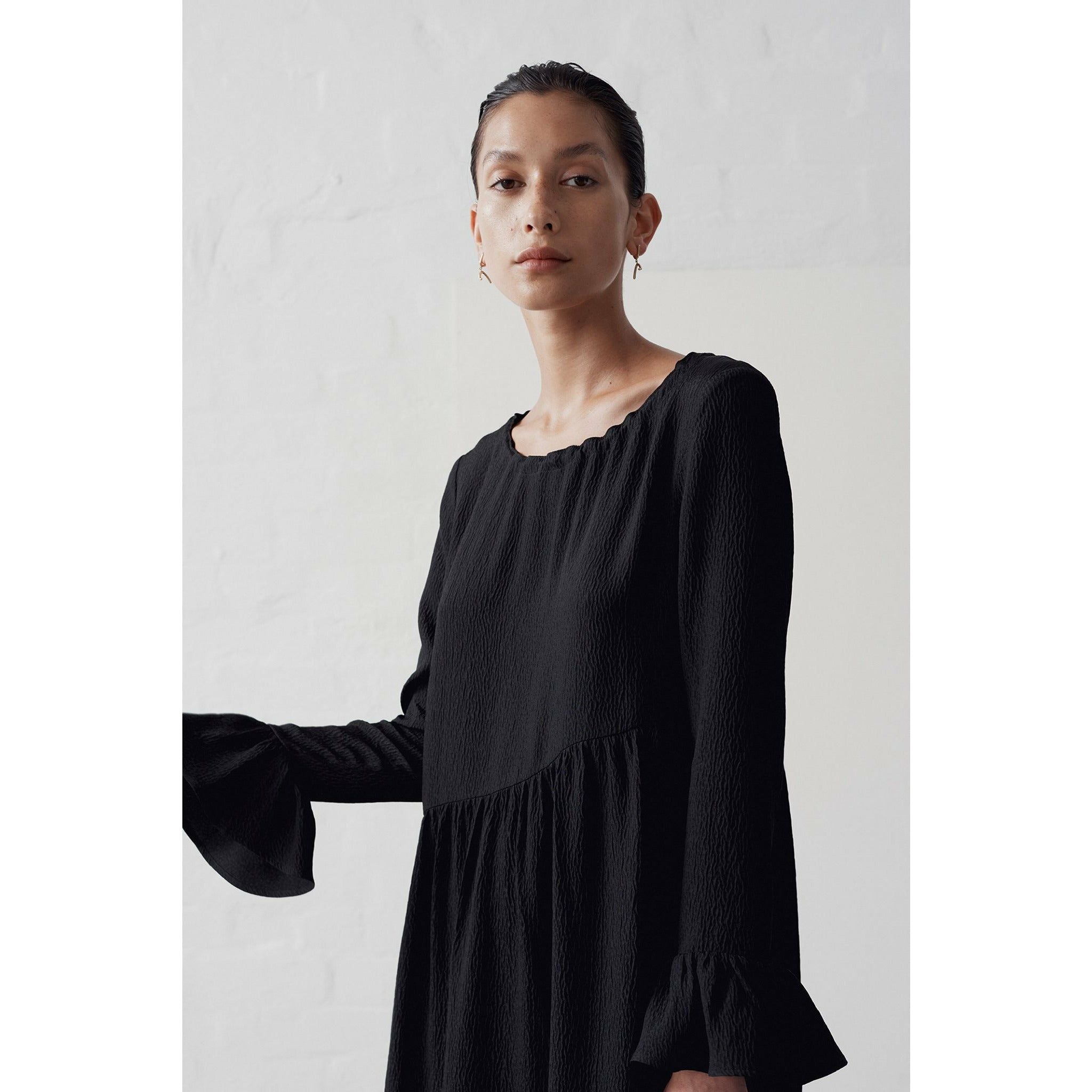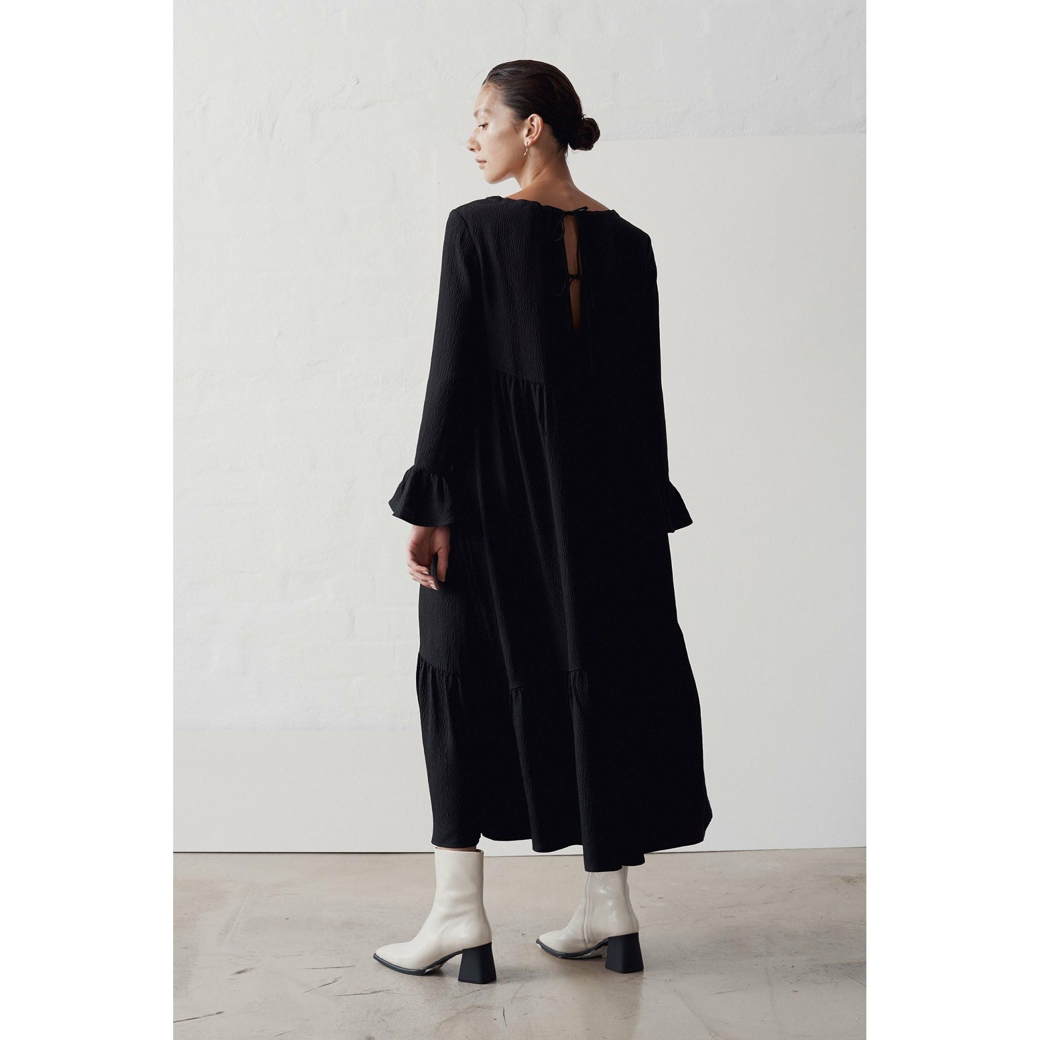 The Honor Dress is a beautifully feminine piece, crafted in a luxurious textured silk. It features a round, gathered neckline that can be adjusted using the rouleau tie at the back. This dress has two diagonal, gathered tiers and long sleeves which are an exaggerated, fluted silhouette. This dress falls at a mid-length.