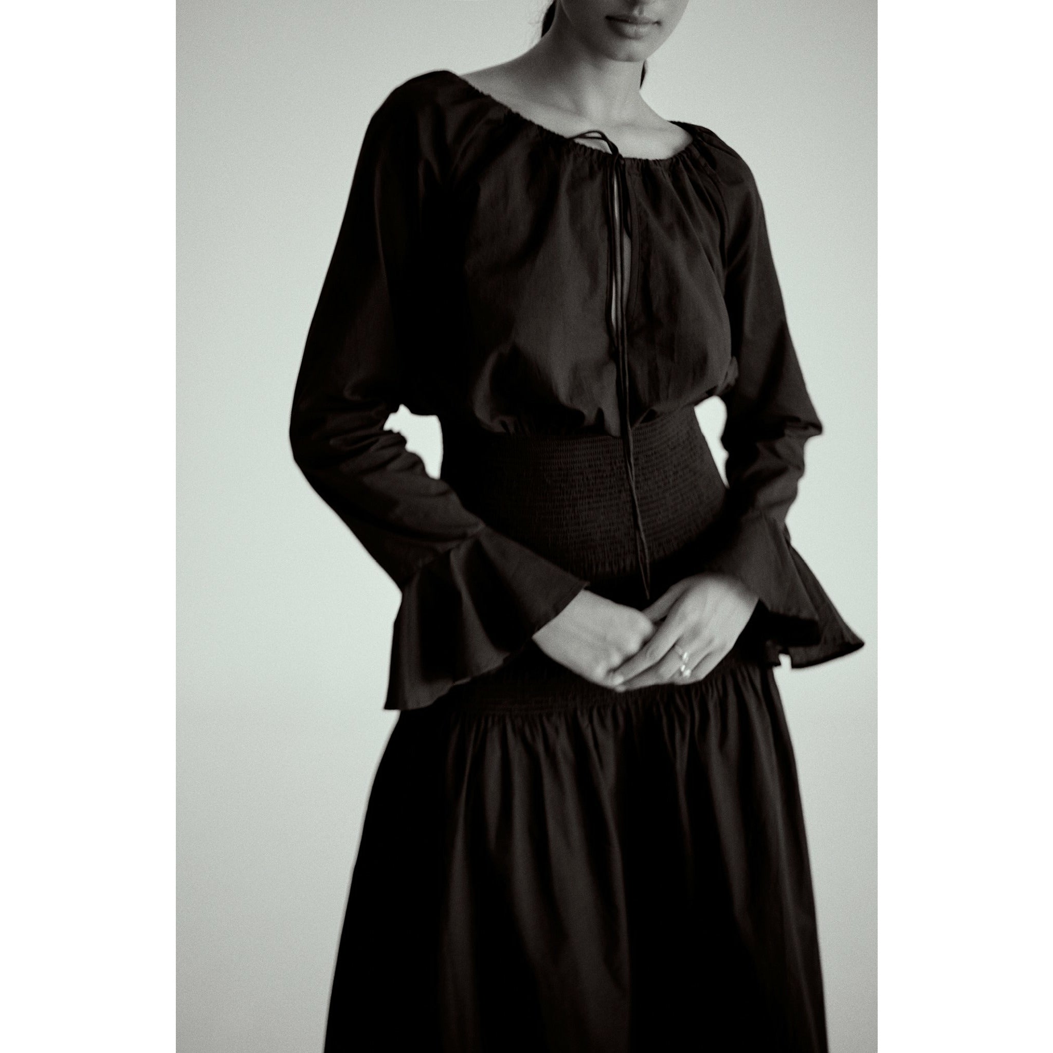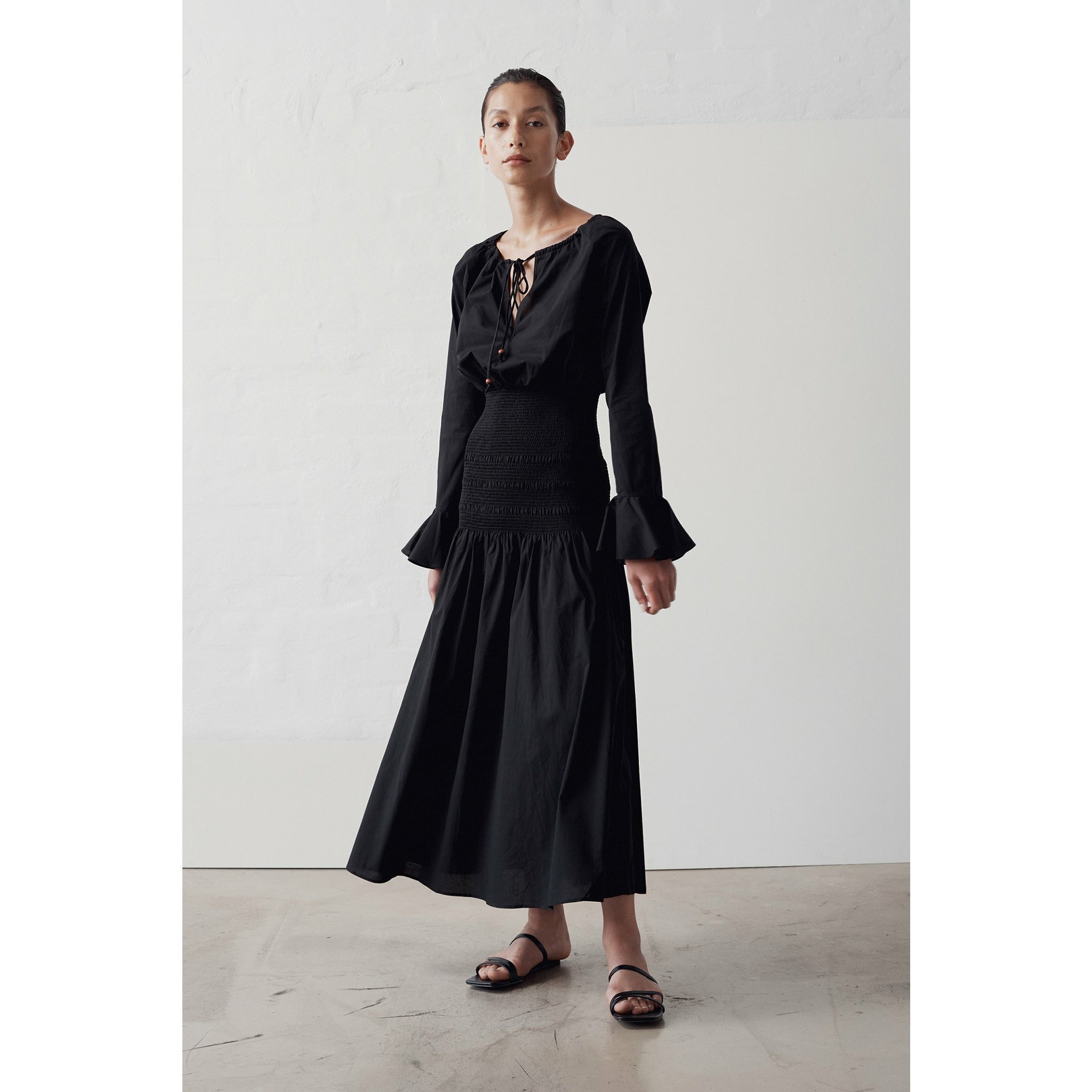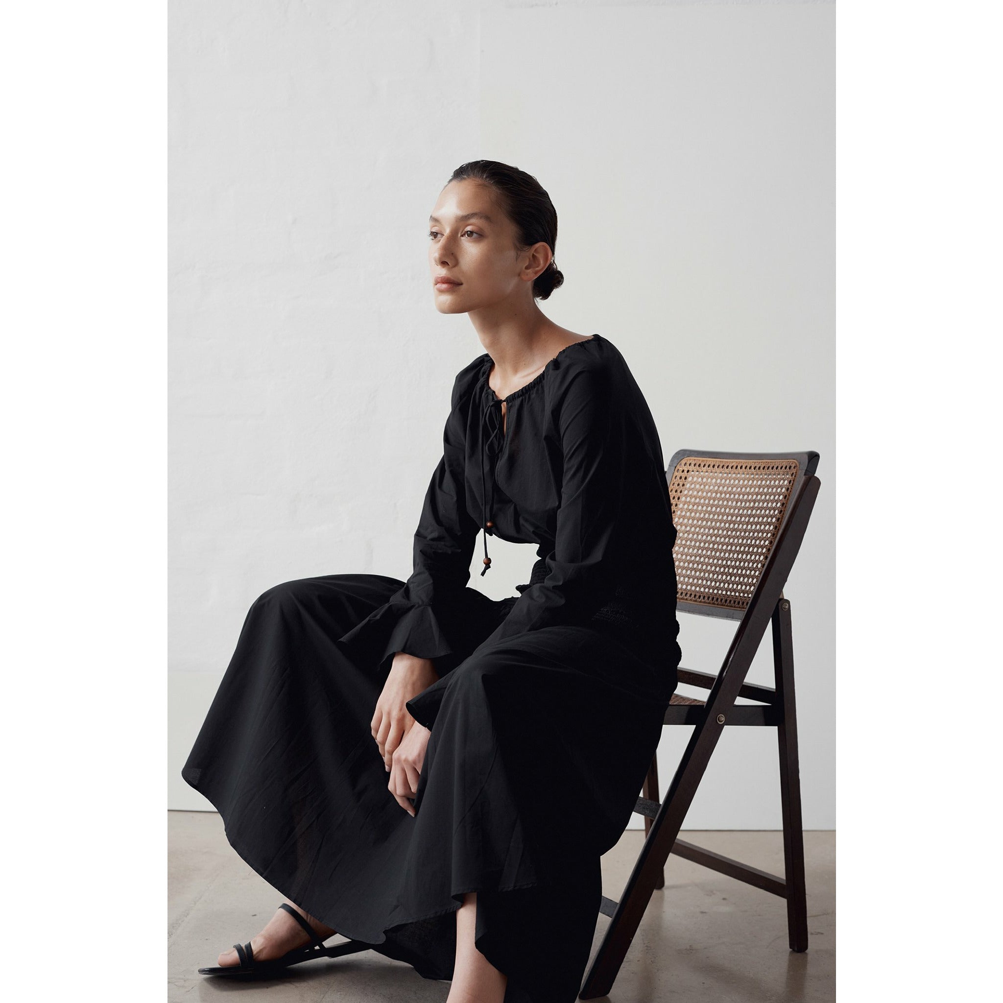 The Milan Dress is crafted in a crisp 100% cotton. It is a full-length dress with a round gathered neckline that features an adjustable tie, finished with small wooden beads. The top of this dress has a keyhole feature, relaxed fit and a shirring detail from the waist which then flows into a loose silhouette based off of our Janelle Skirt. This dress has long sleeves that are finished with a flared cuff.