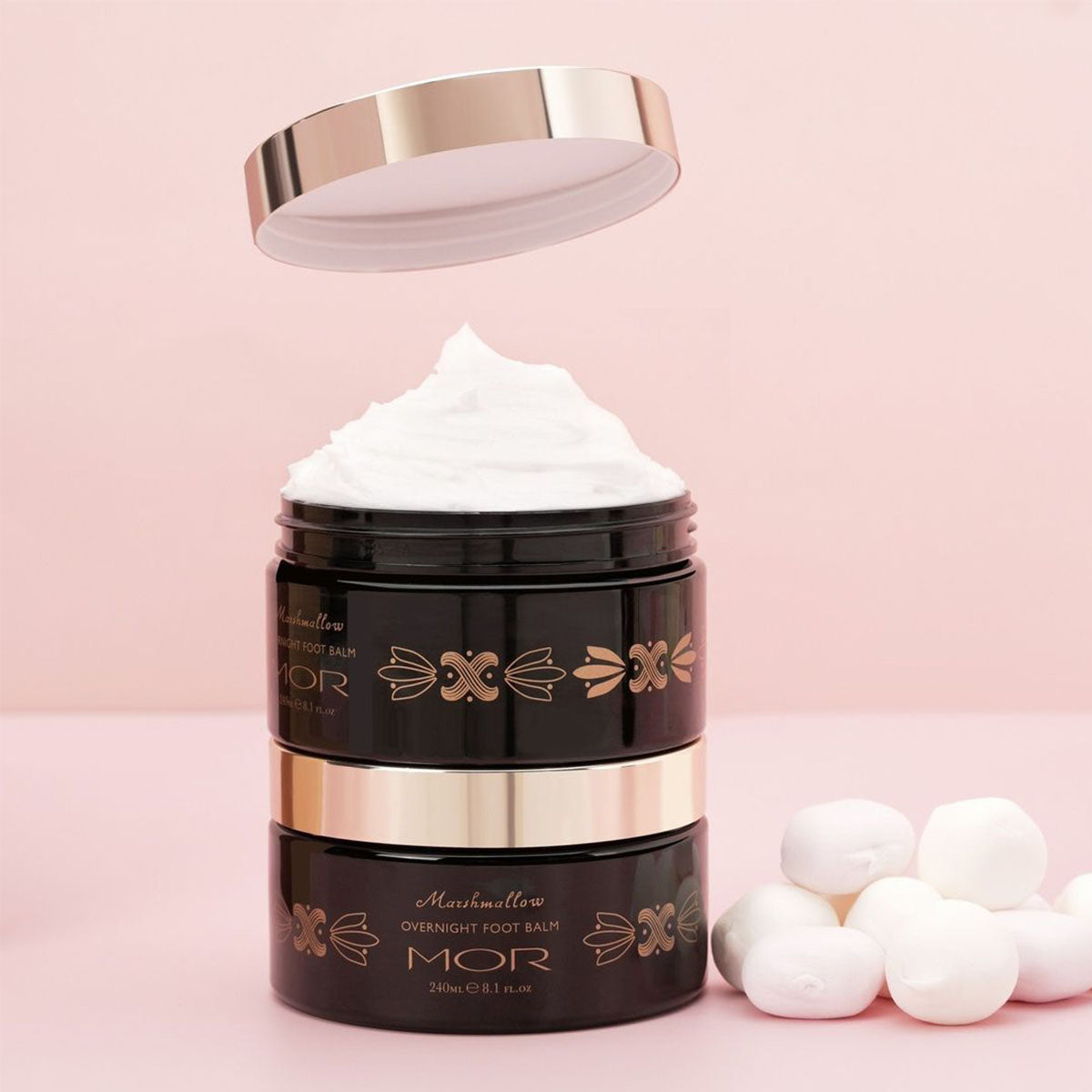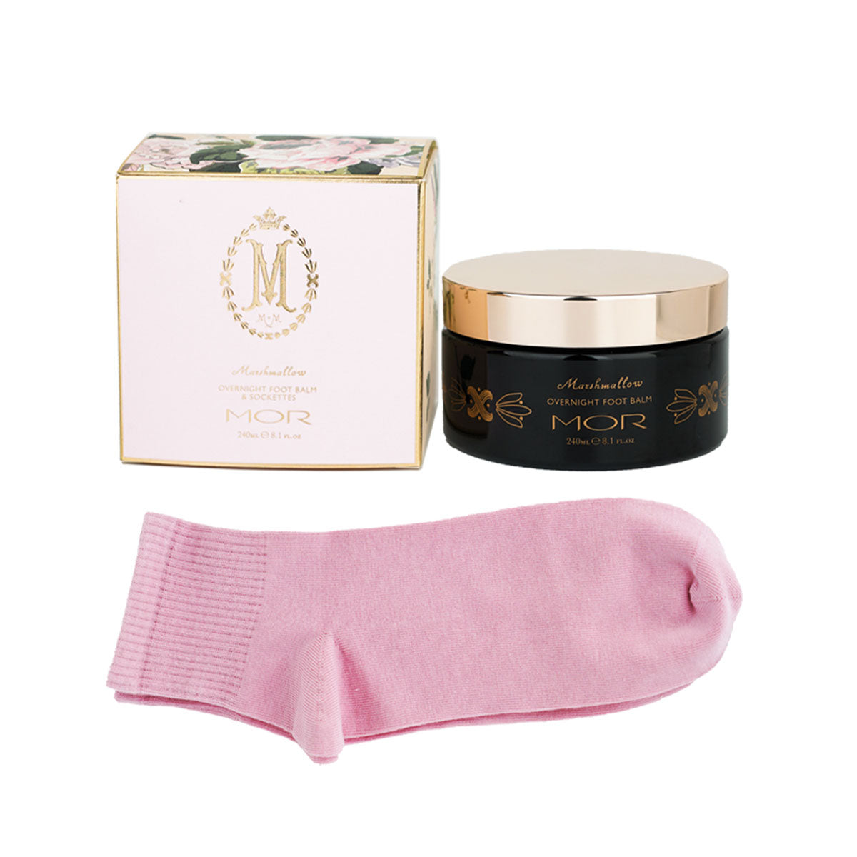 Massage all over feet from toes to ankles and apply the cotton blend Sockettes to enhance the effectiveness of the Balm. For best results use overnight to reveal softer and smoother looking skin, and for a at home spa experience, use after bathing in the Marshmallow Foaming Bath Soak.