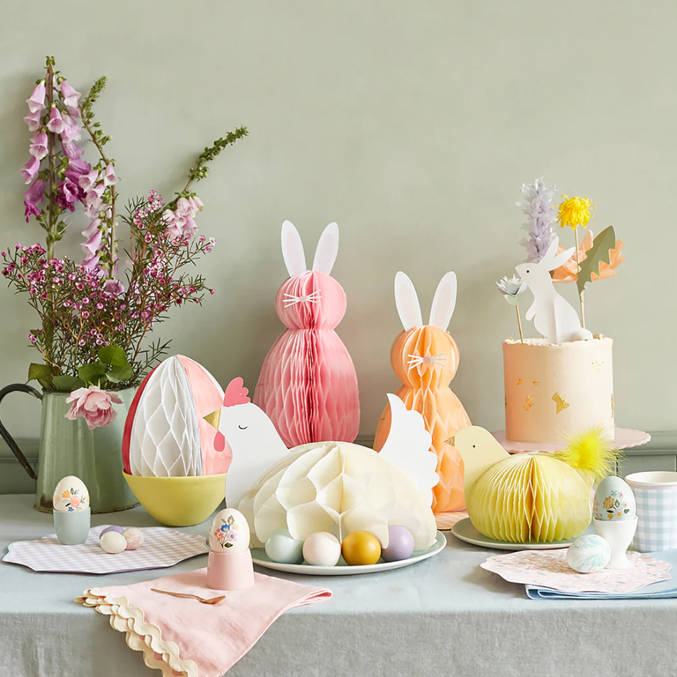 If you're looking for Easter decorations that are different to the norm, then you'll love this set. It features two bunnies, two striped eggs, a hen and a chick, with amazing paper tissue honeycomb details. They'll look sensational on your party table, or wherever you want statement decorations to impress your guests.