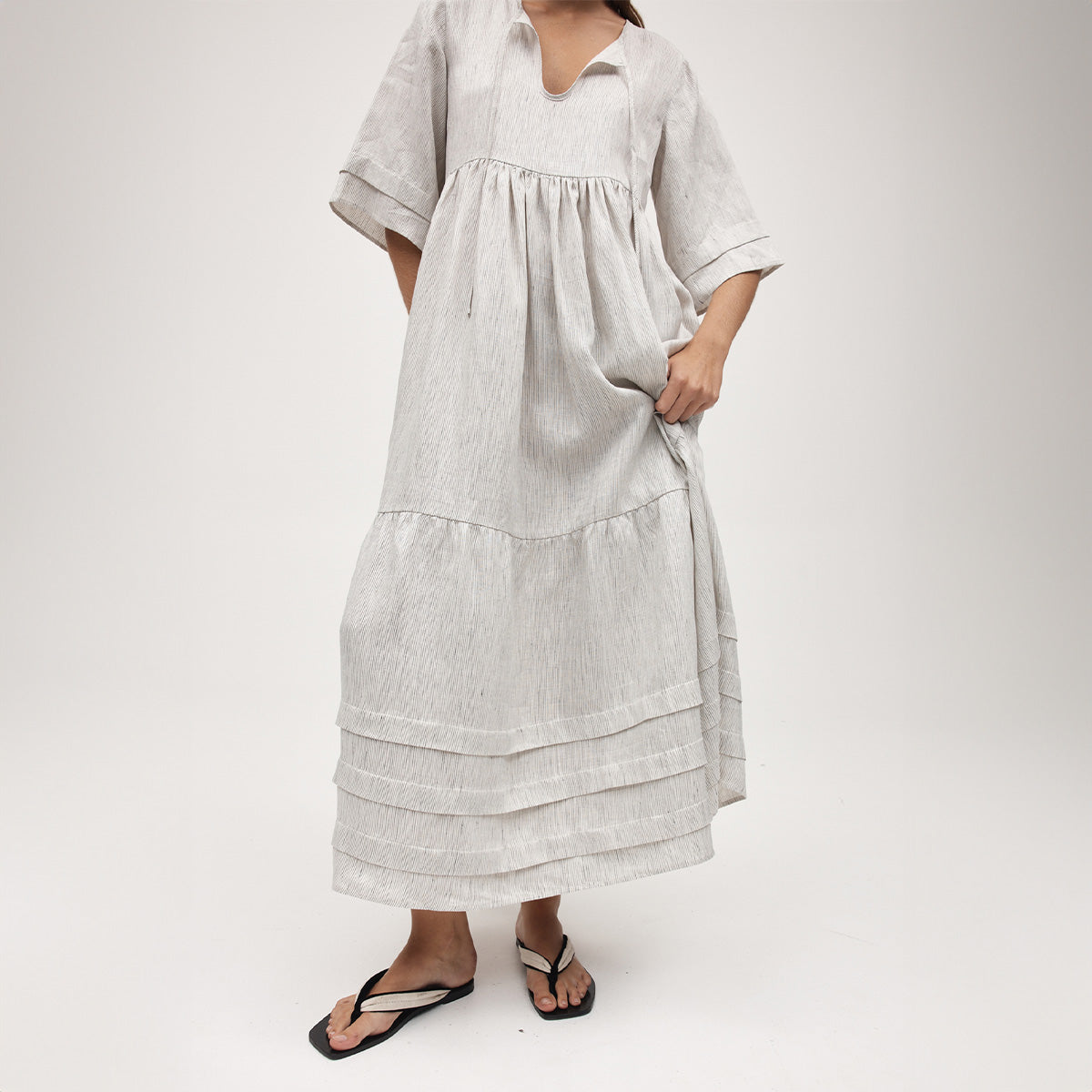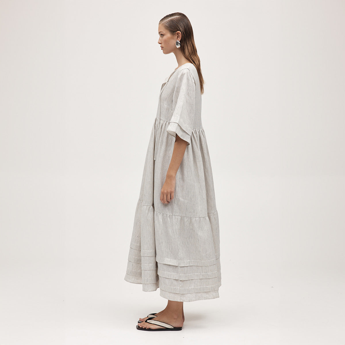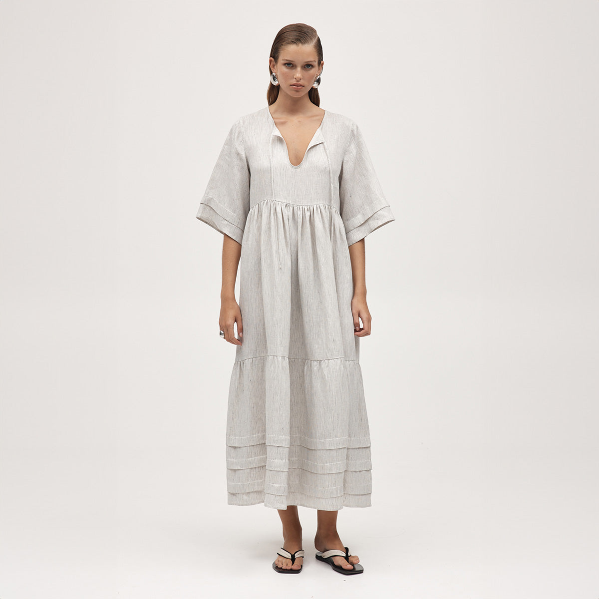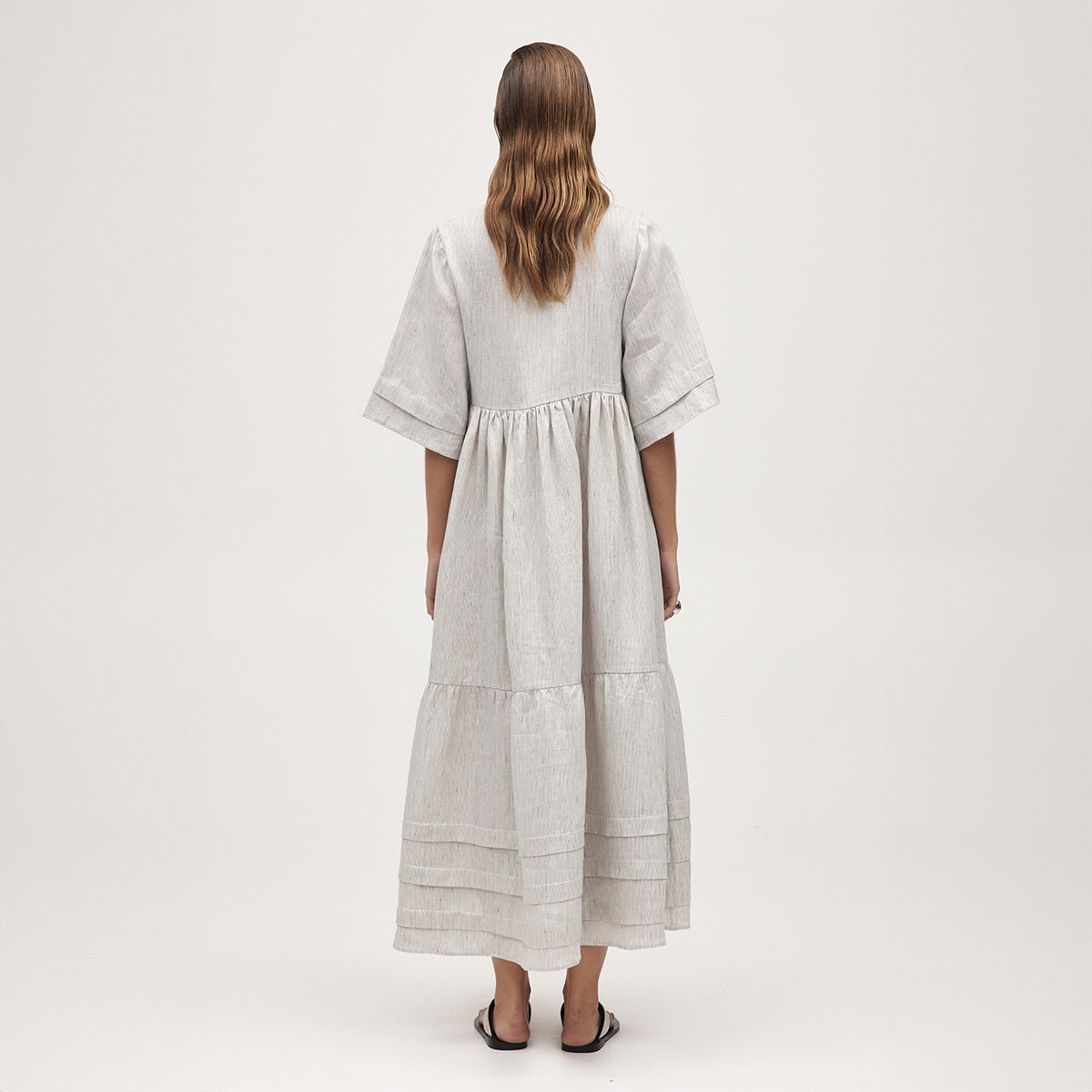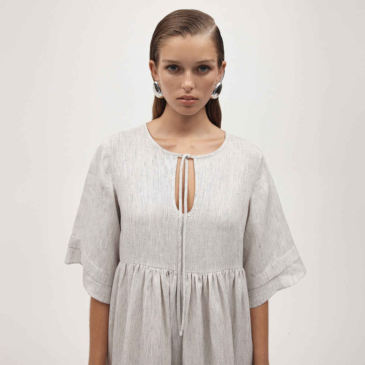 Built upon silhouettes from seasons past, the Nellie Dress is the perfect lightweight and relaxed dress for the summer months. This dress features a relaxed, A-line silhouette with a V-neckline and a keyhole tie closure. This dress has t-shirt sleeves and a gathered hem at the waist and mid leg that accentuates the silhouette. This dress is finished with four folds at the hem. This is a full-length dress, falling to the ankle. This version of the Nellie dress is crafted in a 100% linen cloth with a fine stripe.