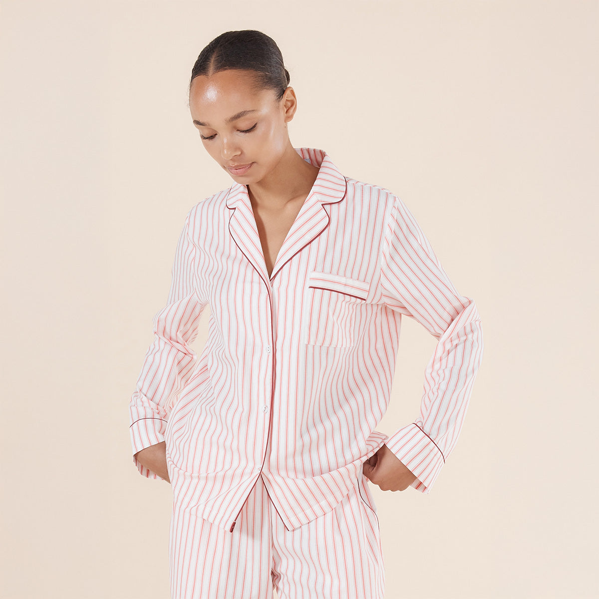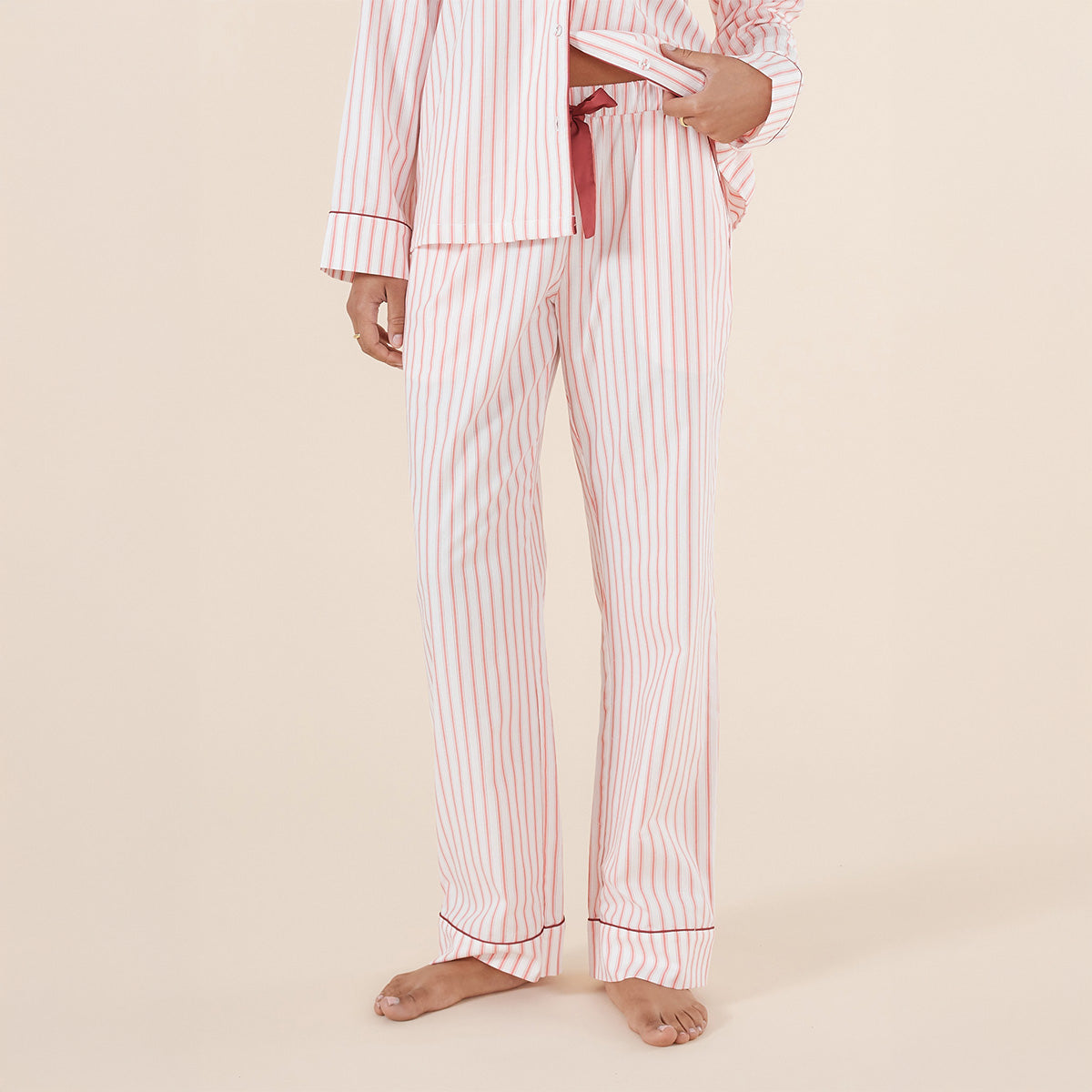A sleepwear essential with a classic, sporty edge, this 100% cotton pyjama set in white and pink stripes is a timeless addition to any wardrobe. Designed with bold contrast burgundy piping, this set features a button-through long-sleeve top with a chest pocket, paired with wide-leg trousers detailed with a hem finish and contrast piping. The elasticated waistband with an adjustable tie ensures the perfect relaxed fit for sleeping and lounging in.