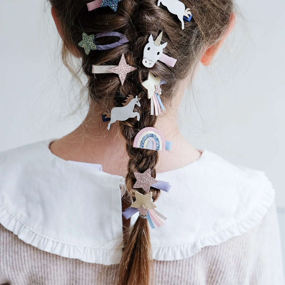 We just love this cheerful little pack of clips! Two radiant rainbows in a brilliant blast of colours plus two shooting stars with a colourful trail of grosgrain ribbon!