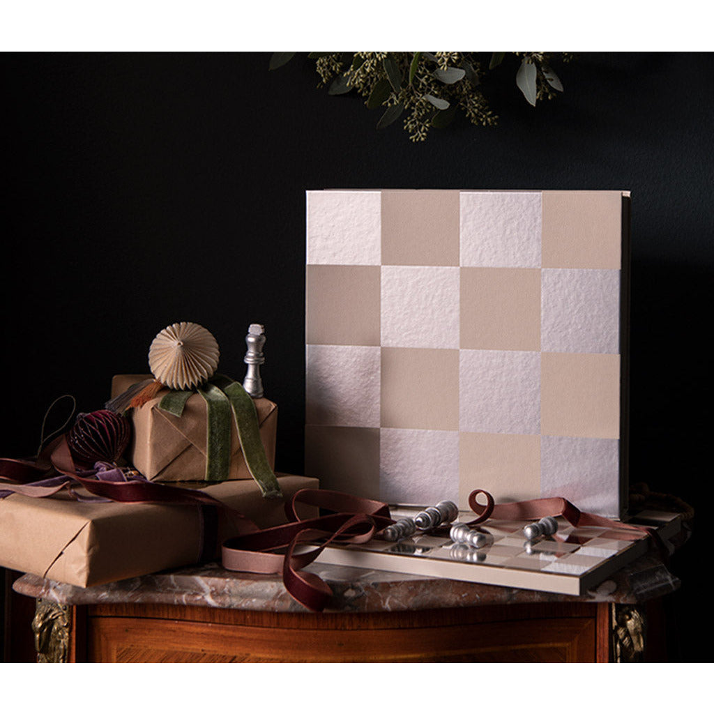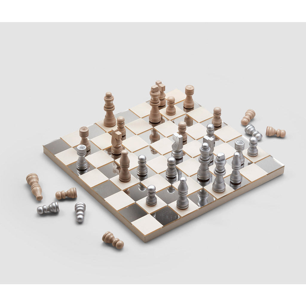 A beautiful special edition and larger variant of our Classic Chess now in a spectacular mirror design. The pieces and board are made of wood and a thin layer of mirrored acrylic is mounted on the board’s surface giving the pieces an effective reflection. The box is made of high quality art paper and has the construction and open up as a book, which means it also fits perfectly lined up together with your art books in a shelf. The cover is printed with a checkered silver foil mimicking the mirror effect.