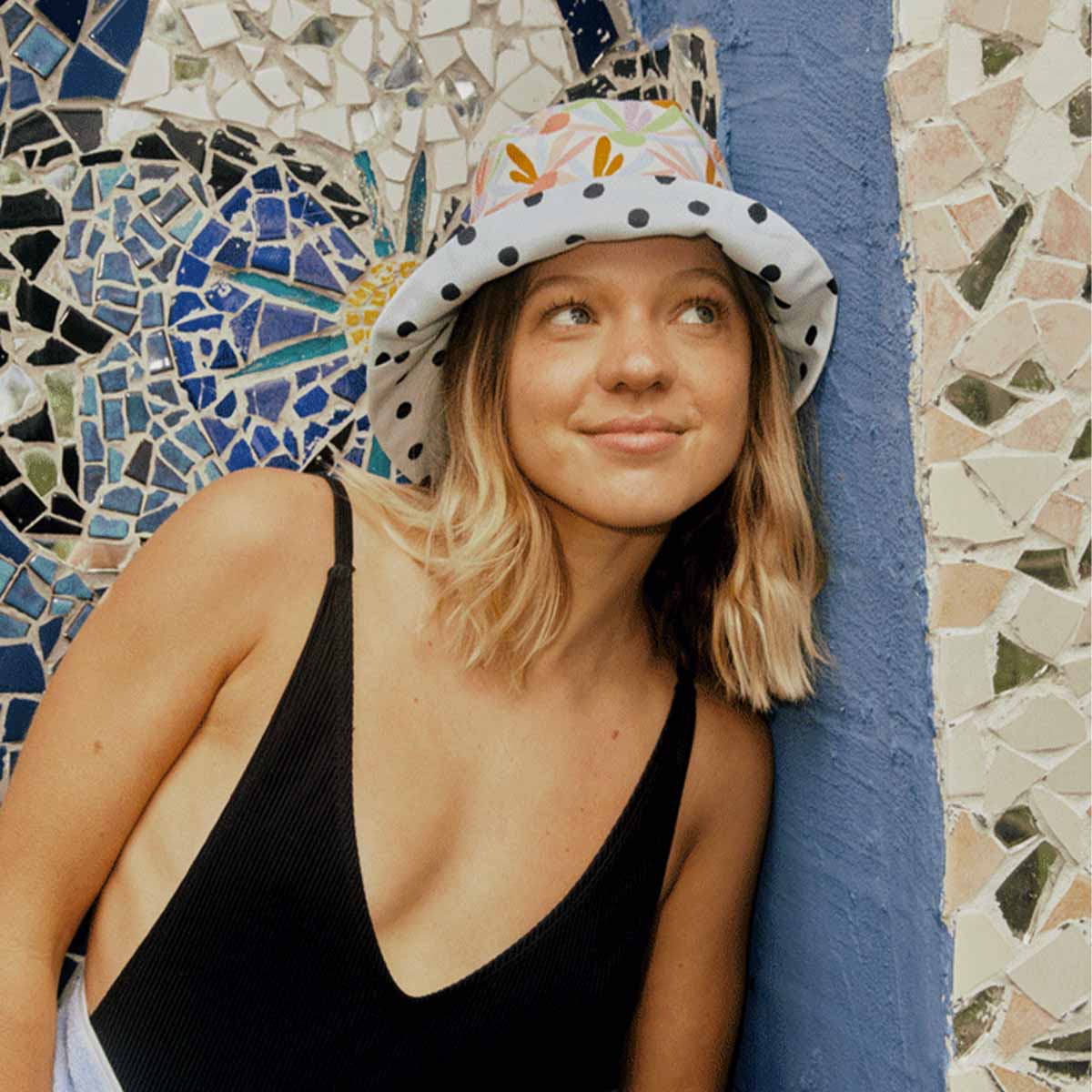 Be sunsmart and stylish with the Reversible bucket hat in Dot/Fleur. This hat features a sky blue dot print on one side and an abstract floral on the reverse. Designed to be fully reversible, switch up your style depending on your mood.