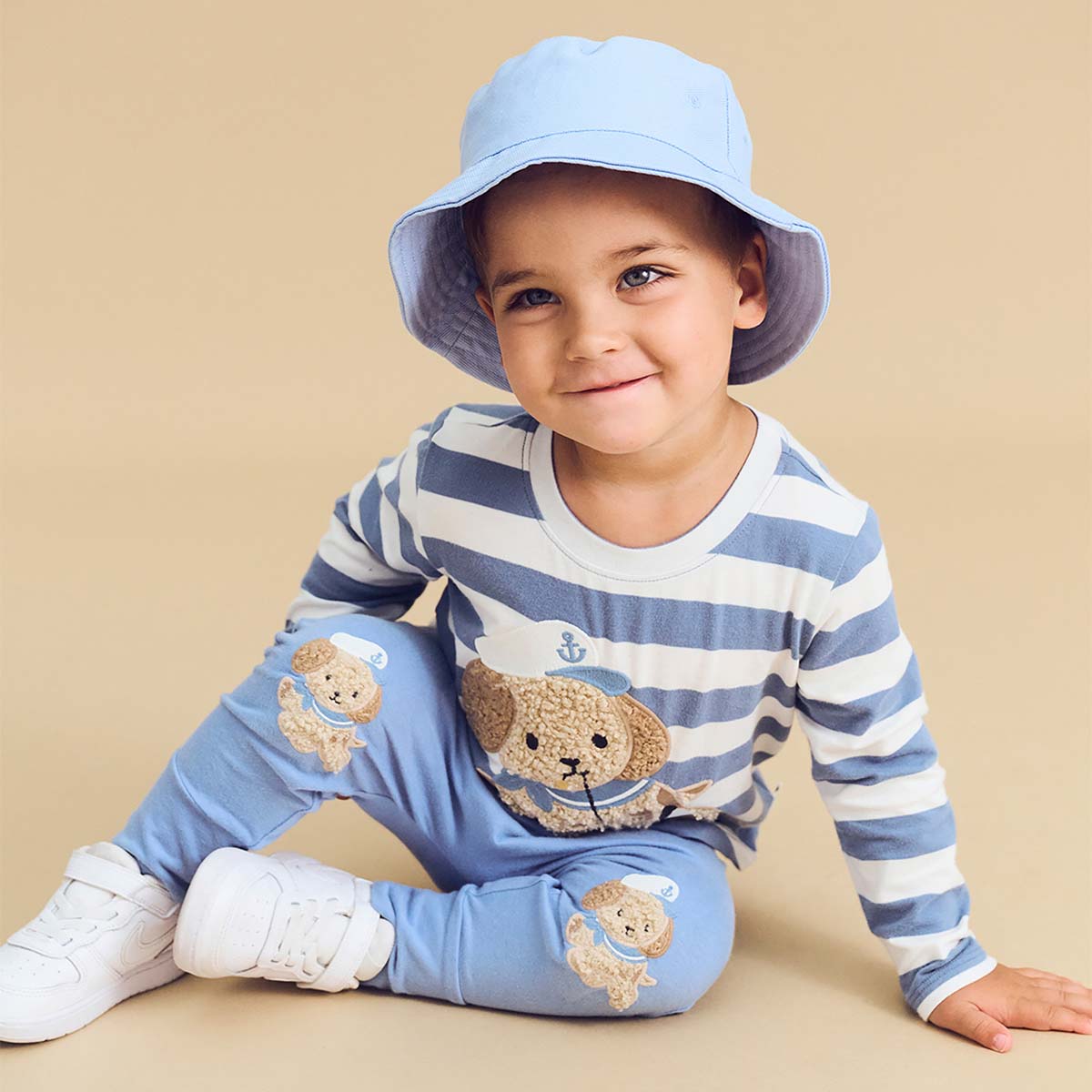 - super soft, premium organic cotton fleece drop crotch pant with sailor applique on knees