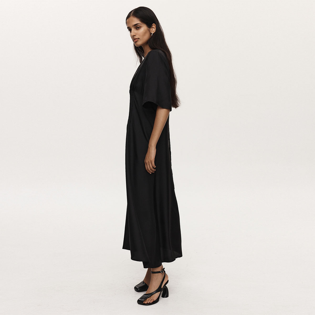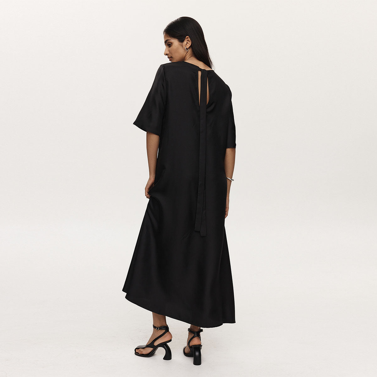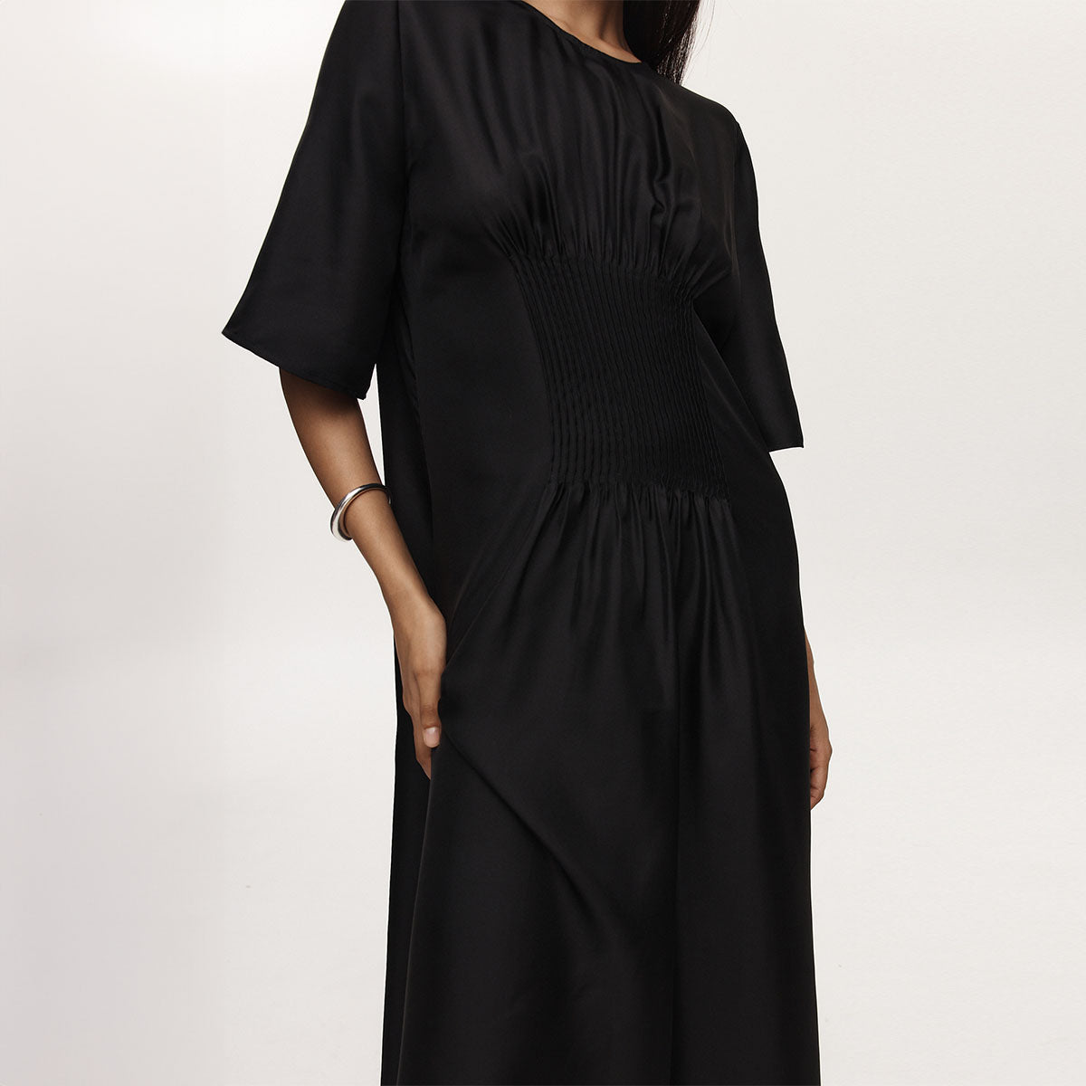 The Savannah Dress is crafted in a lightweight 100% silk cloth. This dress has a high round neckline with elongated t-shirt sleeves that fall to the elbow. At the centre of this dress, there is a panel of vertical tucks that create a gathered detail through the top and bottom, before falling into a subtle A-line shape through the skirt. This dress also features a keyhole detail at the back, secured with a tie at the back of the neck.