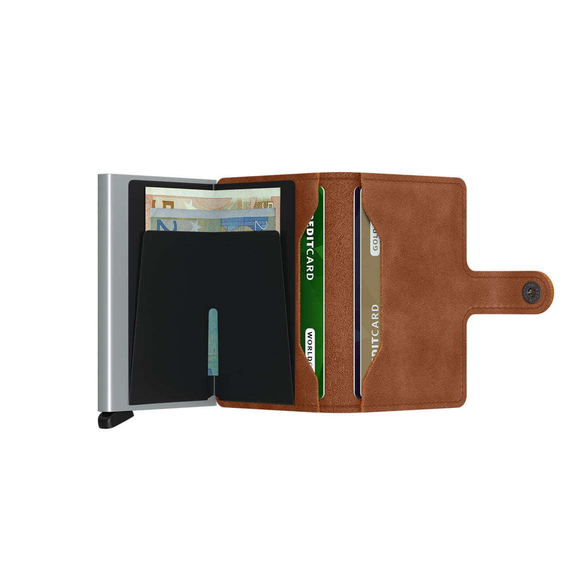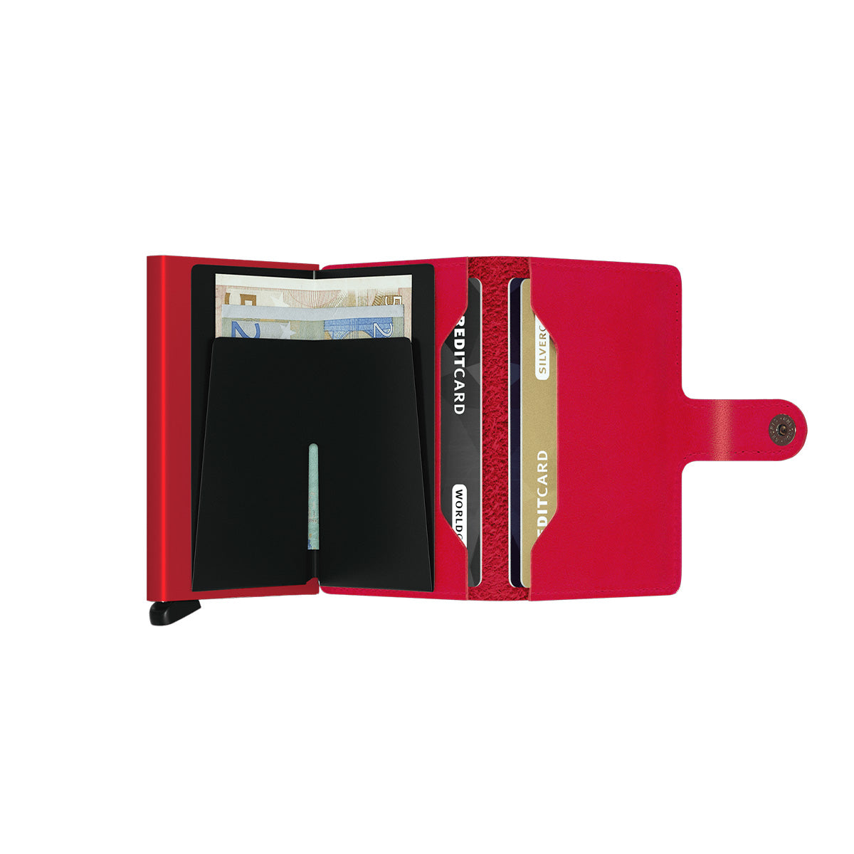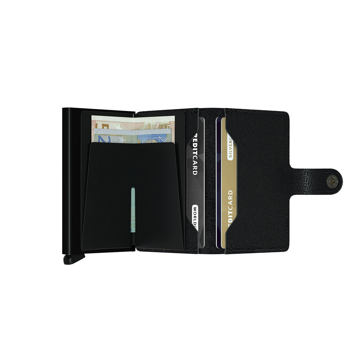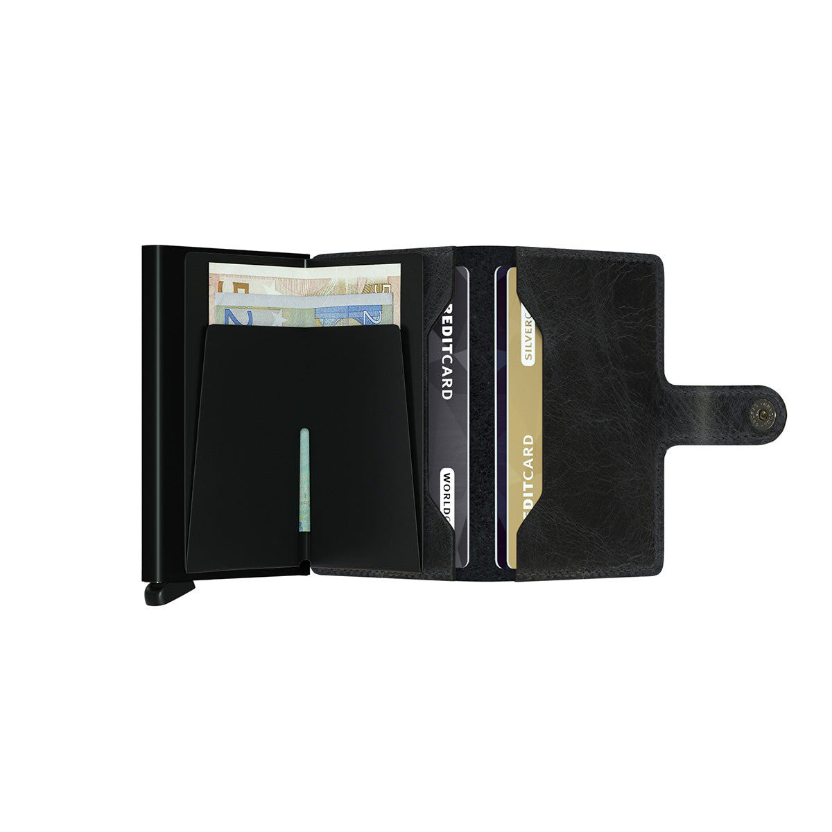 Small in size and surprisingly large in storage capacity, the Miniwallet combines the best of both worlds. The exterior holds banknotes, receipt and cards, while the aluminium Cardprotector allows you to slide out cards with one simple motion and protects them from bending, breaking and unwanted wireless communication.
