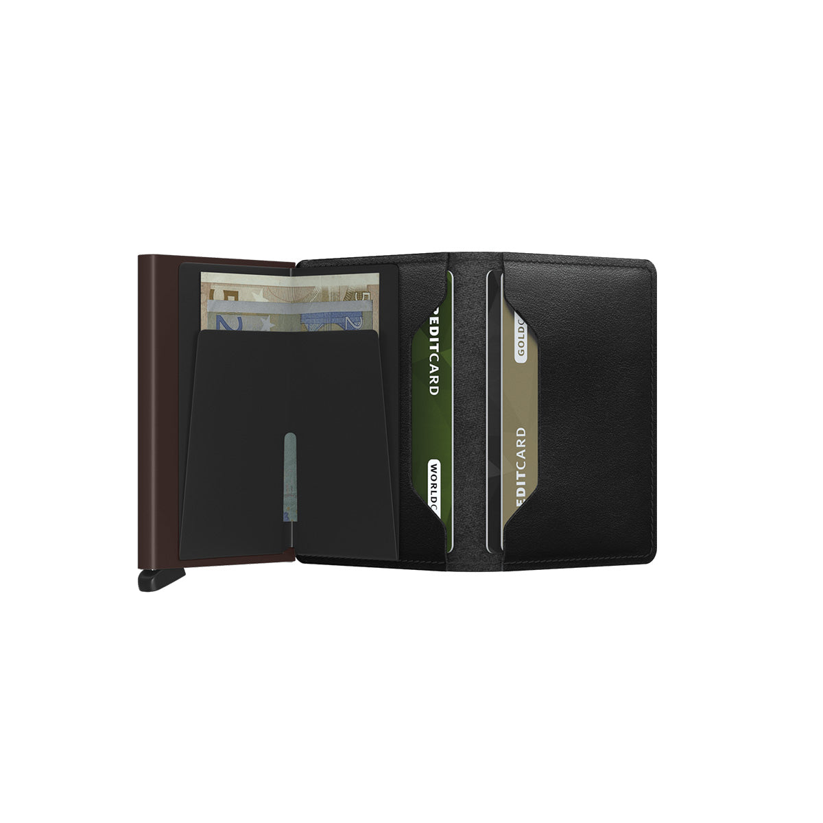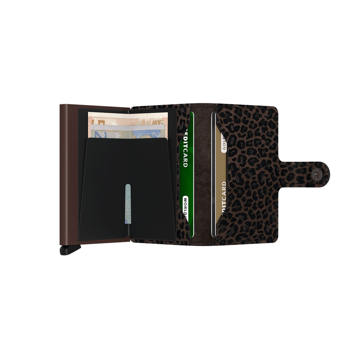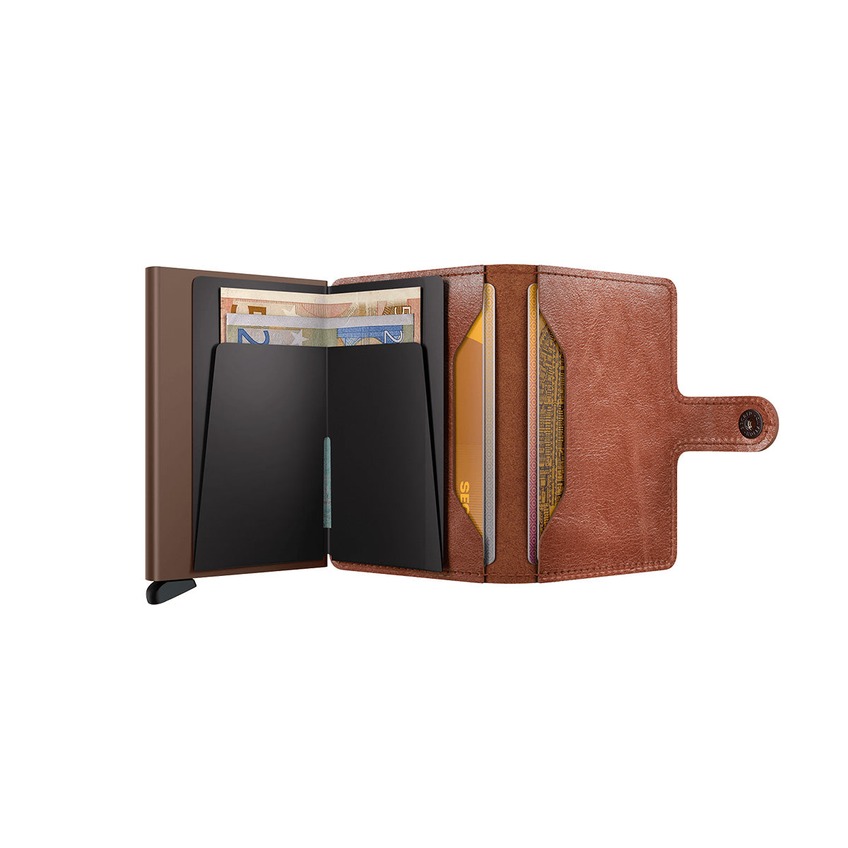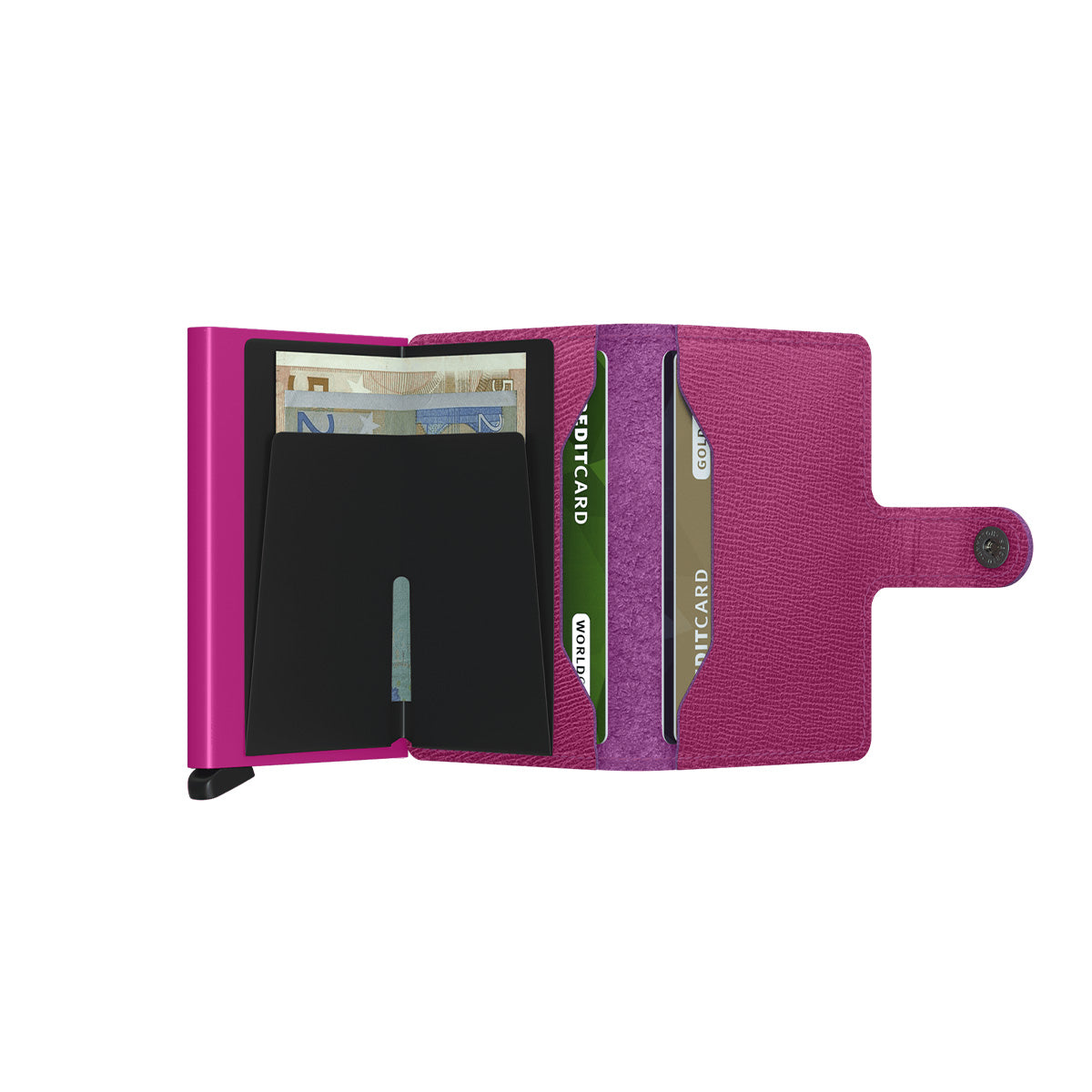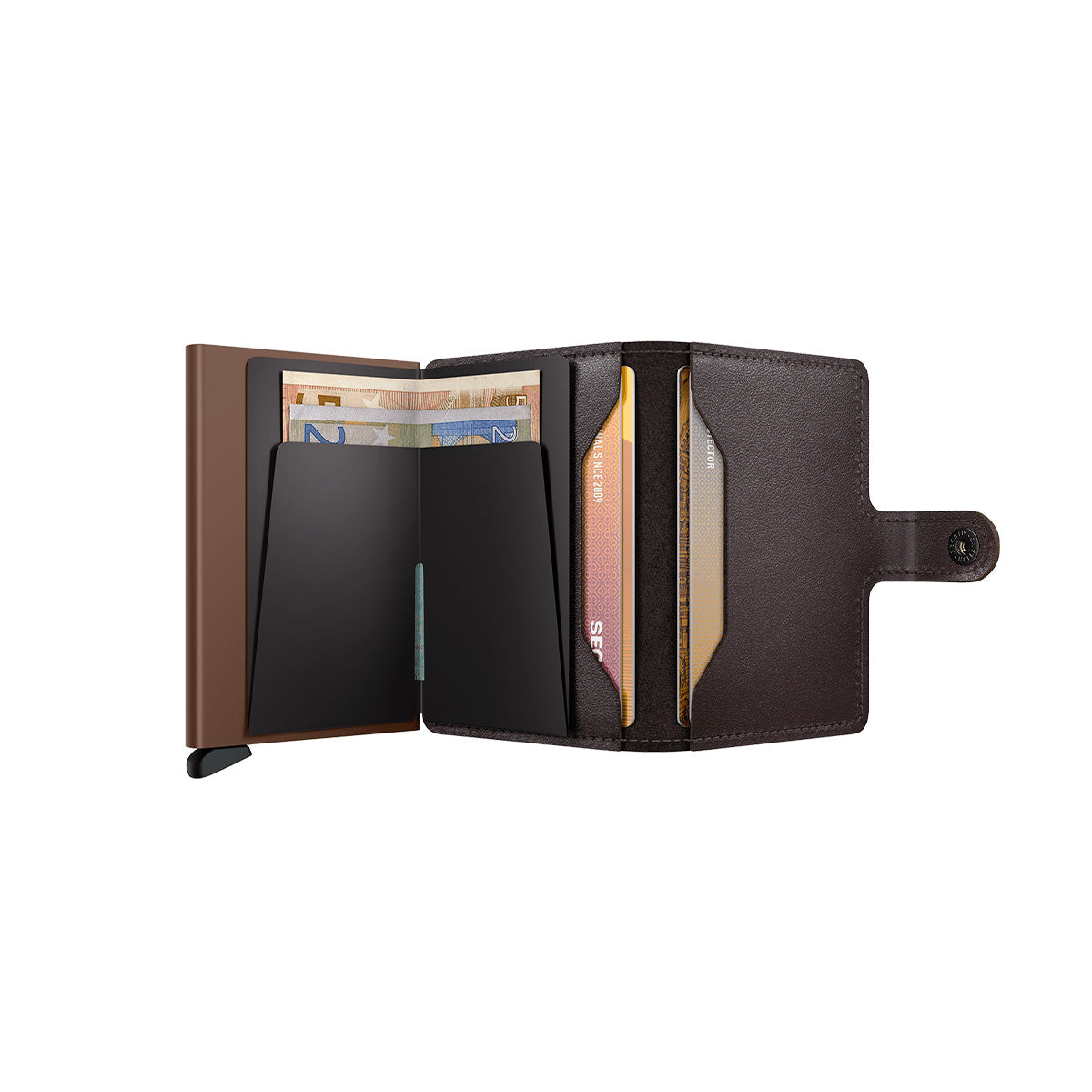 Small in size and surprisingly large in storage capacity, the Miniwallet combines the best of both worlds. The exterior holds banknotes, receipt and cards, while the aluminium Cardprotector allows you to slide out cards with one simple motion and protects them from bending, breaking and unwanted wireless communication.