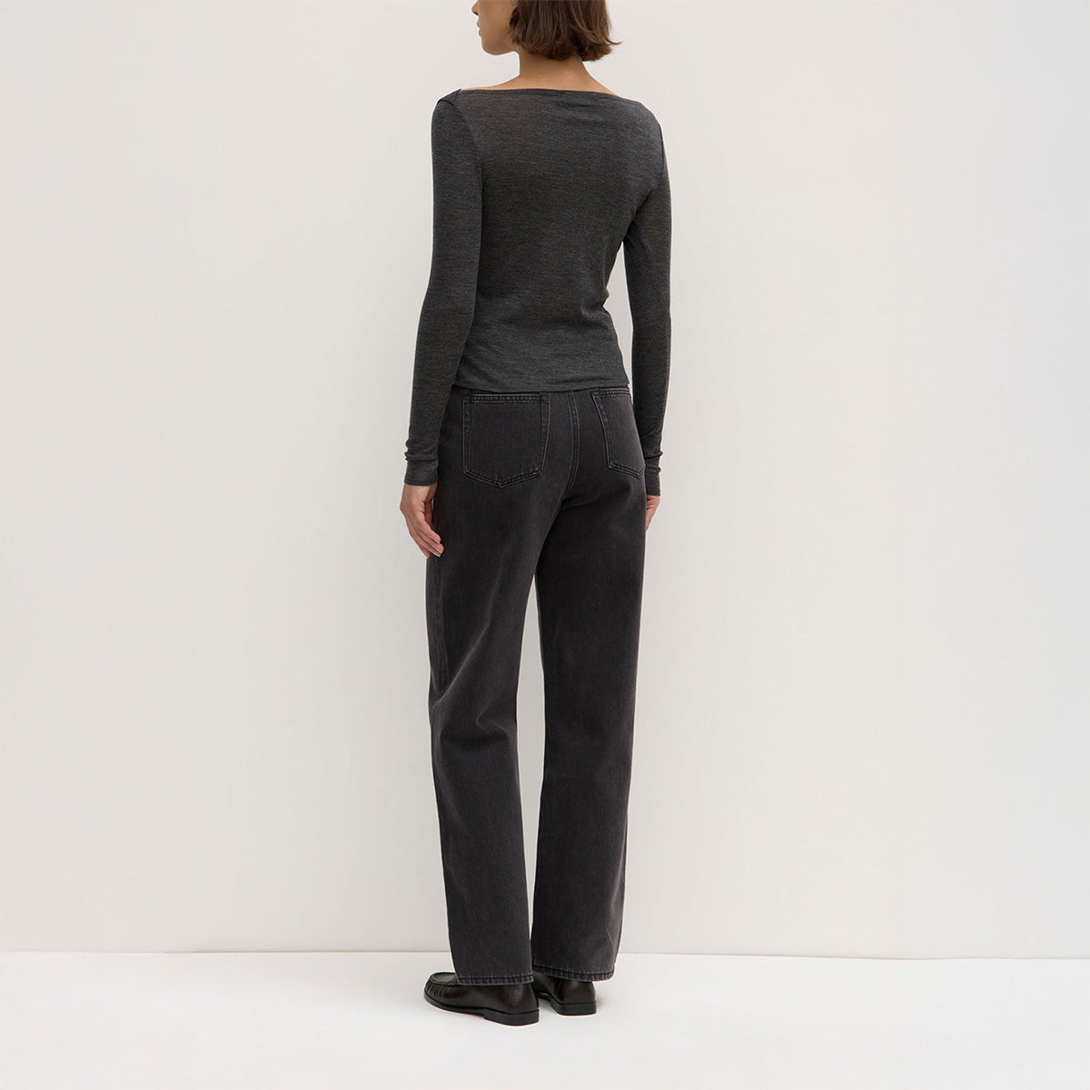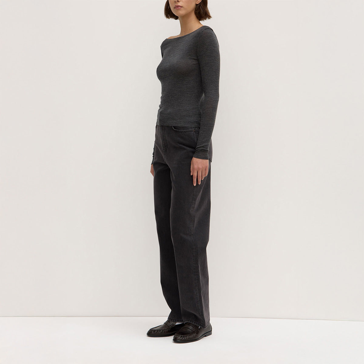 Slimline long sleeved wool top featuring a wide boat-shaped neckline with overlap shoulder detail.